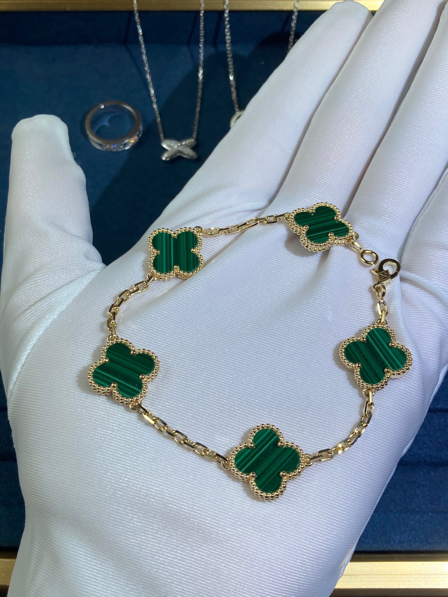 Five-Flower Malachite Clover Bracelet, Yellow Gold