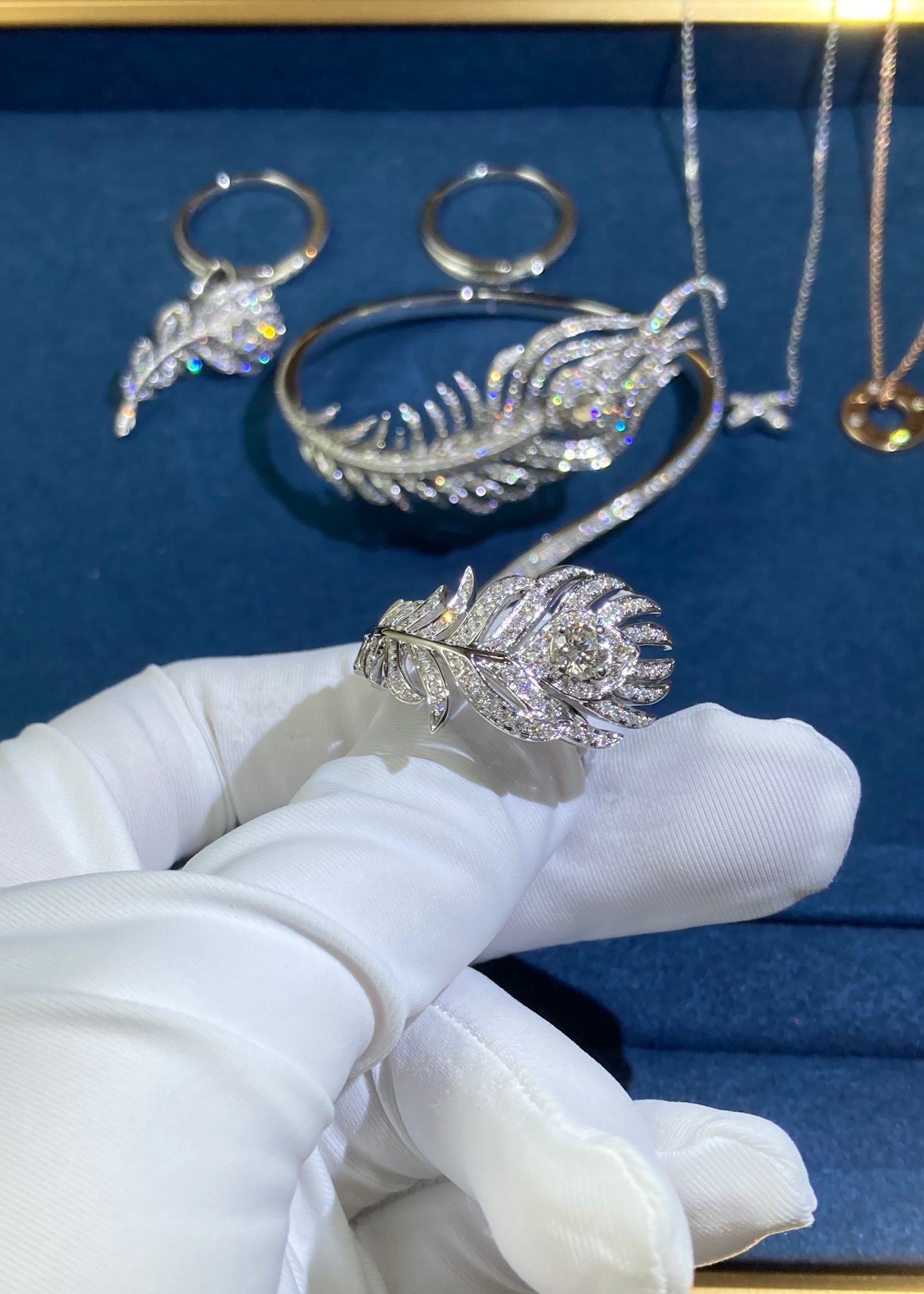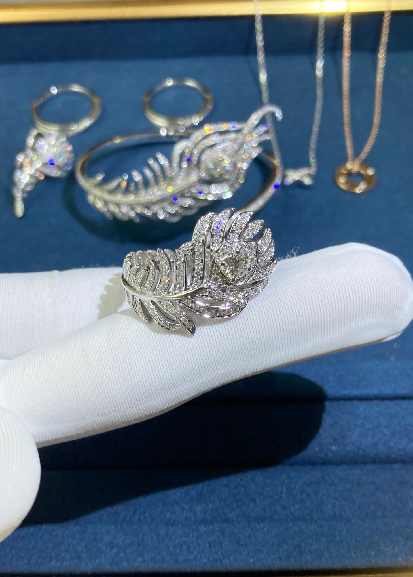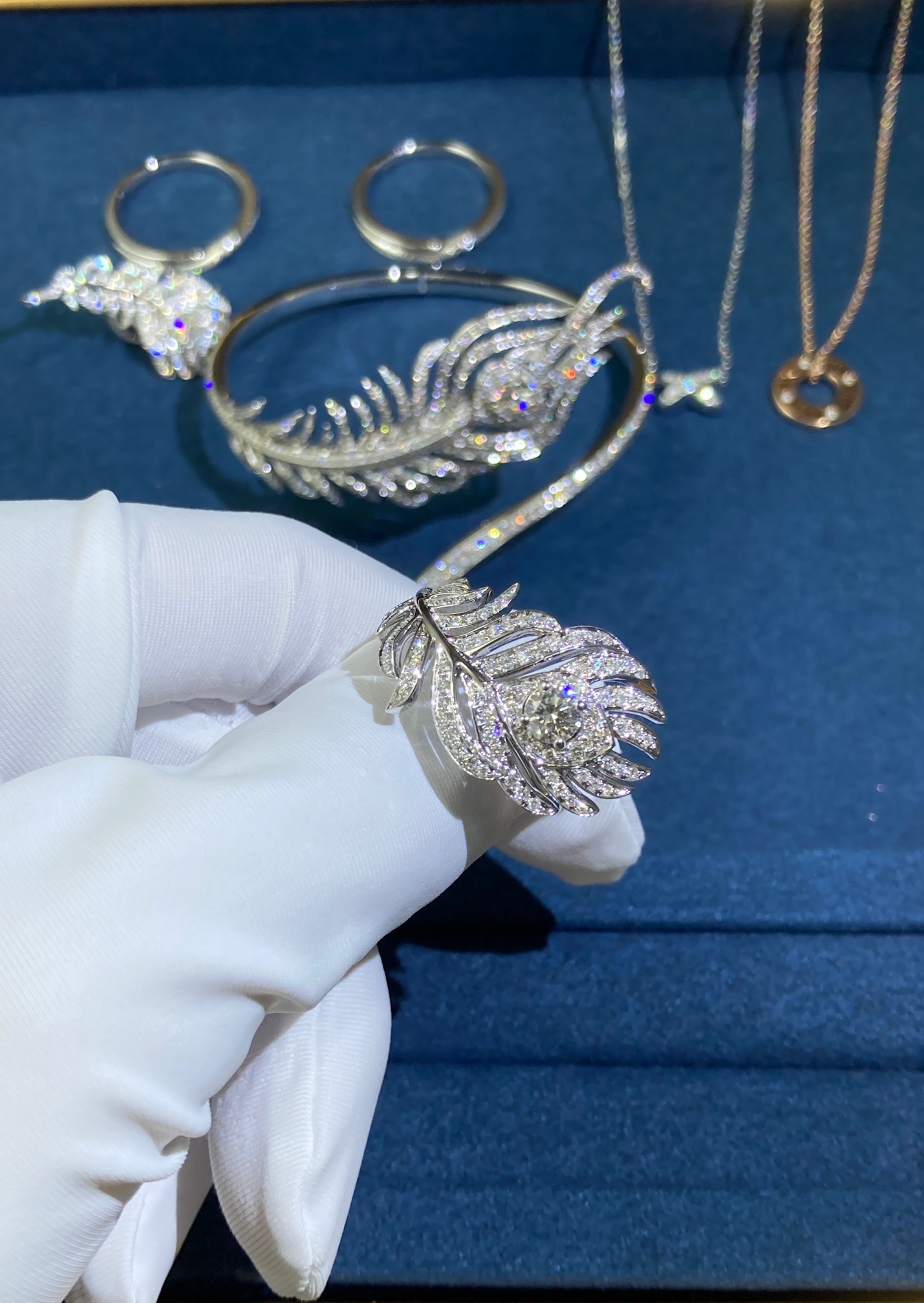 The metal used in pieces of jewelry are often a lustrous yellow or white gold, which is expertly polished to a mirror-like finish. The precious stones are carefully selected by our masters and set in a precise manner, showing off their color, clarity, and brilliance to their full potential.