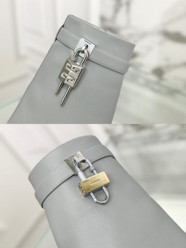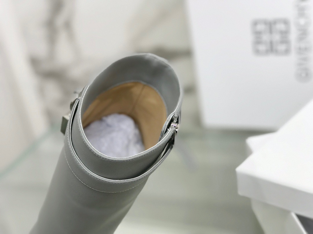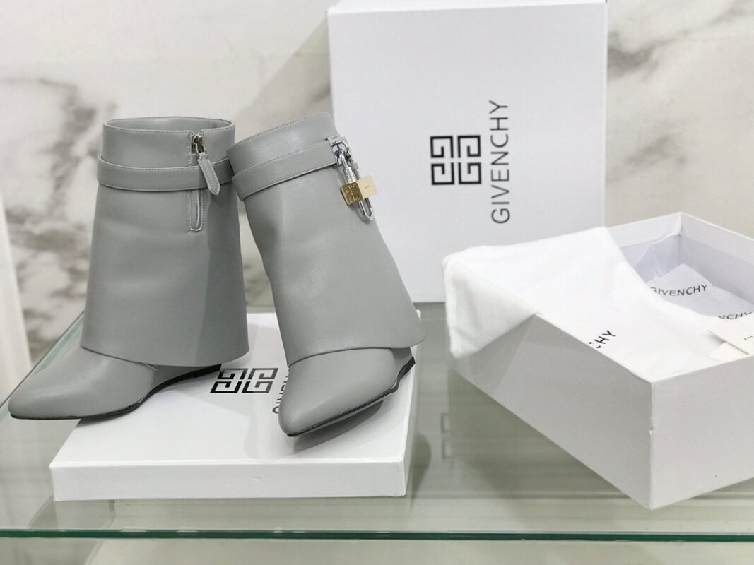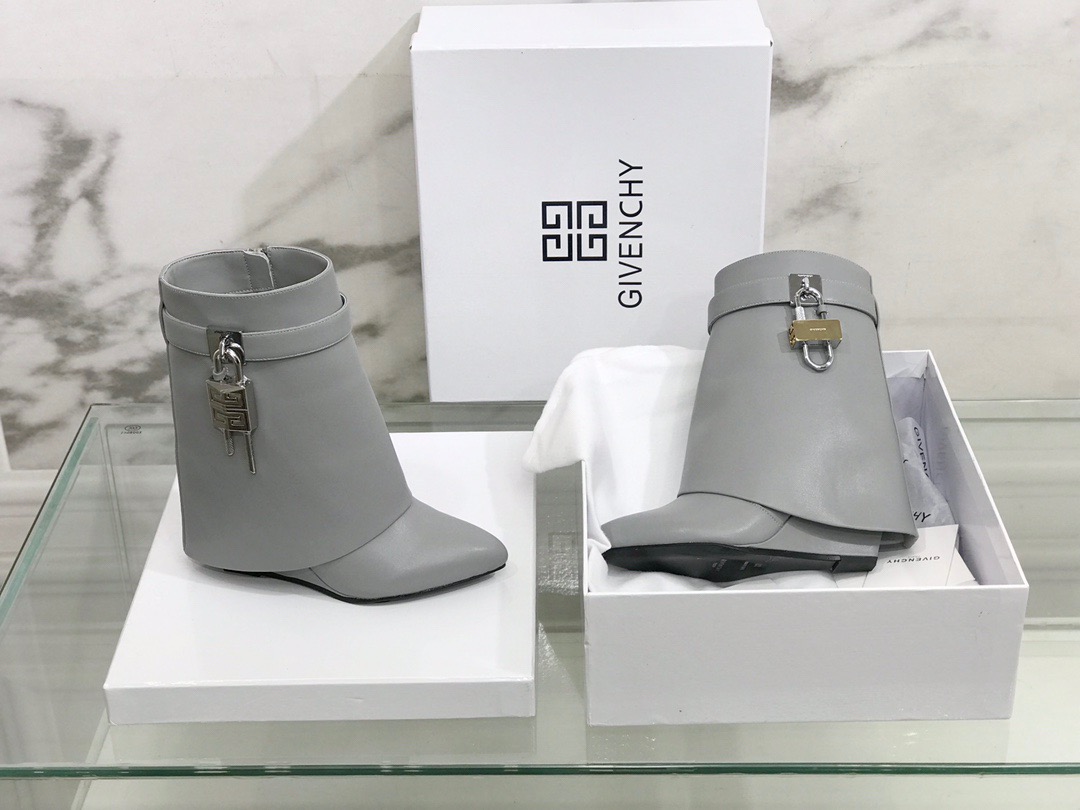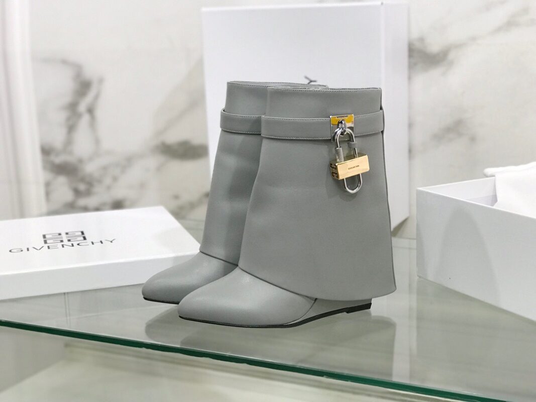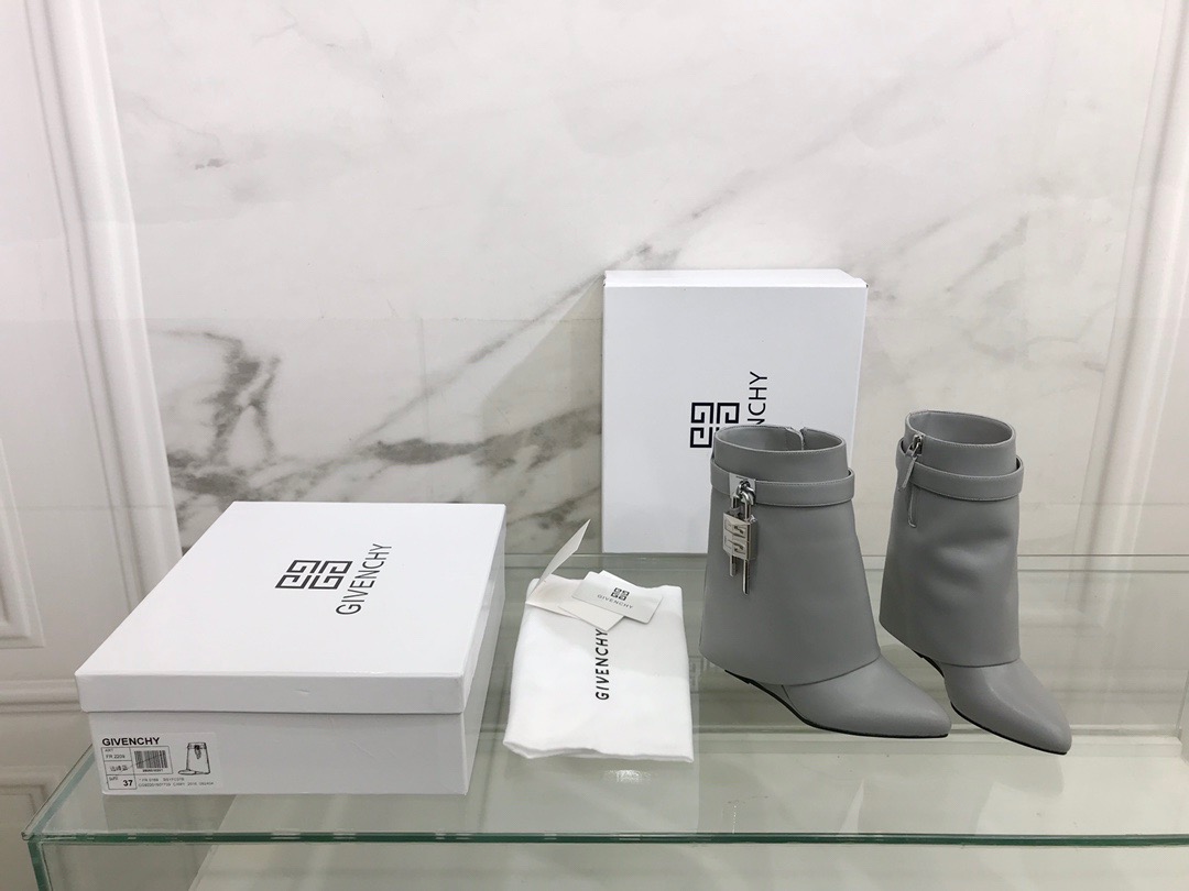 GIVENCHY new fashion ankle boots shiny leather boots Original 1:1 development, leather straps on the legs, leather zipper pulls on the inside with metal buckles, silver and gold finish asymmetric 4G LOGO metal padlocks on the sides, almond toe, covered slope With 9.5cm Material: Cow Leather, Lining: Sheep Leather Sizes: 35-39 (40 can be customized and non-refundable)