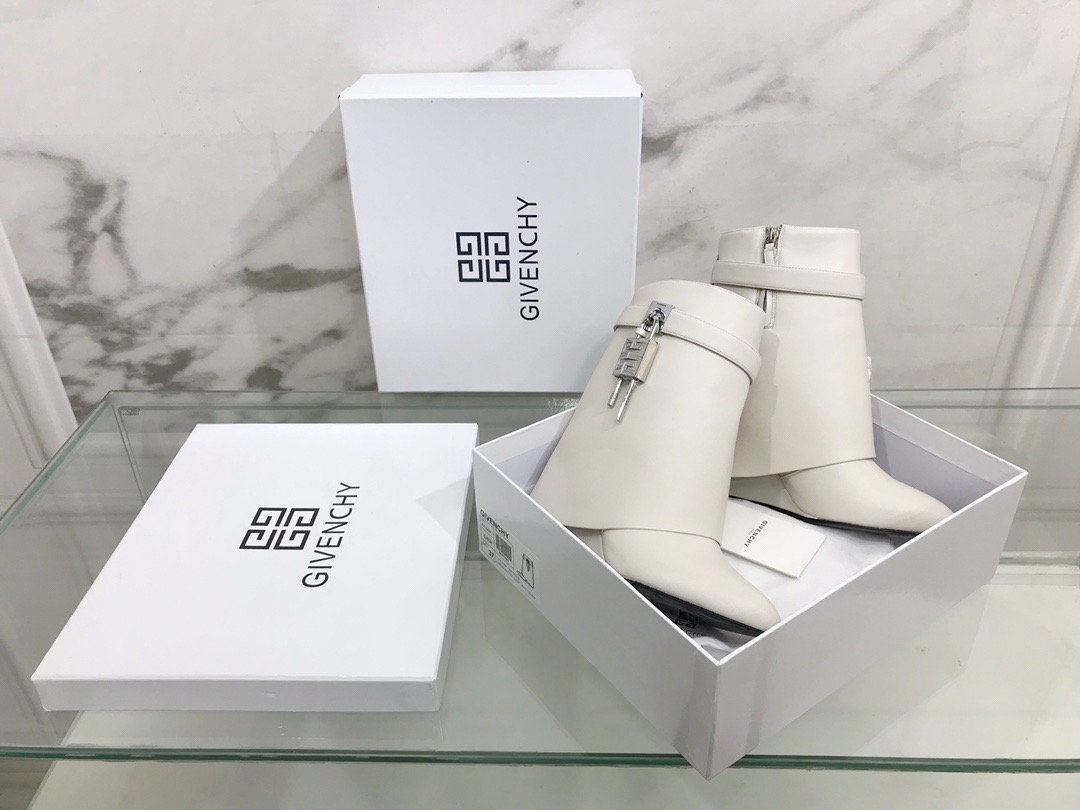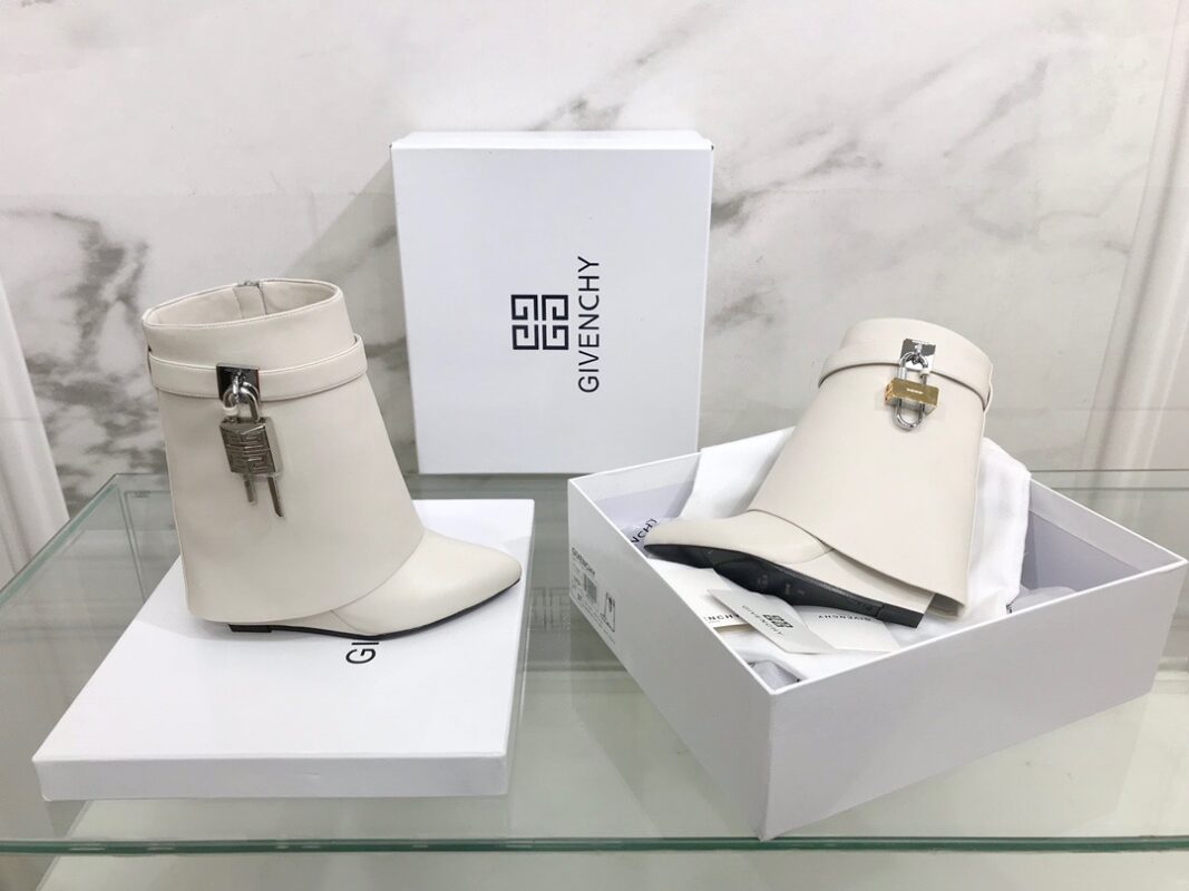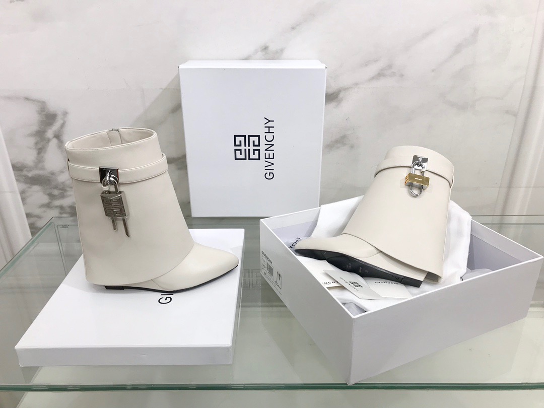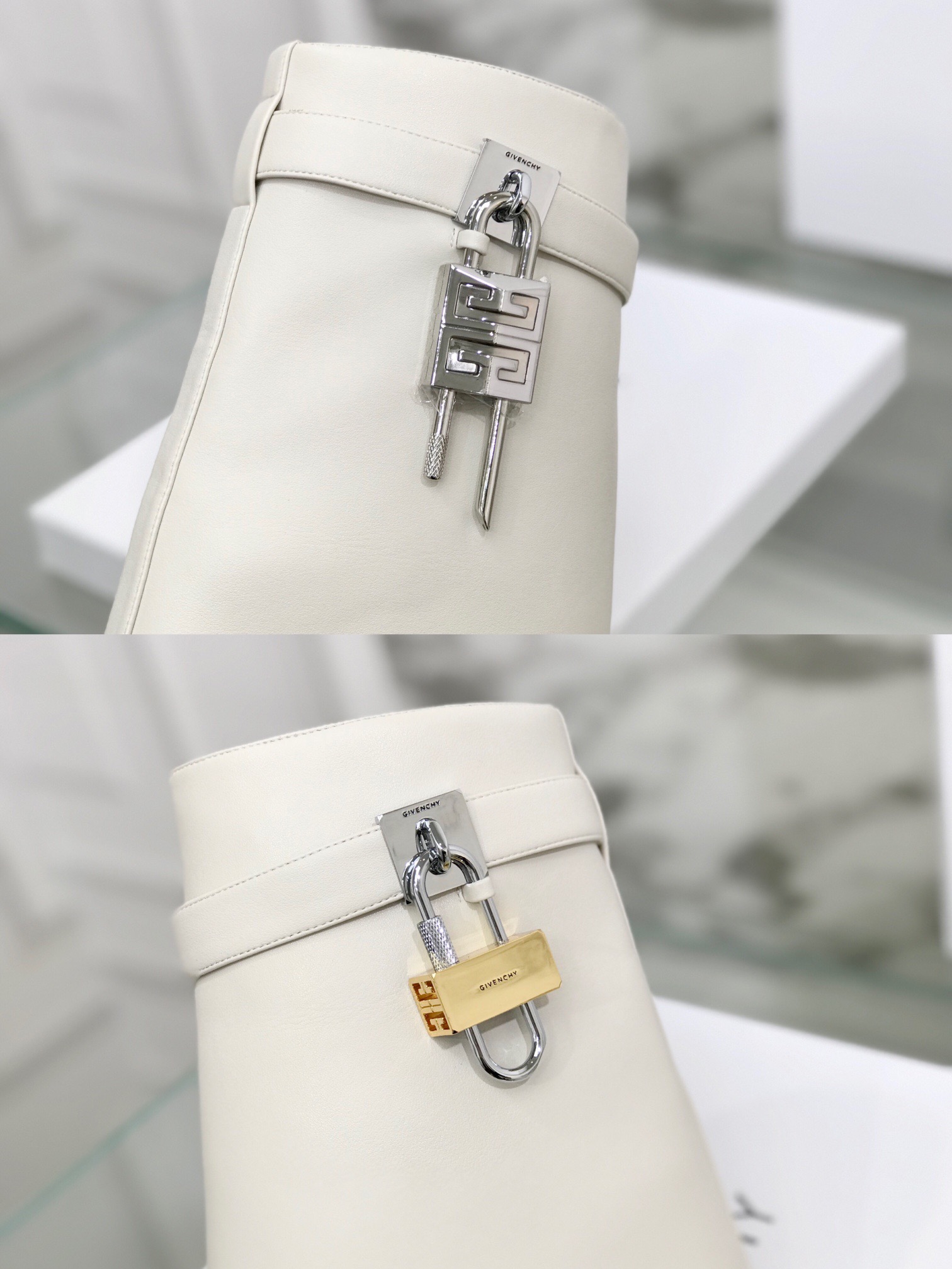 GIVENCHY new fashion ankle boots shiny leather boots Original 1:1 development, leather straps on the legs, leather zipper pulls on the inside with metal buckles, silver and gold finish asymmetric 4G LOGO metal padlocks on the sides, almond toe, covered slope With 9.5cm Material: Cow Leather, Lining: Sheep Leather Sizes: 35-39 (40 can be customized and non-refundable)