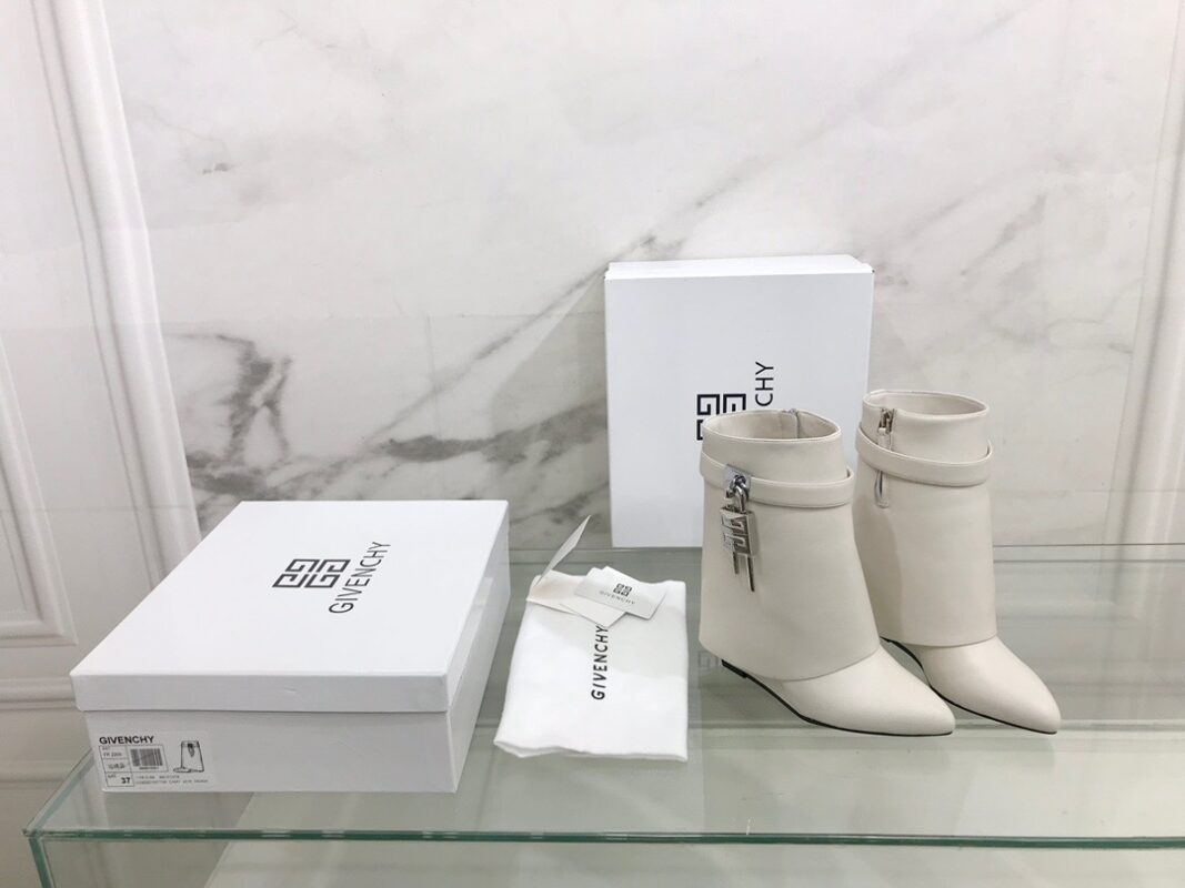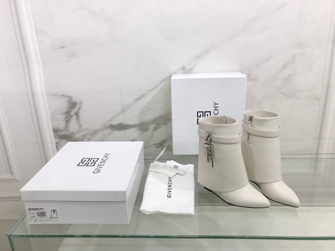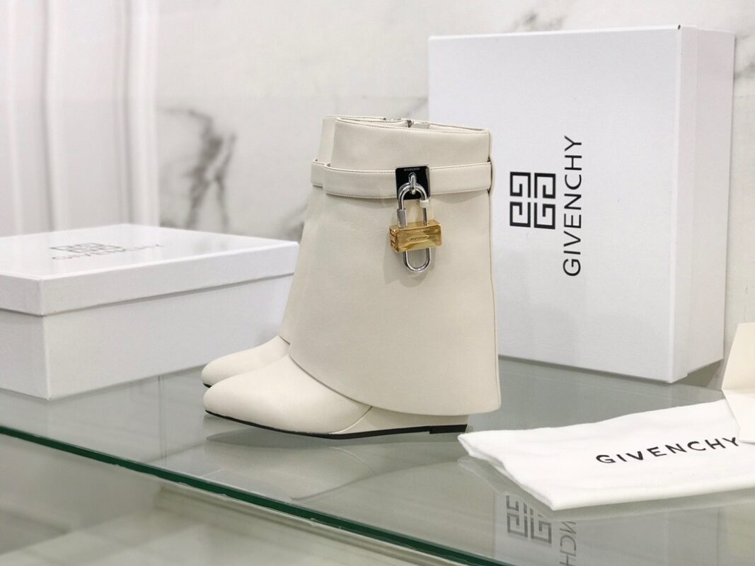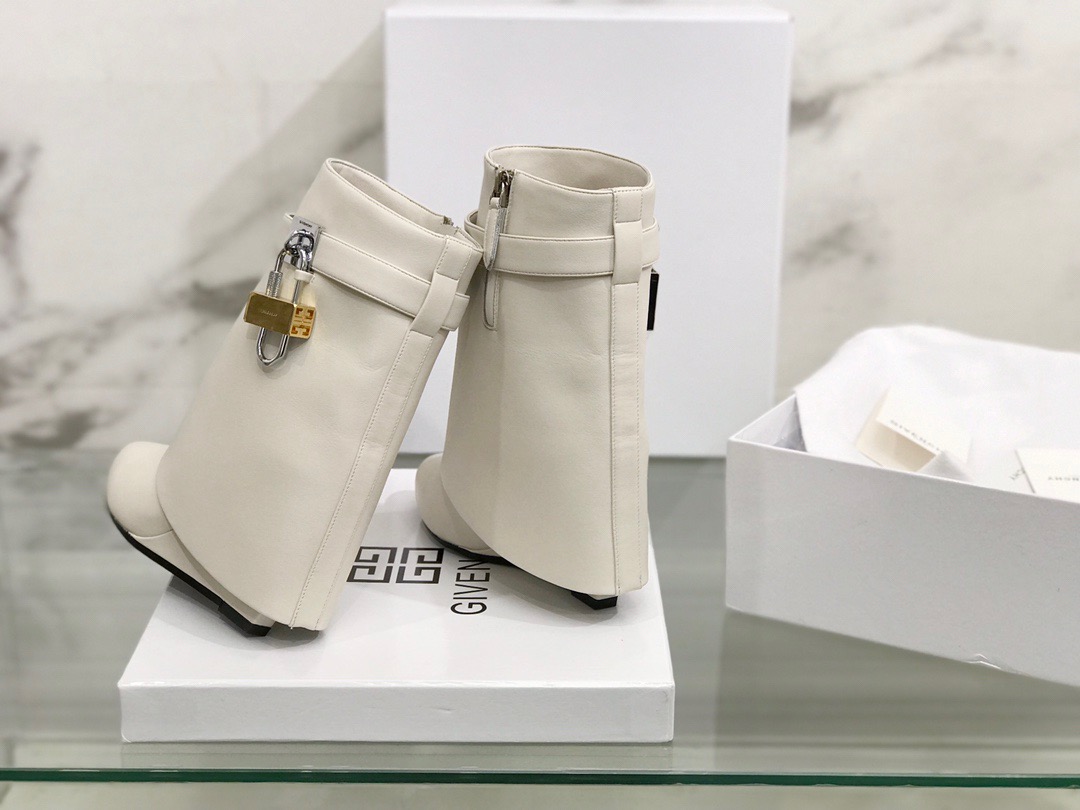 GIVENCHY new fashion ankle boots shiny leather boots Original 1:1 development, leather straps on the legs, leather zipper pulls on the inside with metal buckles, silver and gold finish asymmetric 4G LOGO metal padlocks on the sides, almond toe, covered slope With 9.5cm Material: Cow Leather, Lining: Sheep Leather Sizes: 35-39 (40 can be customized and non-refundable)