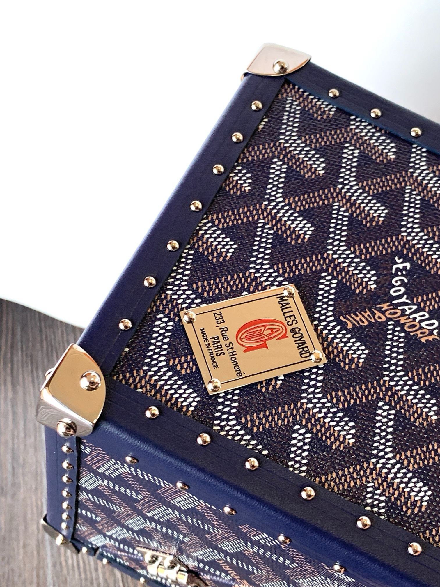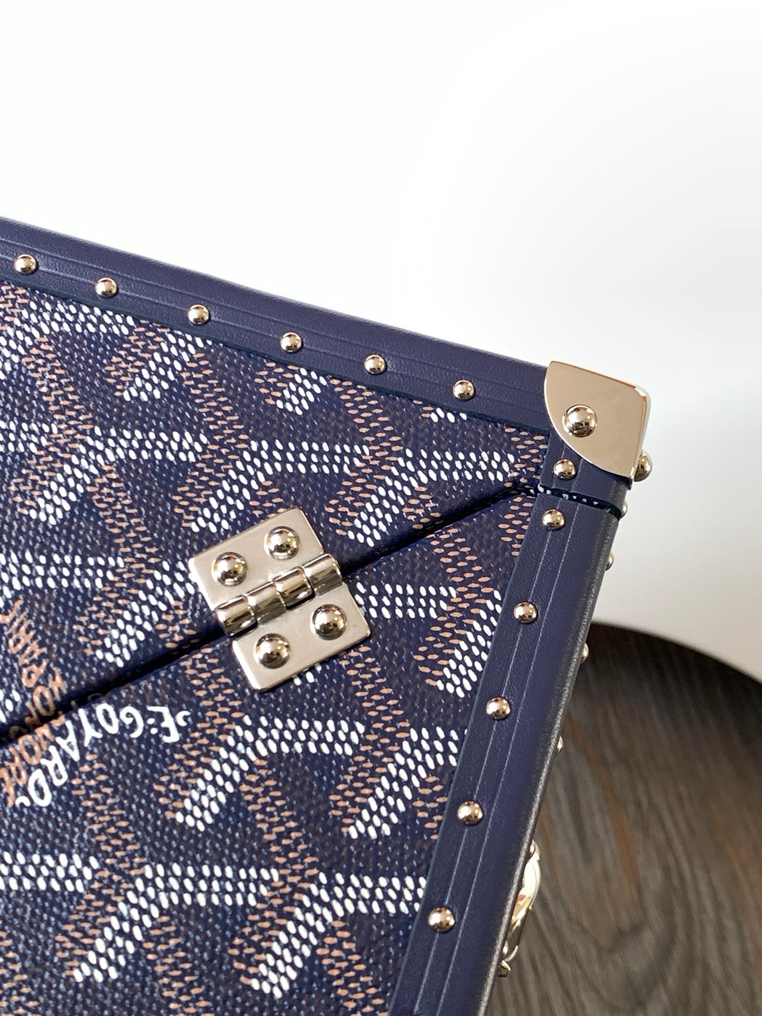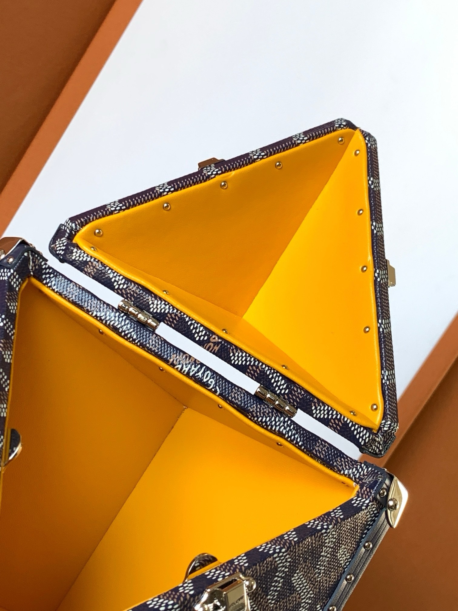 DE bags are named for their cubic shape. When carried, the DE bags’ leather LOZINES form a Y shape, paying homage to the iconic Y pattern of our GOYARDINE canvas.
