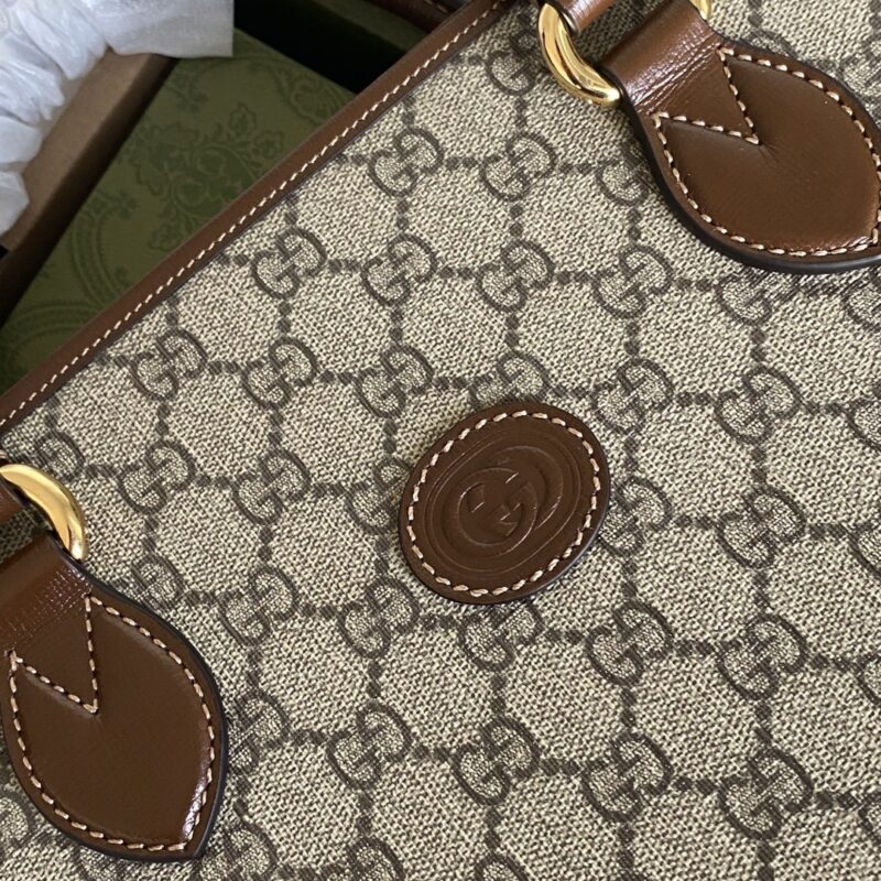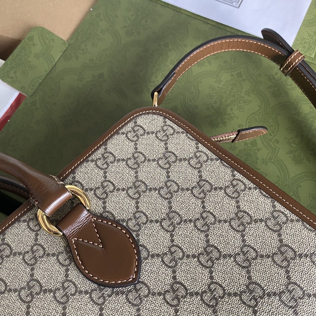 Structured large tote satchel in GG Supreme canvas with brown leather trim and dual carry options on the top handle and shoulder strap.