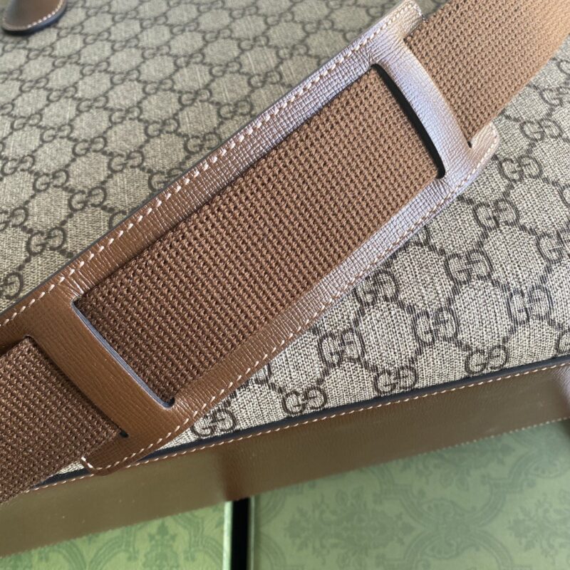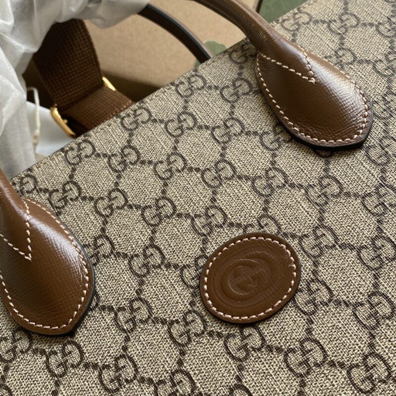 Structured oversized tote bag in GG Supreme canvas with brown leather trim and dual carry options by the top handle and shoulder strap.
