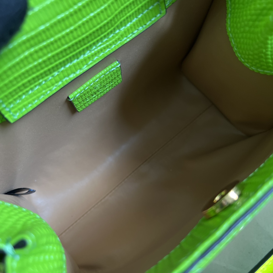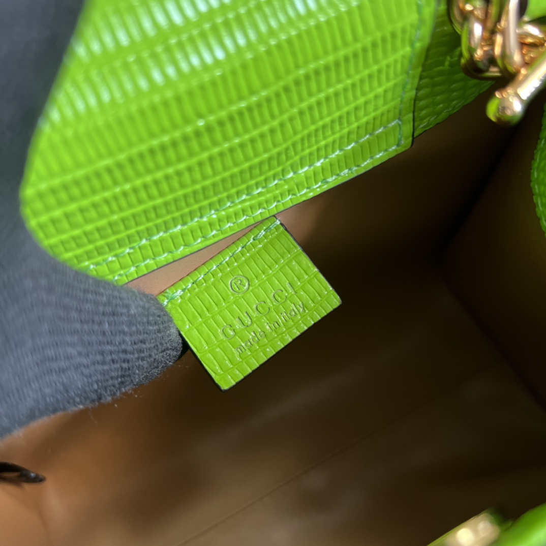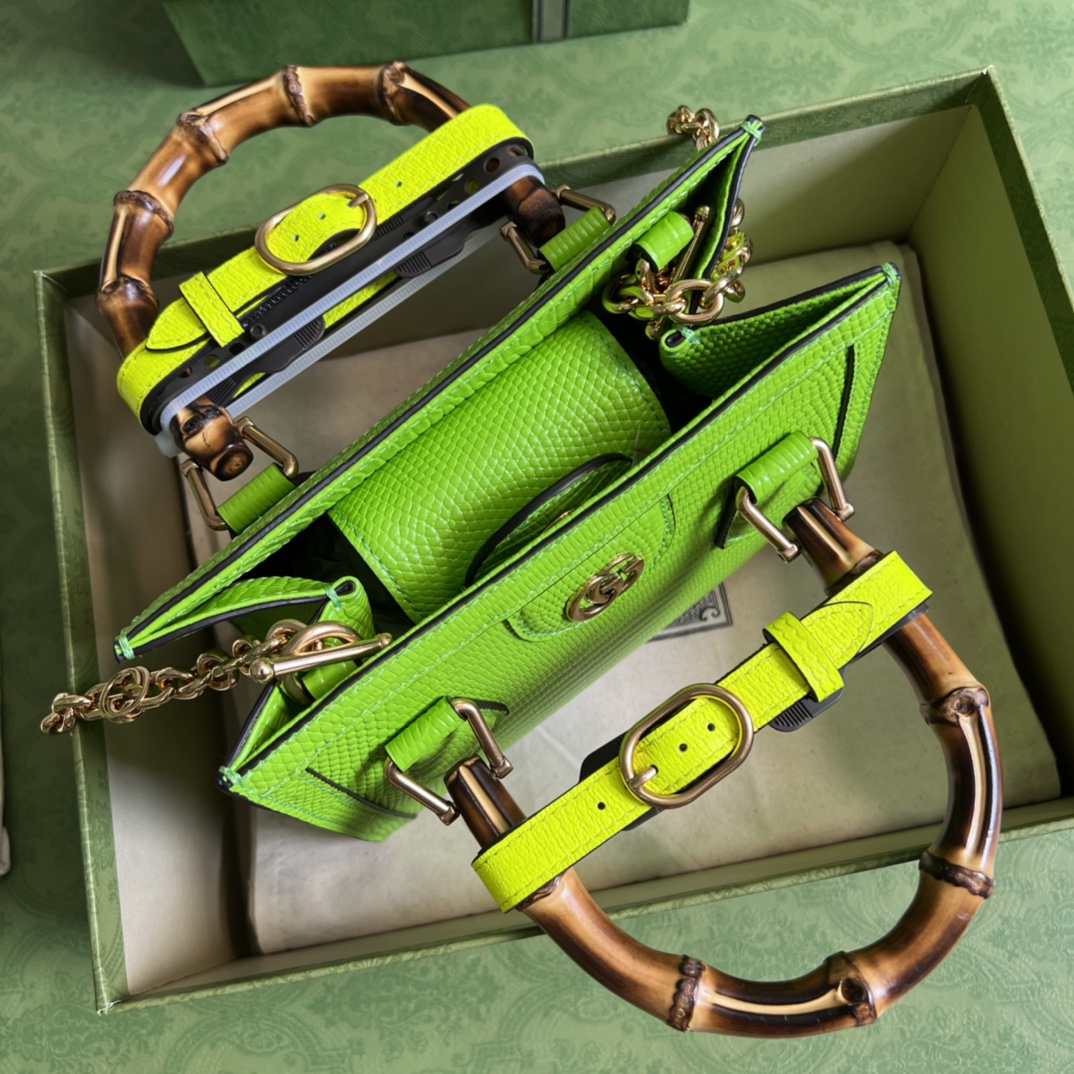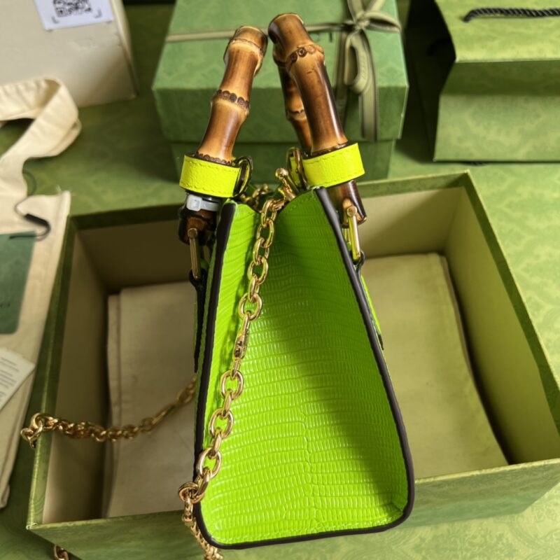DIANA series, super elegant, charming and glossy rare fluorescent green lizard pattern bag with sheepskin lining, full copper chain (length 1 meter), natural bamboo handle! Mini size, but this square bag actually has a large capacity, and it is completely OK for commuting. With a straw hat and sunglasses, you can travel easily and elegantly, and the rate of return is super high! Model number: 675800. Dimensions: 20(W) x 16(H) x 10cm(D). Colour: Neon Green/Lizard Full Leather.
