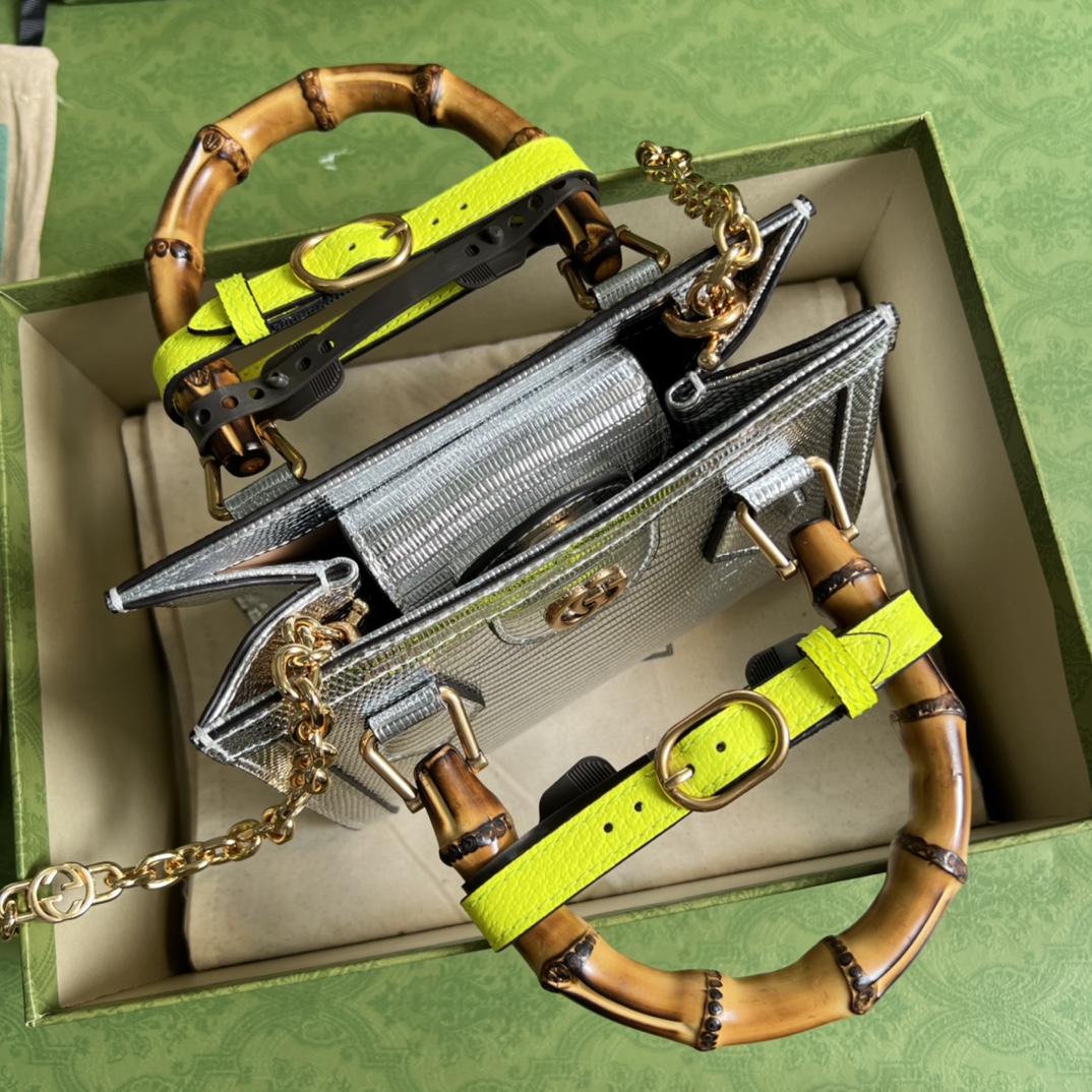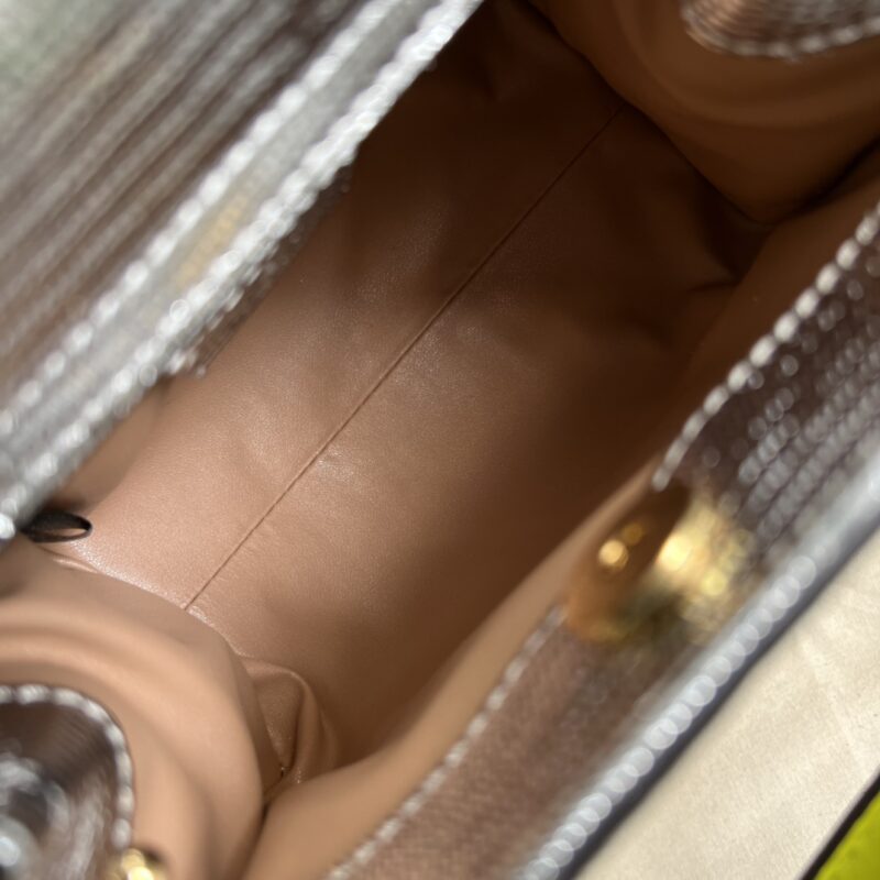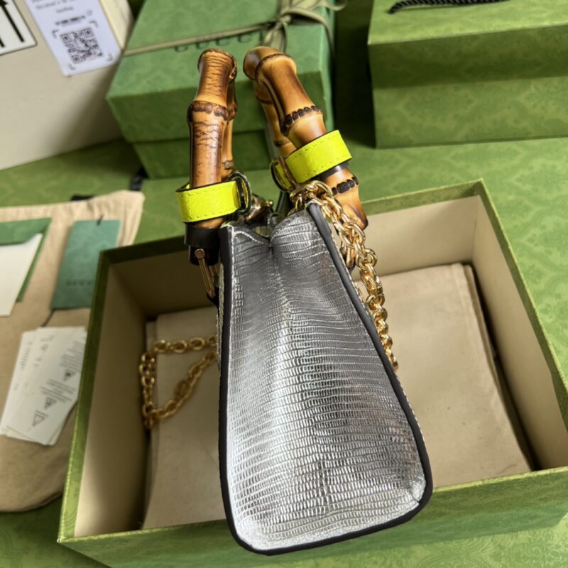 DIANA series, a super elegant, charming and shiny rare fluorescent silver lizard pattern bag with sheepskin lining, full copper chain (length 1 meter), natural bamboo handle! Mini size, but this square bag actually has a large capacity, and it is completely OK for commuting. With a straw hat and sunglasses, you can travel easily and elegantly, and the rate of return is super high! Dimensions: 20(W) x 16(H) x 10cm(D). Colour: Silver/Lizard Full Leather.