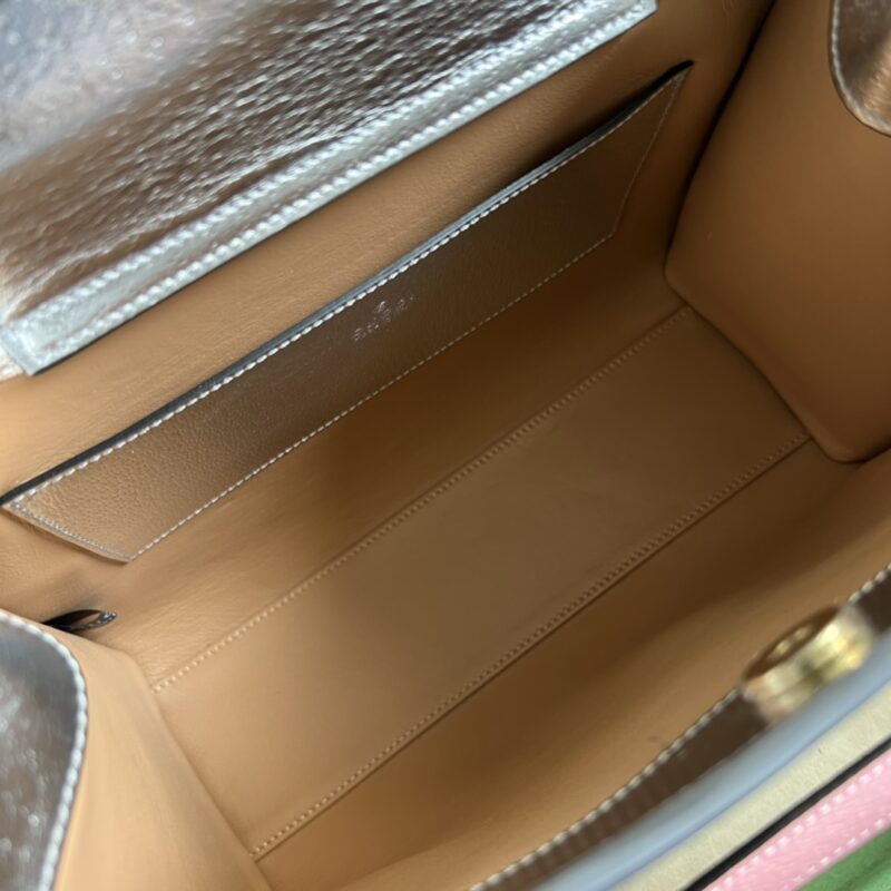 Original leather bamboo handle bag Gucci’s “Aria-fashion aria” series uses modern techniques to reinterpret classic elements. Bamboo is one of the classic elements of Gucci, which has appeared in various series of the brand since the 1940s. After more than eighty years of evolution, this classic element has been reinvented in silver leather on this small tote. The handbag is also equipped with two interchangeable shoulder straps – the smooth leather material shows elegant and classic temperament, and the striped webbing shoulder strap shows a strong brand connotation. Size: 27*24*11cm.