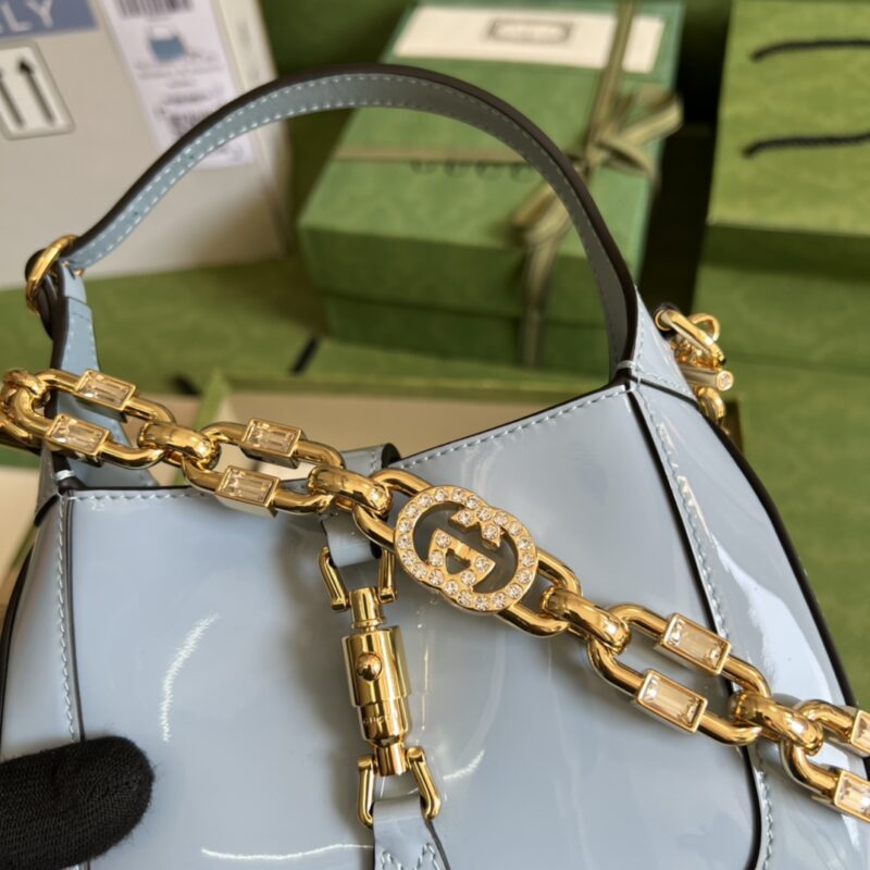 Mini Shoulder Bag from the Jackie 1961 collection, this piece is crafted in glossy patent leather for a playful yet sophisticated look. This Jackie 1961 series mini handbag interprets this lustrous material in bright light blue, adding another fashion masterpiece to “Gucci Love’s March”. Bold color palettes echo this season’s show’s homage to self-expression. Pale blue patent leather, gold-toned hardware, handle height: 10 cm, detachable chain shoulder strap (40 cm high) interlocking G with crystals, push-lock closure. Mini Size: 19(W) x 13(H) x 3cm(D) Colour: Light Blue/Patent Leather.