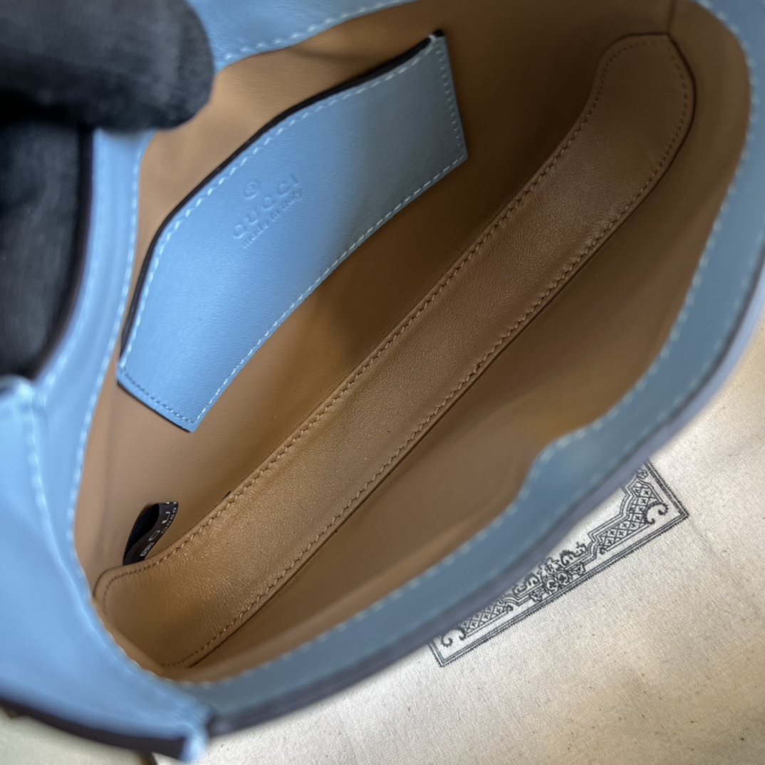 Mini Shoulder Bag from the Jackie 1961 collection, this piece is crafted in glossy patent leather for a playful yet sophisticated look. This Jackie 1961 series mini handbag interprets this lustrous material in bright light blue, adding another fashion masterpiece to “Gucci Love’s March”. Bold color palettes echo this season’s show’s homage to self-expression. Pale blue patent leather, gold-toned hardware, handle height: 10 cm, detachable chain shoulder strap (40 cm high) interlocking G with crystals, push-lock closure. Mini Size: 19(W) x 13(H) x 3cm(D) Colour: Light Blue/Patent Leather.