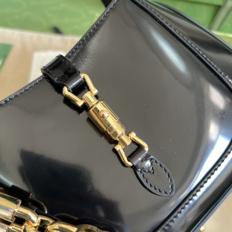 Mini Shoulder Bag from the Jackie 1961 collection, this piece is crafted in glossy patent leather for a playful yet sophisticated look. This Jackie 1961 series mini handbag interprets this glossy material in bright black, adding a stylish masterpiece to the “Gucci Love March”. Bold color palettes echo this season’s show’s homage to self-expression. Black patent leather, gold-tone hardware, high handles: 10 cm, detachable interlocking G chain shoulder strap with crystals (40 cm high), push-lock closure. Mini Size: 19(W) x 13(H) x 3cm(D) Colour: Black/Patent Leather.