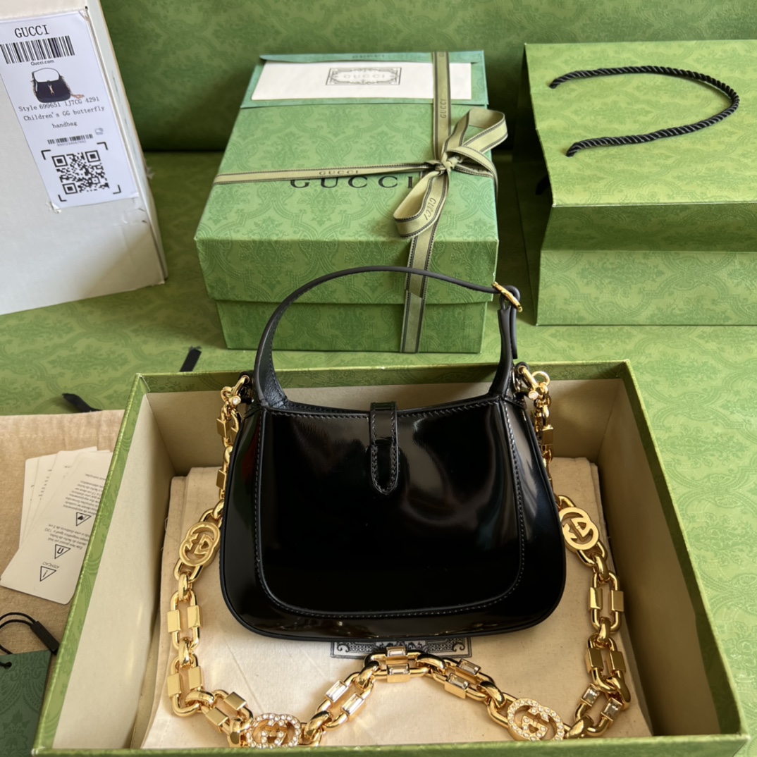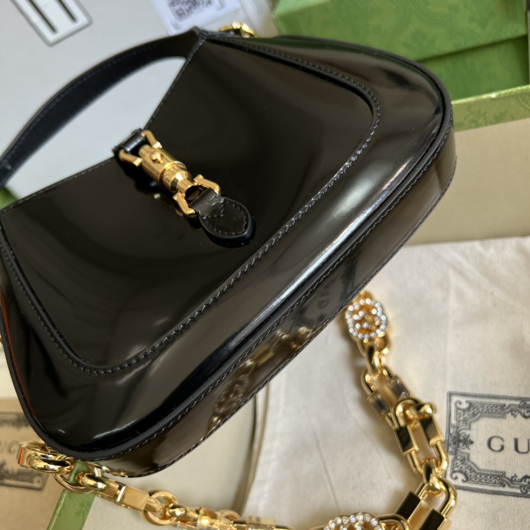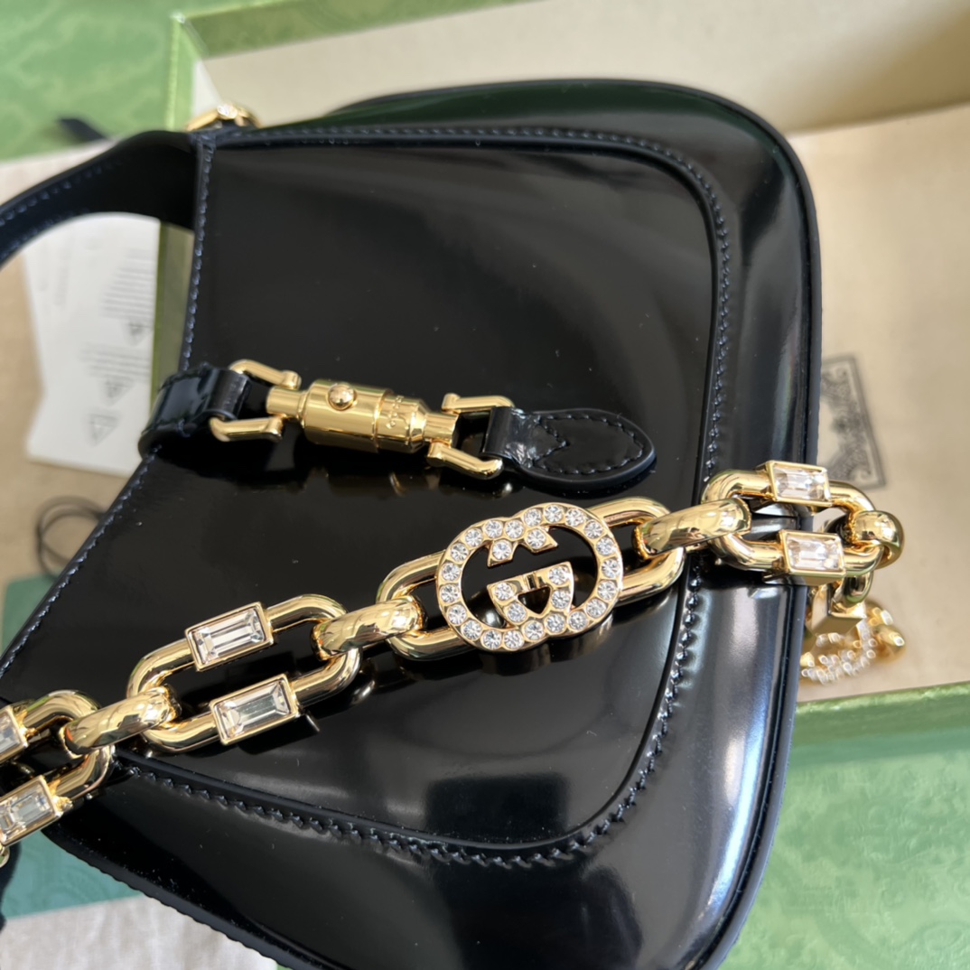 Mini Shoulder Bag from the Jackie 1961 collection, this piece is crafted in glossy patent leather for a playful yet sophisticated look. This Jackie 1961 series mini handbag interprets this glossy material in bright black, adding a stylish masterpiece to the “Gucci Love March”. Bold color palettes echo this season’s show’s homage to self-expression. Black patent leather, gold-tone hardware, high handles: 10 cm, detachable interlocking G chain shoulder strap with crystals (40 cm high), push-lock closure. Mini Size: 19(W) x 13(H) x 3cm(D) Colour: Black/Patent Leather.