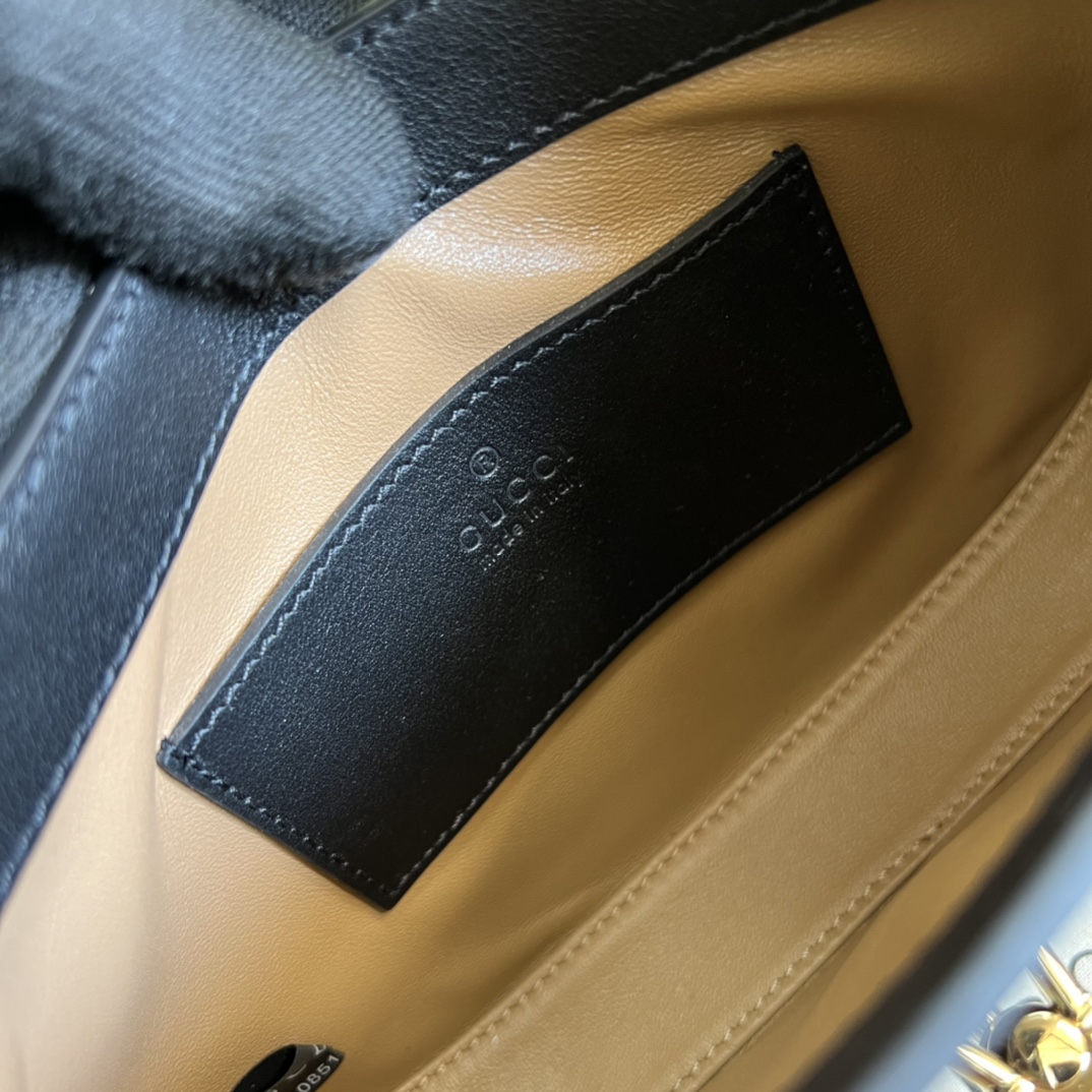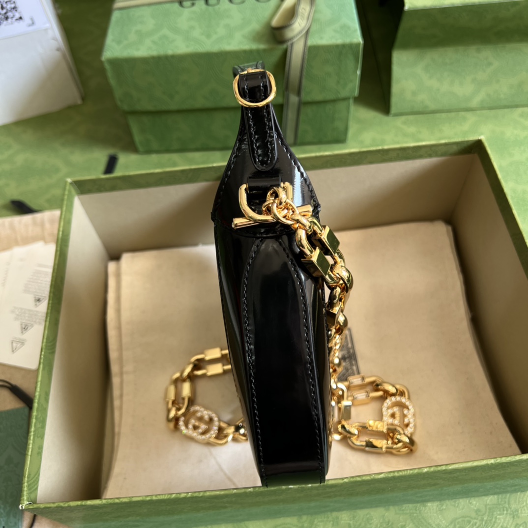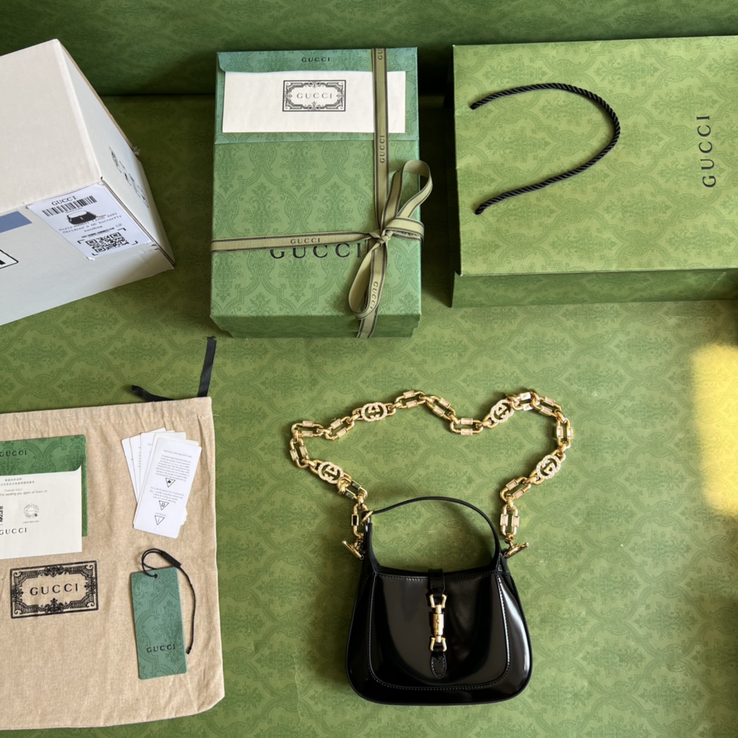 Mini Shoulder Bag from the Jackie 1961 collection, this piece is crafted in glossy patent leather for a playful yet sophisticated look. This Jackie 1961 series mini handbag interprets this glossy material in bright black, adding a stylish masterpiece to the “Gucci Love March”. Bold color palettes echo this season’s show’s homage to self-expression. Black patent leather, gold-tone hardware, high handles: 10 cm, detachable interlocking G chain shoulder strap with crystals (40 cm high), push-lock closure. Mini Size: 19(W) x 13(H) x 3cm(D) Colour: Black/Patent Leather.