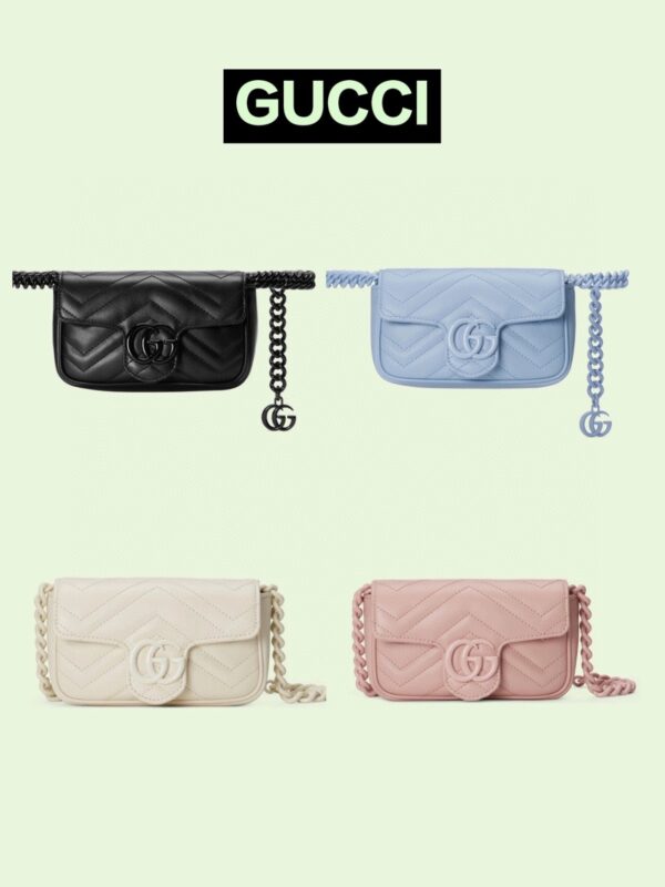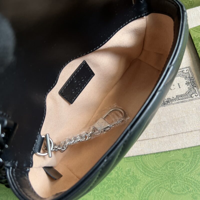 GG 👉Marmont chain macaron series black mini handbag, equipped with a key chain, which can be used to tie this bag to another larger handbag. Soft, structured shape with flap closure and GG hardware. Metal hardware takes inspiration from classic 70s designs. Crafted in quilted chevron leather. Size: 16.5×10.2×5.1cm