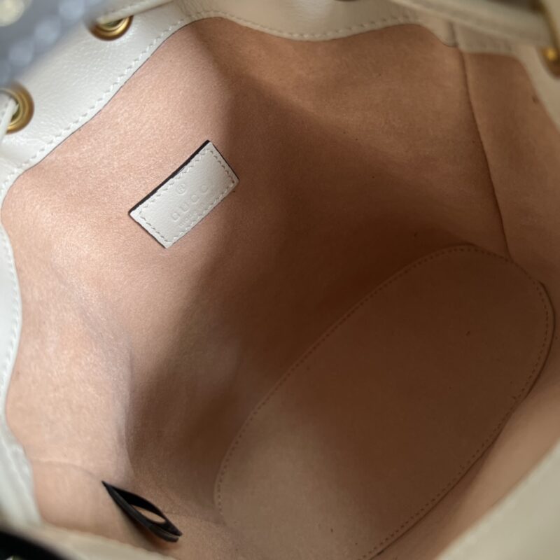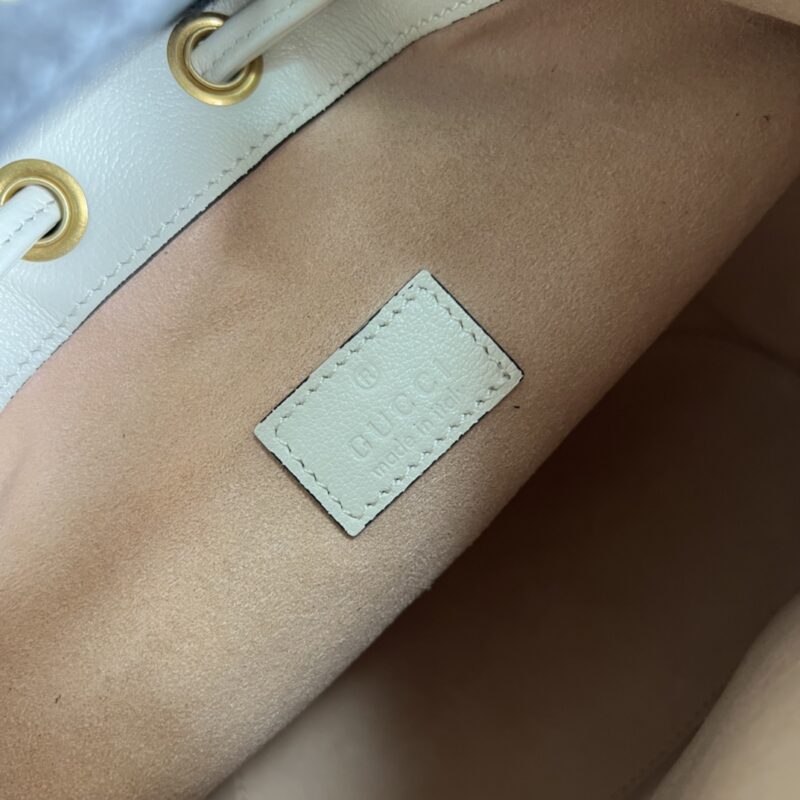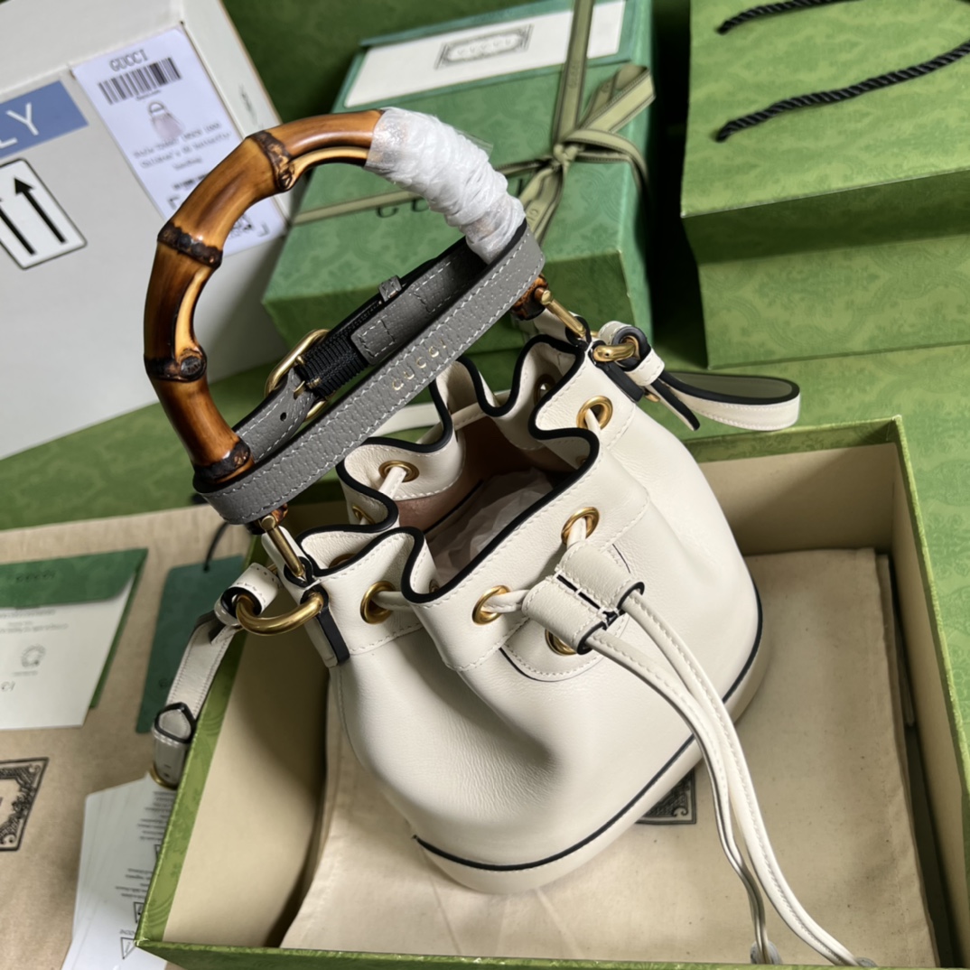 GG👉This mini bucket bag combines two recognizable brand elements of bamboo handle and double G accessories. The white leather material and the leather trim belt complement each other, highlighting the smart and elegant temperament. White leather, as pictured, this piece comes with a decorative leather handle with double G buckle, adjustable shoulder strap, internal open pocket, bamboo handle (8 cm high). Small Size: 19(W) x 31(H) x 6(D)