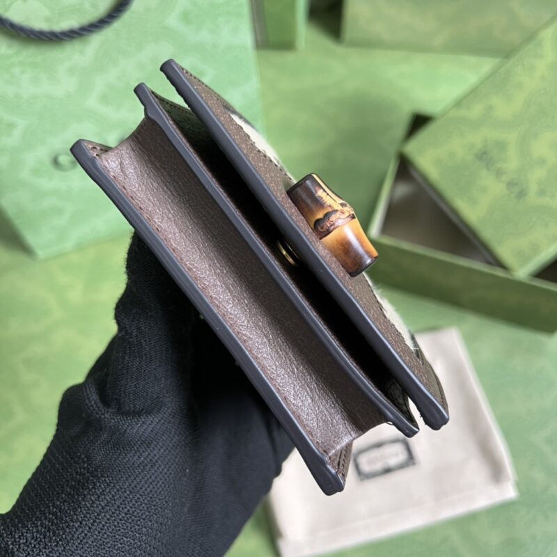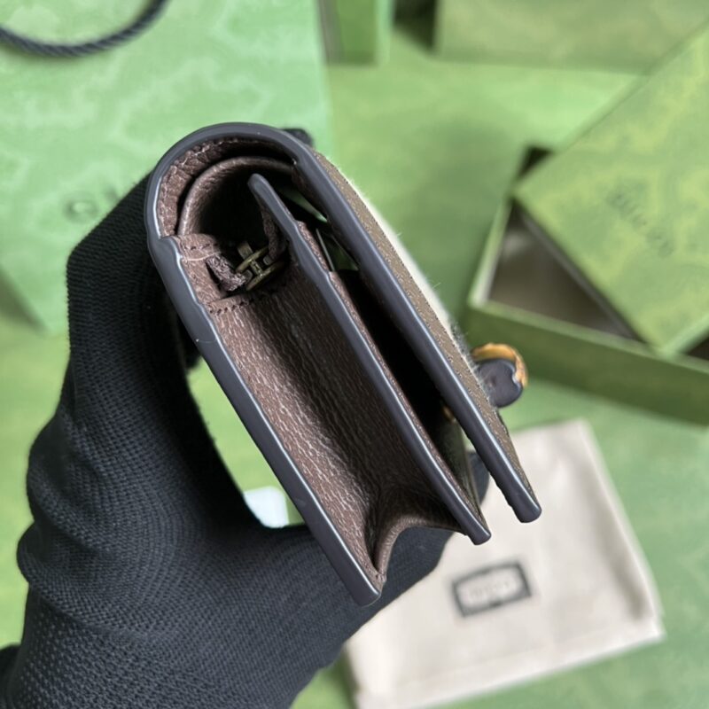 Bamboo card holder Gucci’s “Aria-fashion aria” series uses modern techniques to reinterpret classic elements. Bamboo is one of the classic elements of Gucci, which has appeared in various series of the brand since the 1940s. After more than 80 years of development and evolution, this classic element is blended with black leather and presented in this card holder. The handbag is also equipped with two interchangeable shoulder straps – the smooth leather material shows elegant and classic temperament, and the striped webbing shoulder strap shows a strong brand connotation. Size: 9*10*3cm.