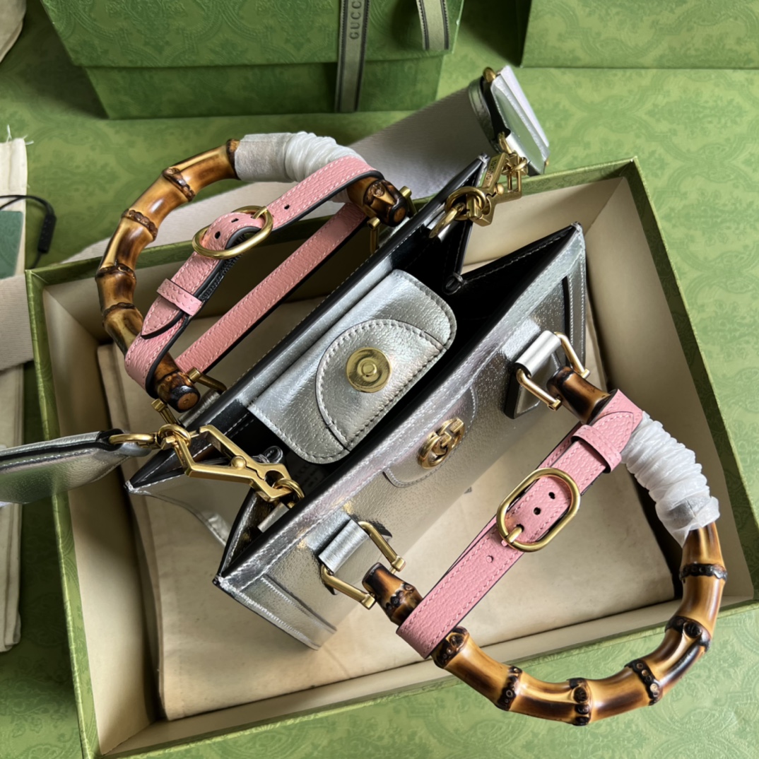 Bamboo small handbag Gucci’s “Aria-fashion aria” series uses modern techniques to reinterpret classic elements. Bamboo is one of the classic elements of Gucci, which has appeared in various series of the brand since the 1940s. After more than 80 years of development and evolution, this classic element is blended with silver leather and presented in this small handbag. The handbag is also equipped with two interchangeable shoulder straps – the smooth leather material shows elegant and classic temperament, and the striped webbing shoulder strap shows a strong brand connotation. Size: 20*16*10cm.