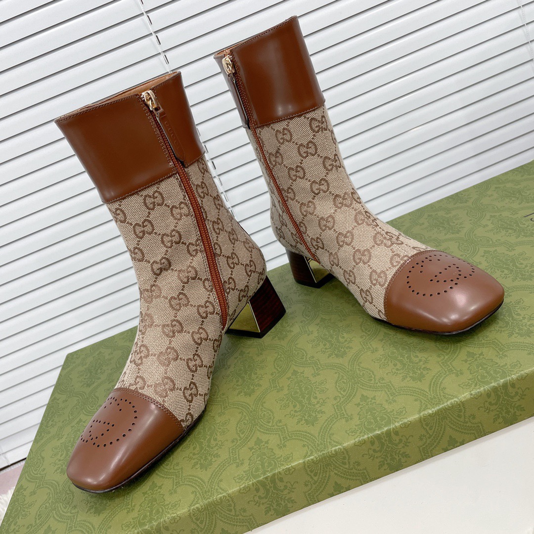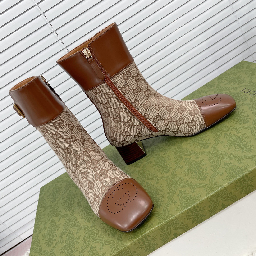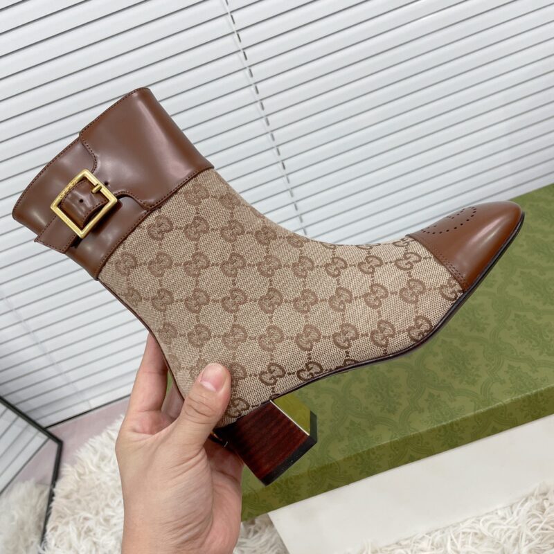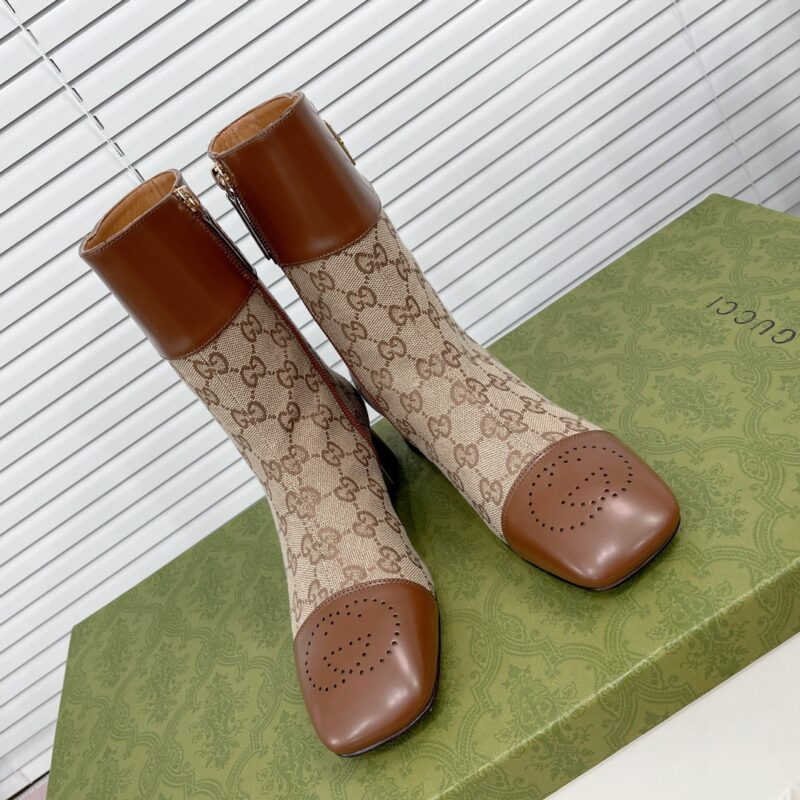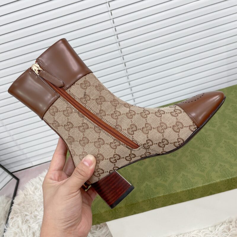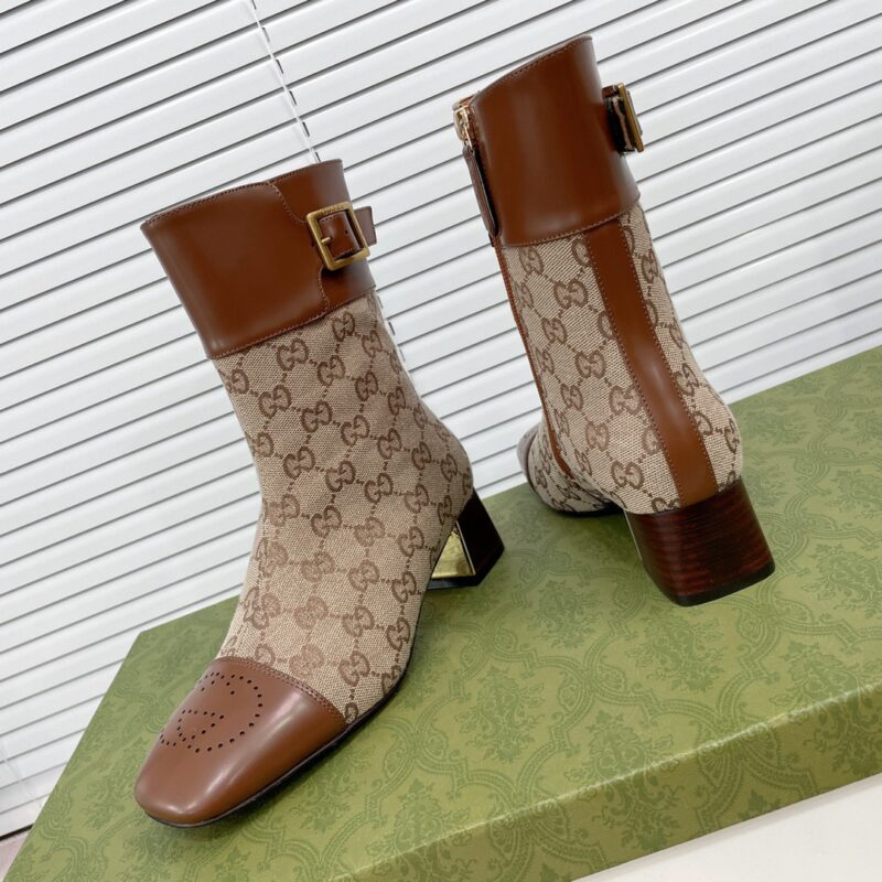 Gucc’s Latest Short Boots. Women’s Boots Simple and fashionable; stitching color; square toe; 5cm heel height. Material: Presbyopic stitched top layer cowhide. Inside: Sheepskin lining with feet. 5cm square heel. Leather outsole. Sizes: 35-40