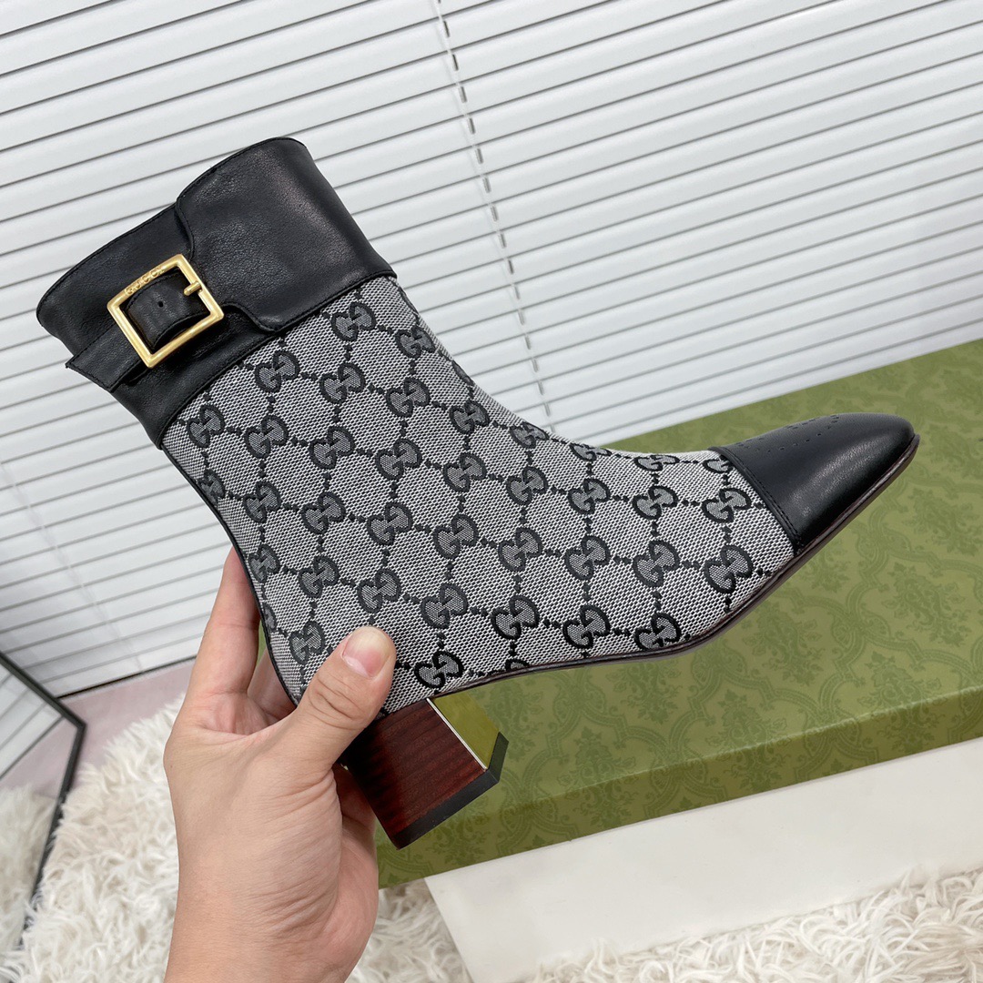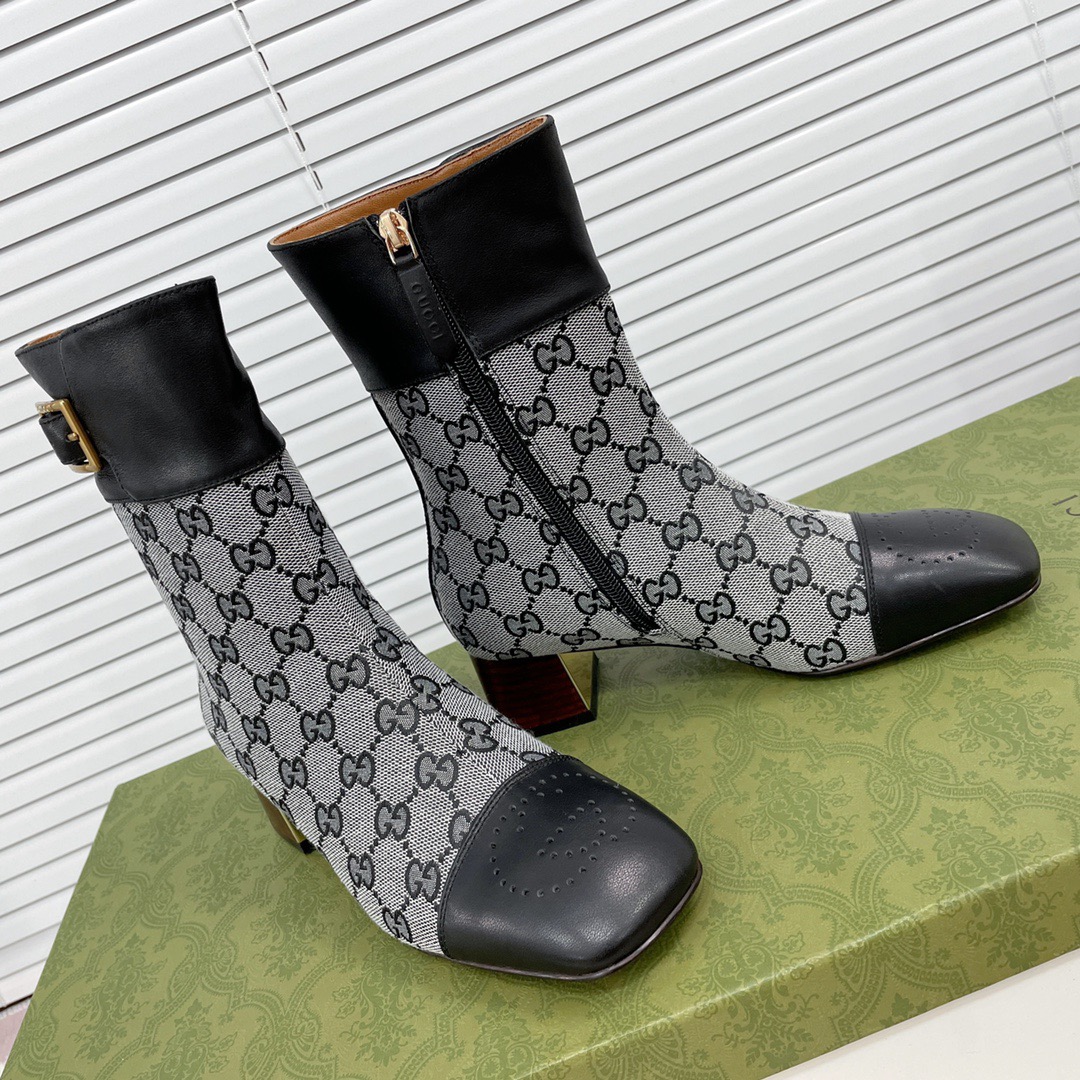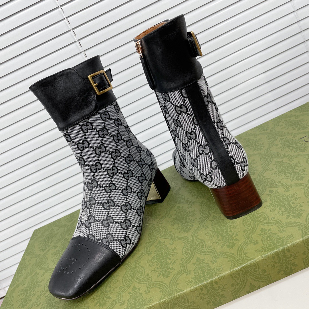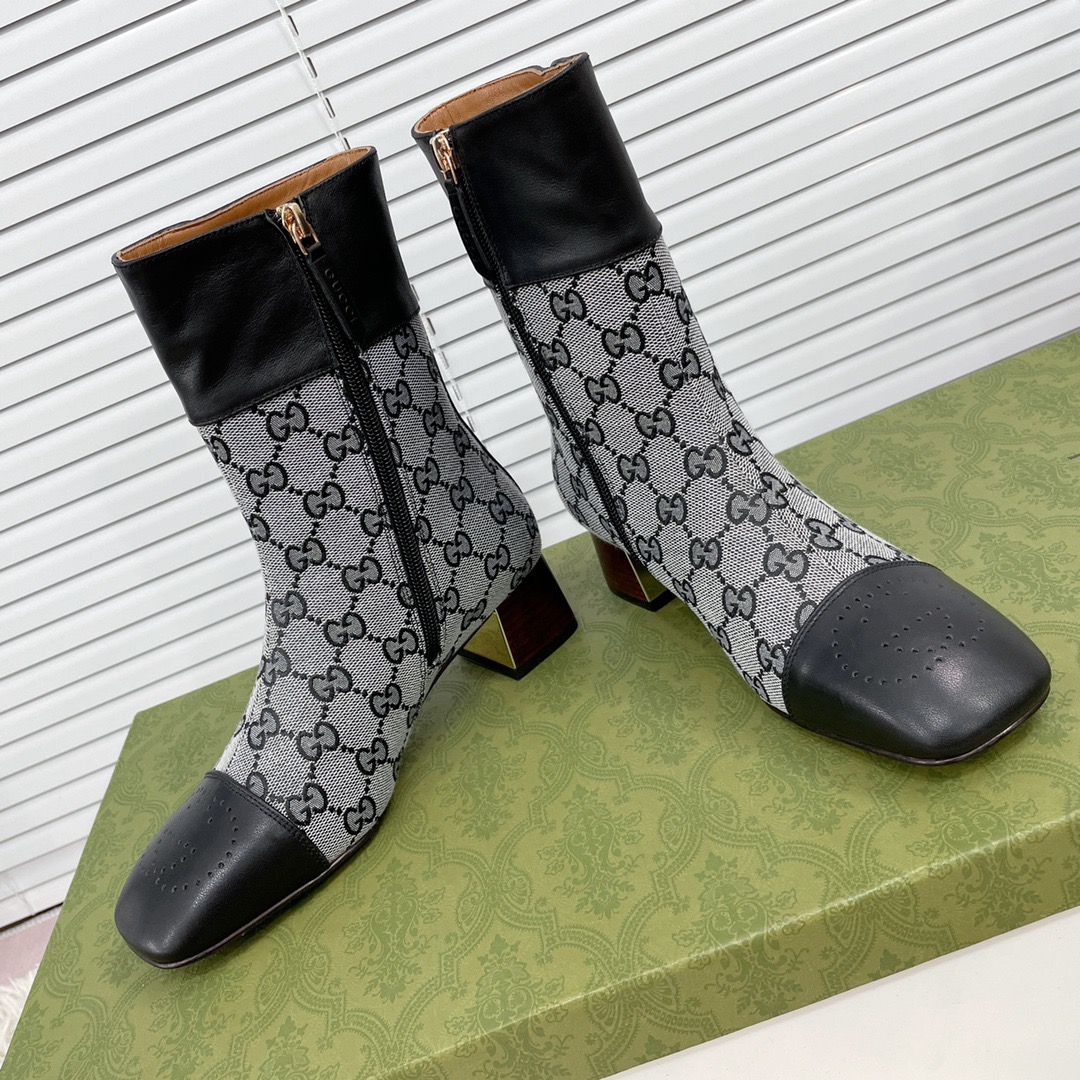 Gucc’s Latest Short Boots. Women’s Boots Simple and fashionable; stitching color; square toe; 5cm heel height. Material: Presbyopic stitched top layer cowhide. Inside: Sheepskin lining with feet. 5cm square heel. Leather outsole. Sizes: 35-40