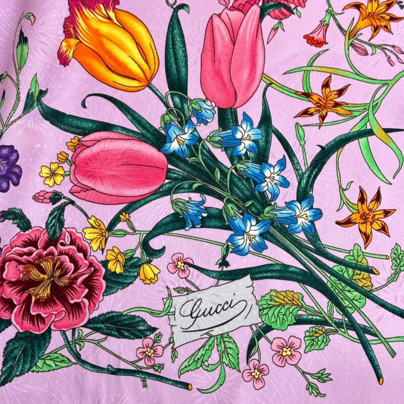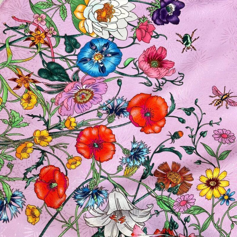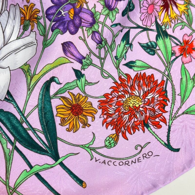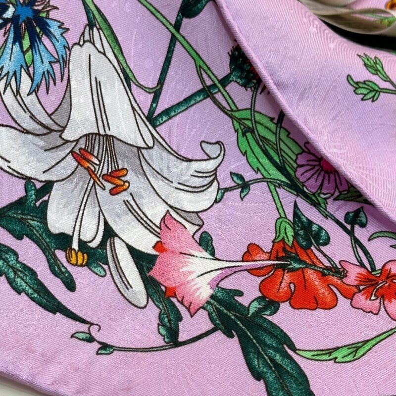 The classic floral print continues to inject romance into the new collection. The floral pattern was originally designed by artist Vittorio Accornero in the 1960s; now, it is reinterpreted as colorful flowers, cascading like a waterfall on this green silk square scarf, showing the beauty of contrasting colors. 033270