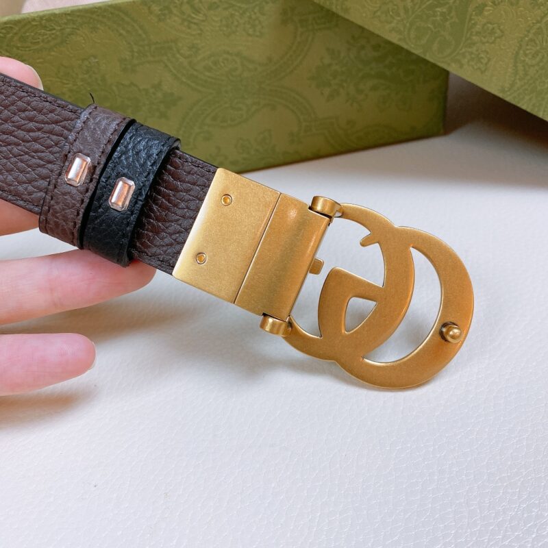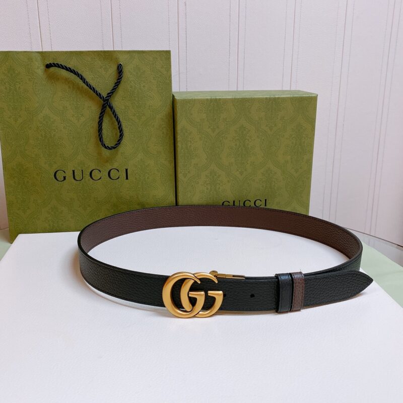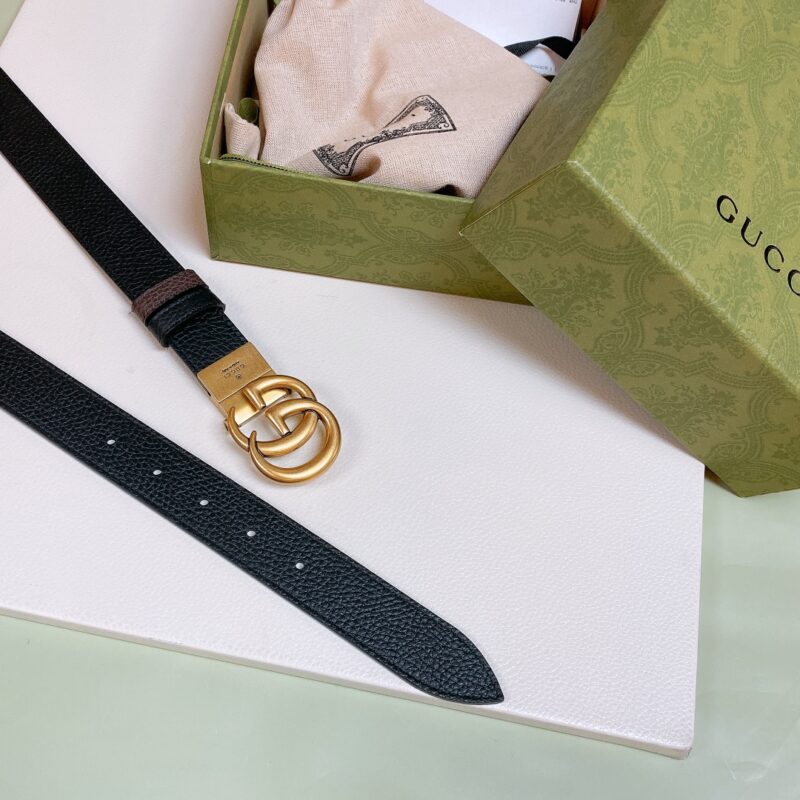 Gucci double G buckle reversible belt. Distressed gold tone hardware. The 3mm belt is suitable for both low-waist and high-waist wearing styles.