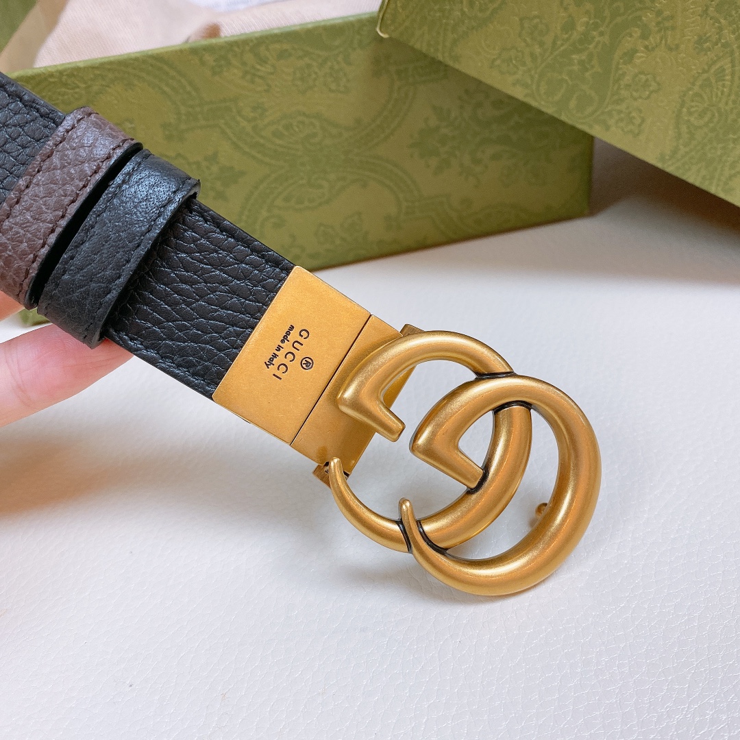Gucci double G buckle reversible belt. Distressed gold tone hardware. The 3mm belt is suitable for both low-waist and high-waist wearing styles.