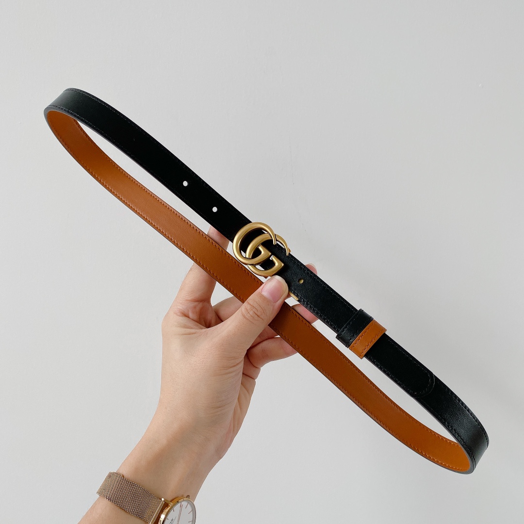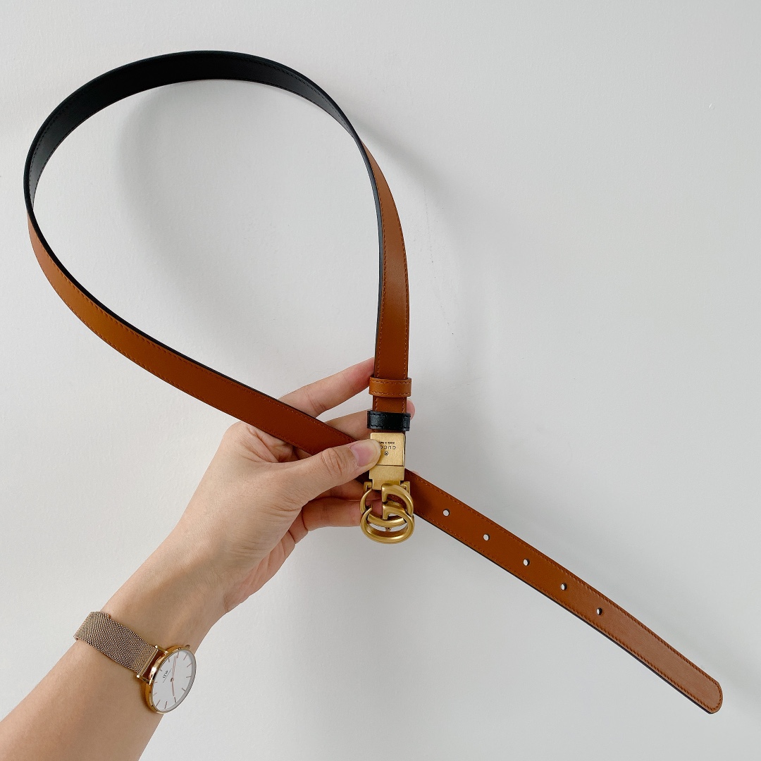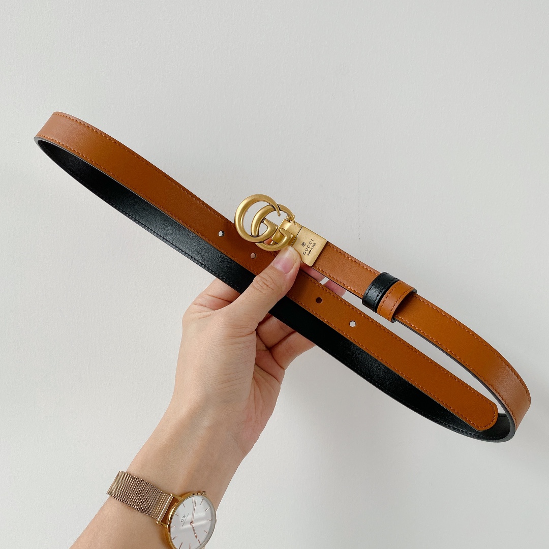 Caramel leather, black leather back with distressed gold-tone hardware. Double G buckle 2mm boutique Italian creation, this belt is suitable for low waist and high waist two ways of wearing.