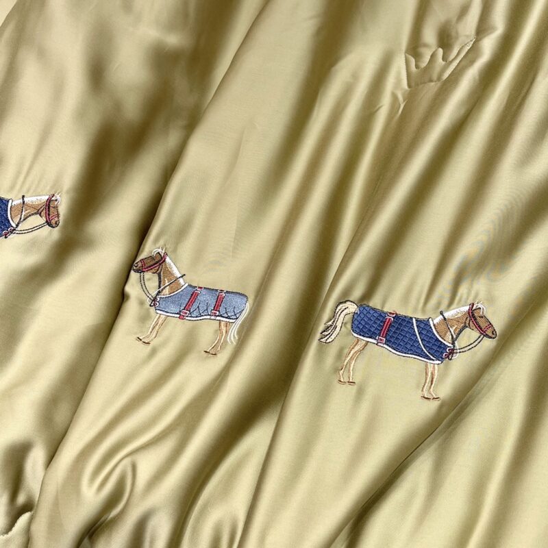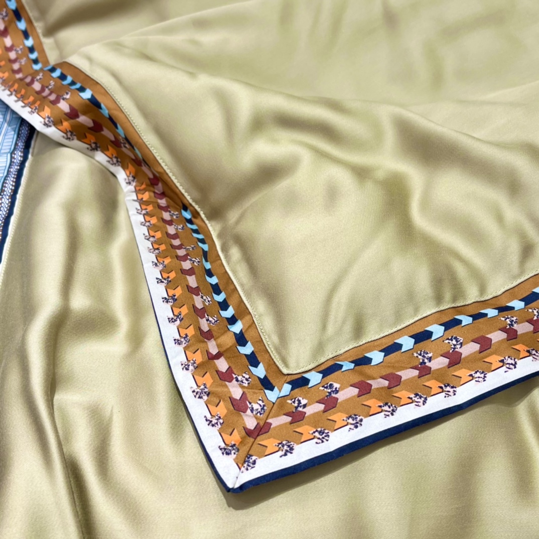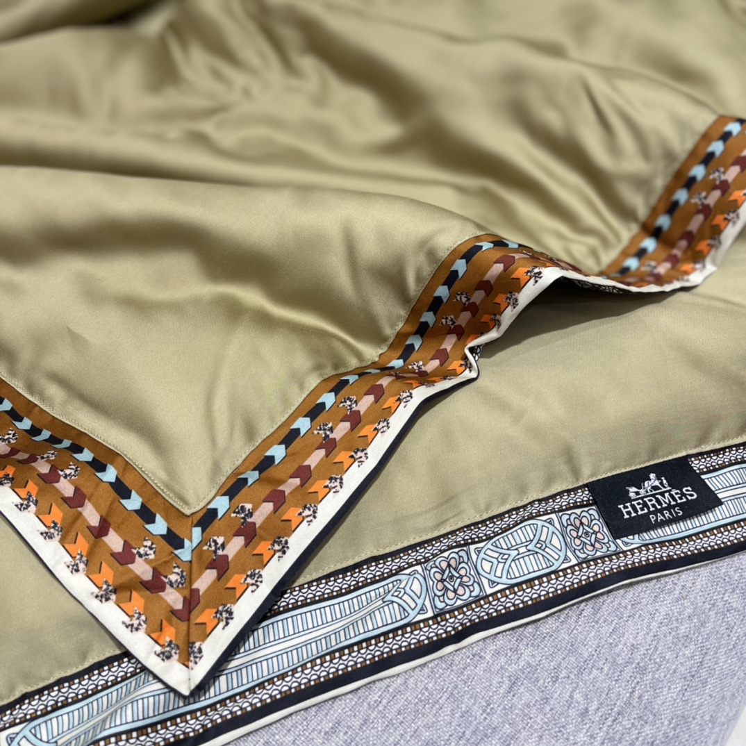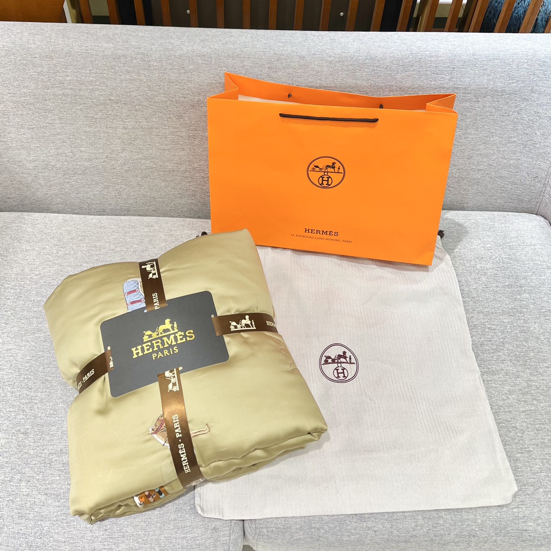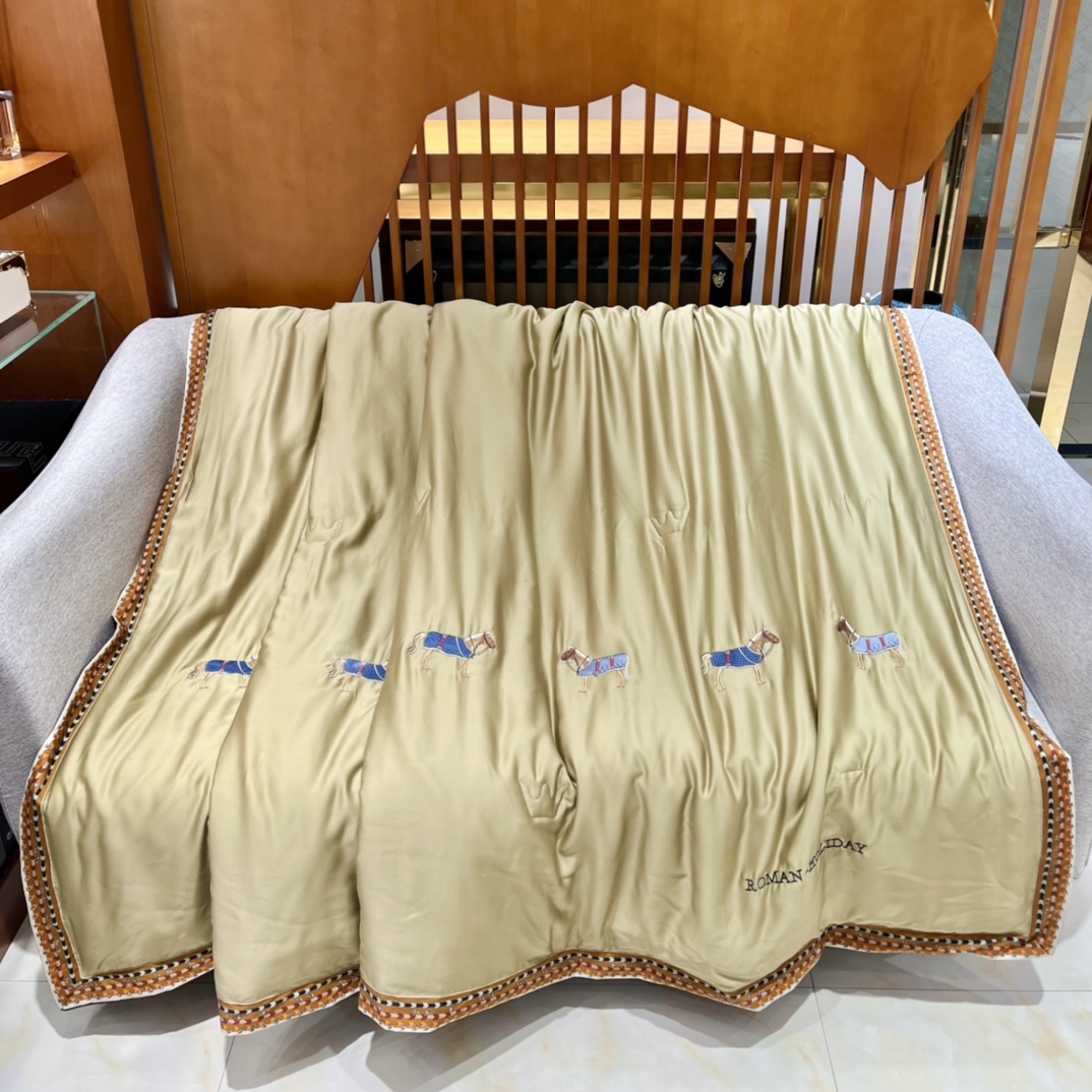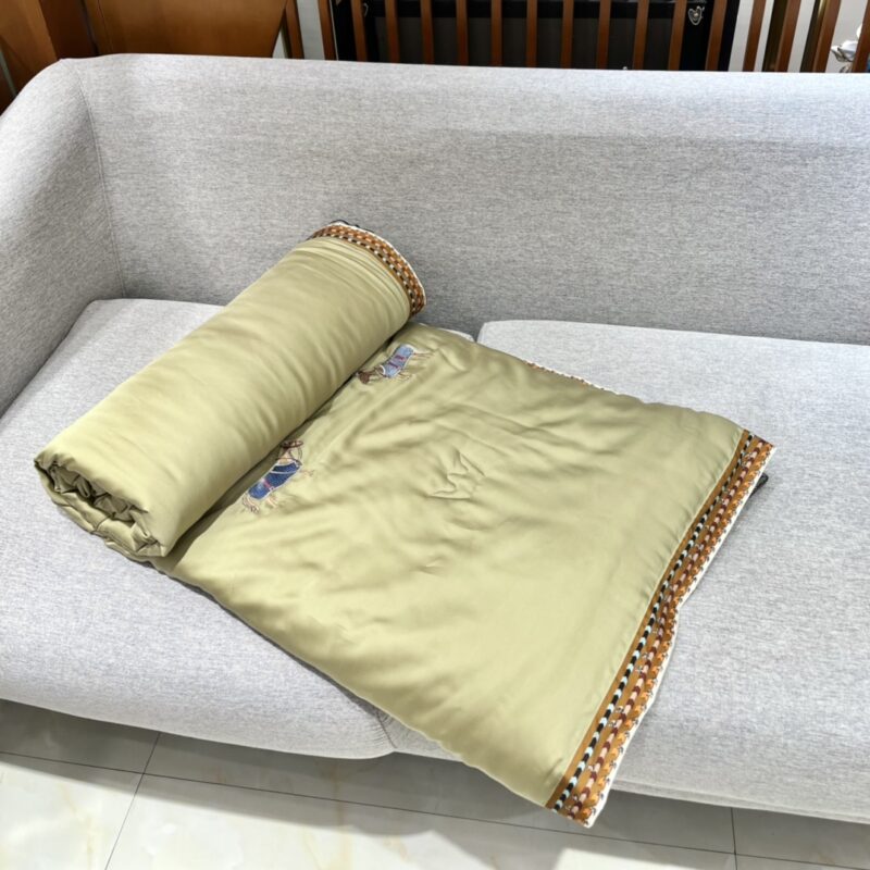 Hermes summer air conditioner quilt New Color – Mustard Green 100% lyocell tencel + whole feather velvet Washing method: Machine wash directly, do not dry do not expose to the sun. Size: 200*230cm.
