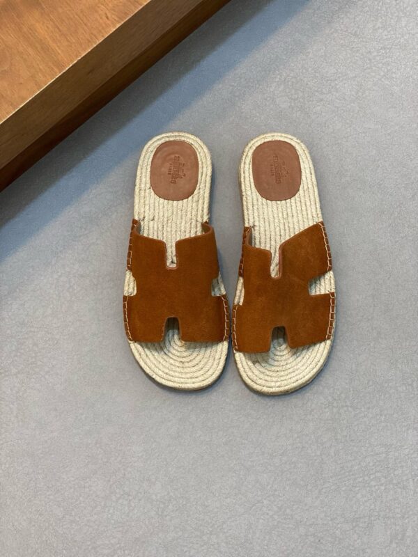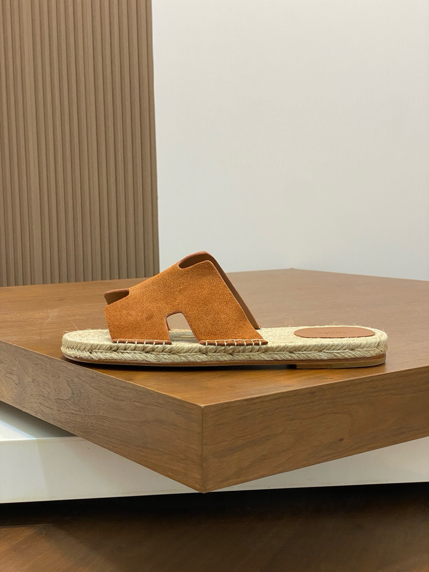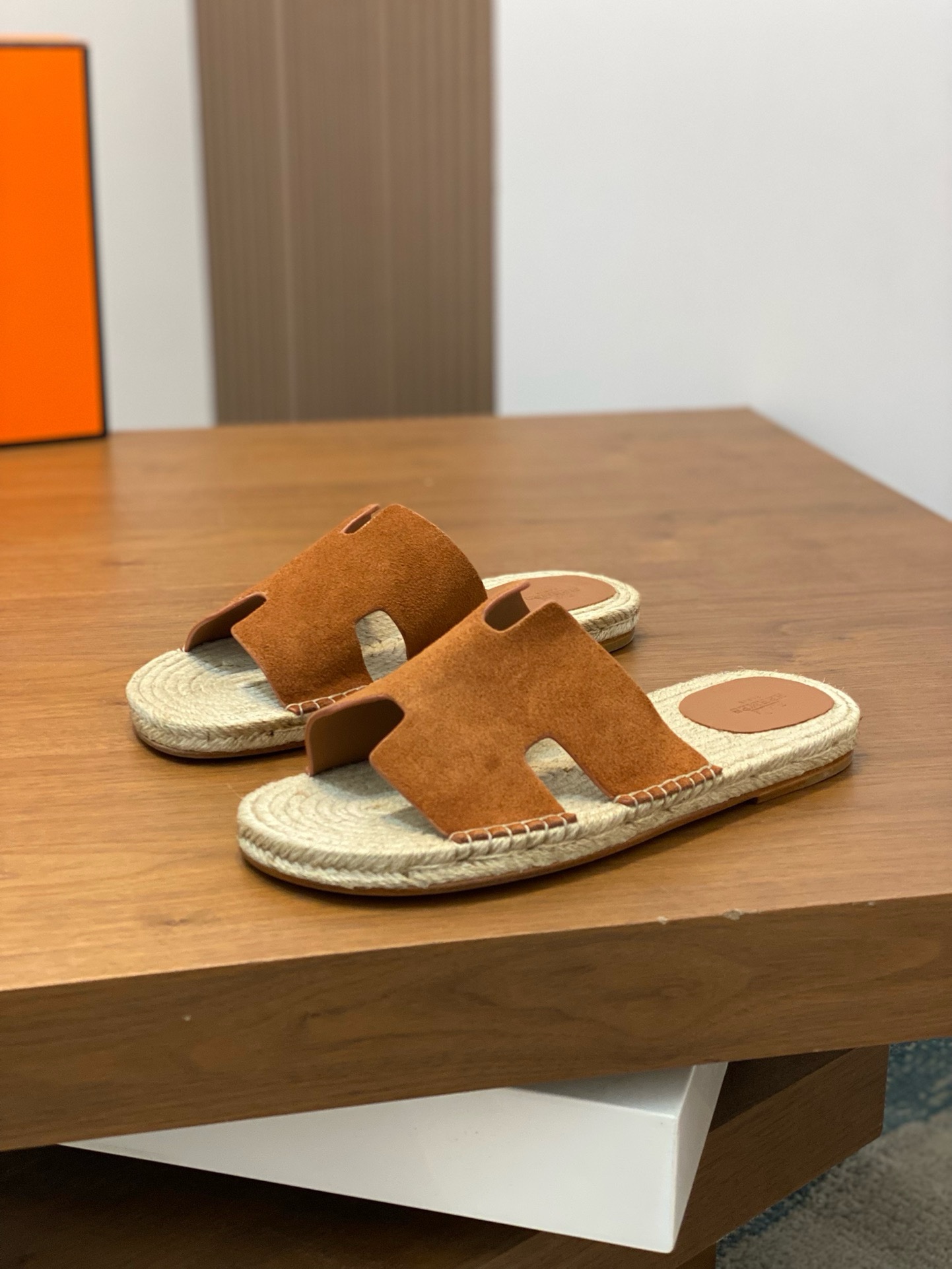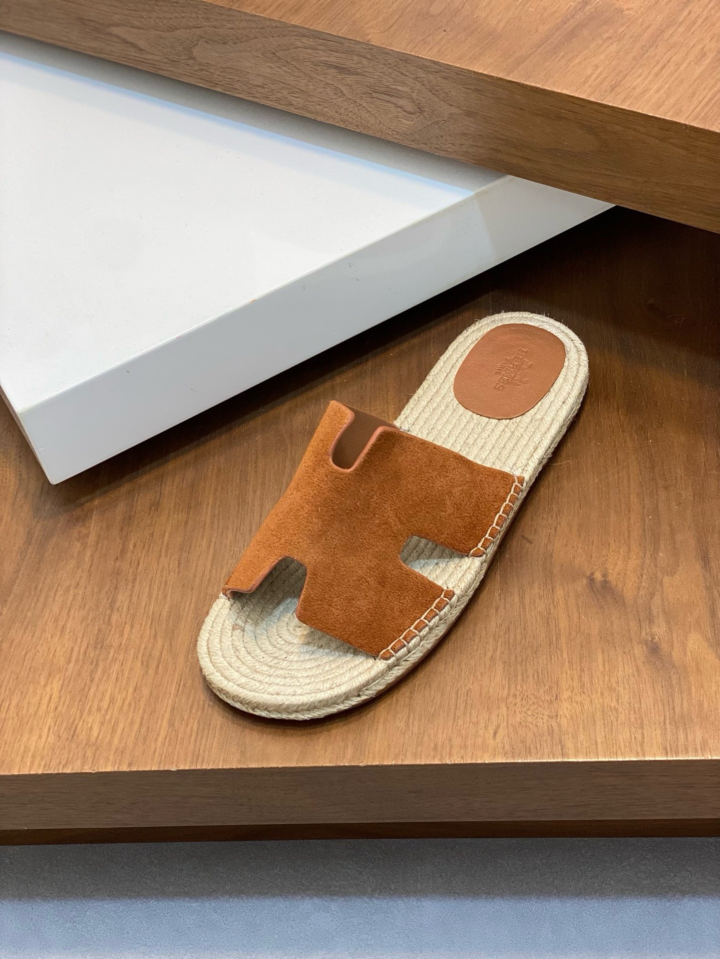 Calfskin suede straw shoes, with braided rope soles, H-shaped uppers, create a leisurely seaside look.