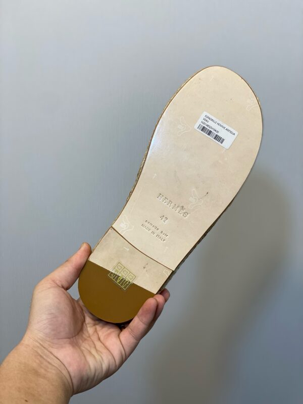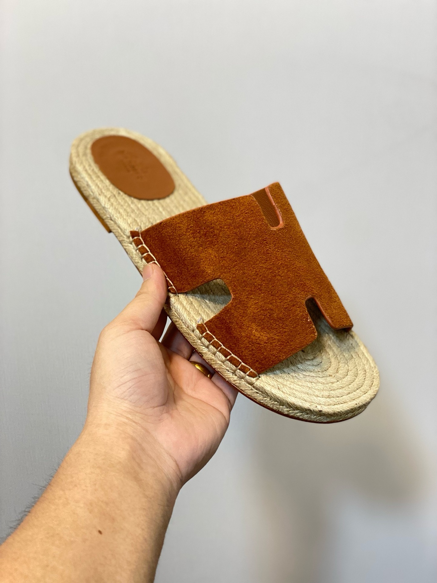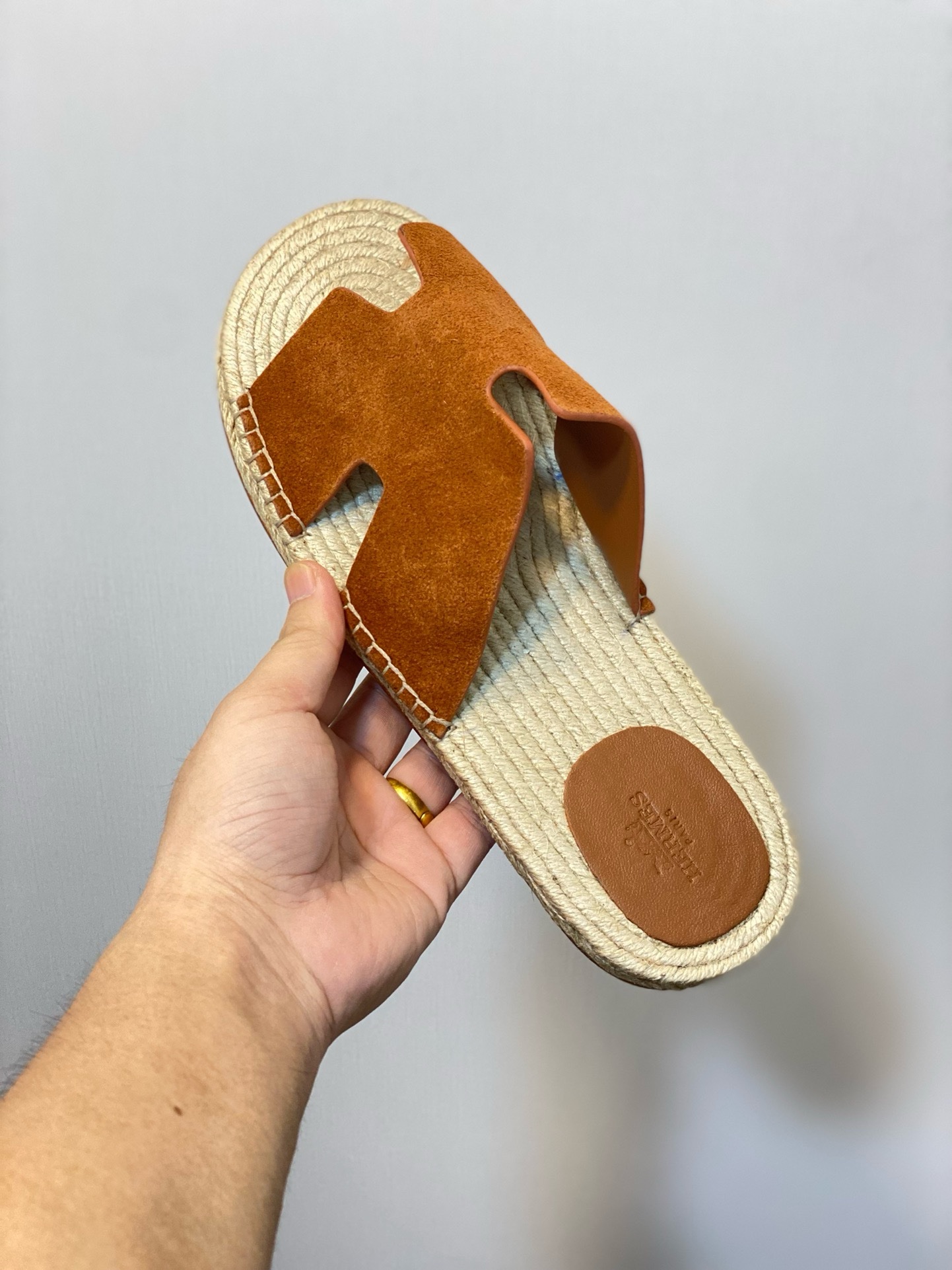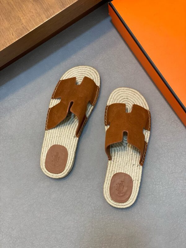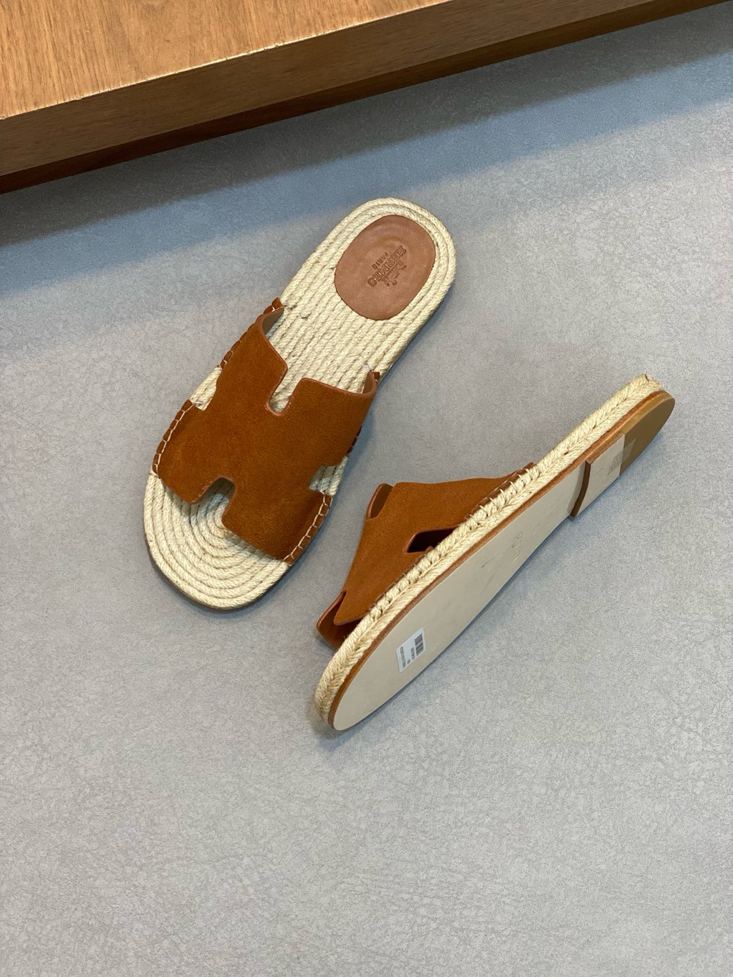 Calfskin suede straw shoes, with braided rope soles, H-shaped uppers, create a leisurely seaside look.