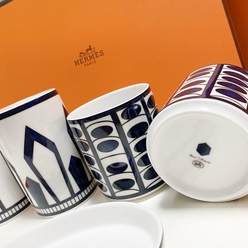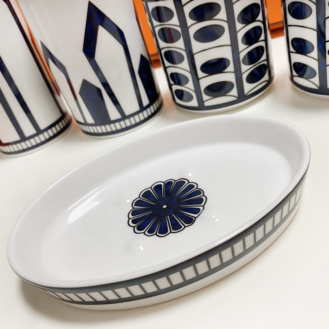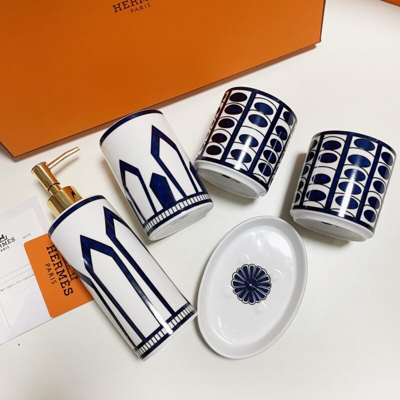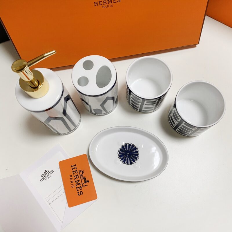Bathroom | Hermes Bone China Bath 5 Piece Set Configuration: Lotion bottle 1, soap box 1, toothbrush box 1, mouthwash cup 2.