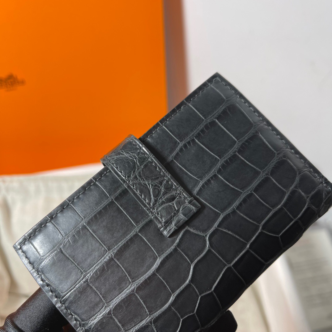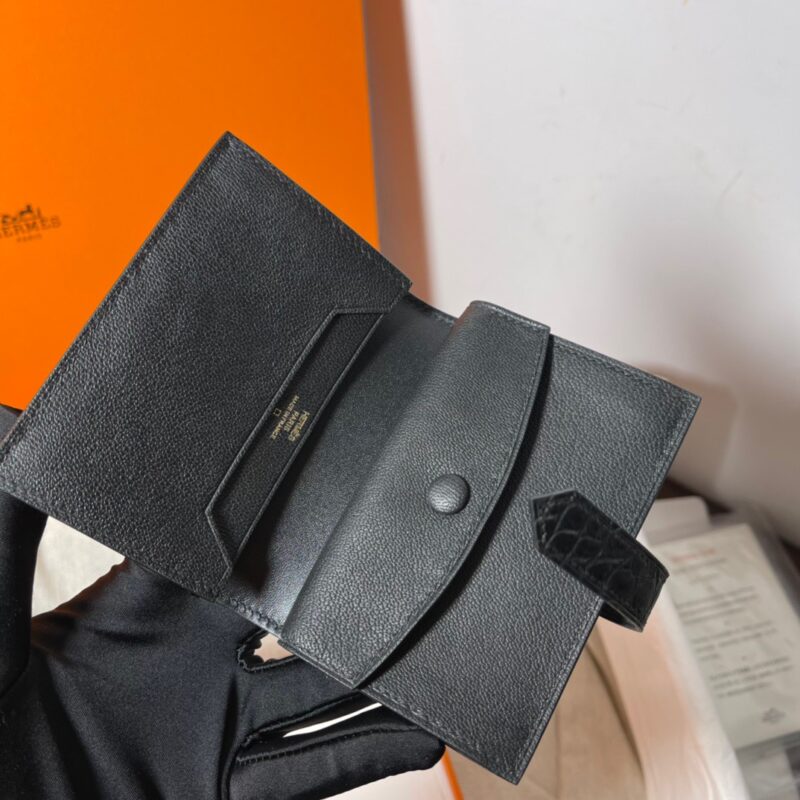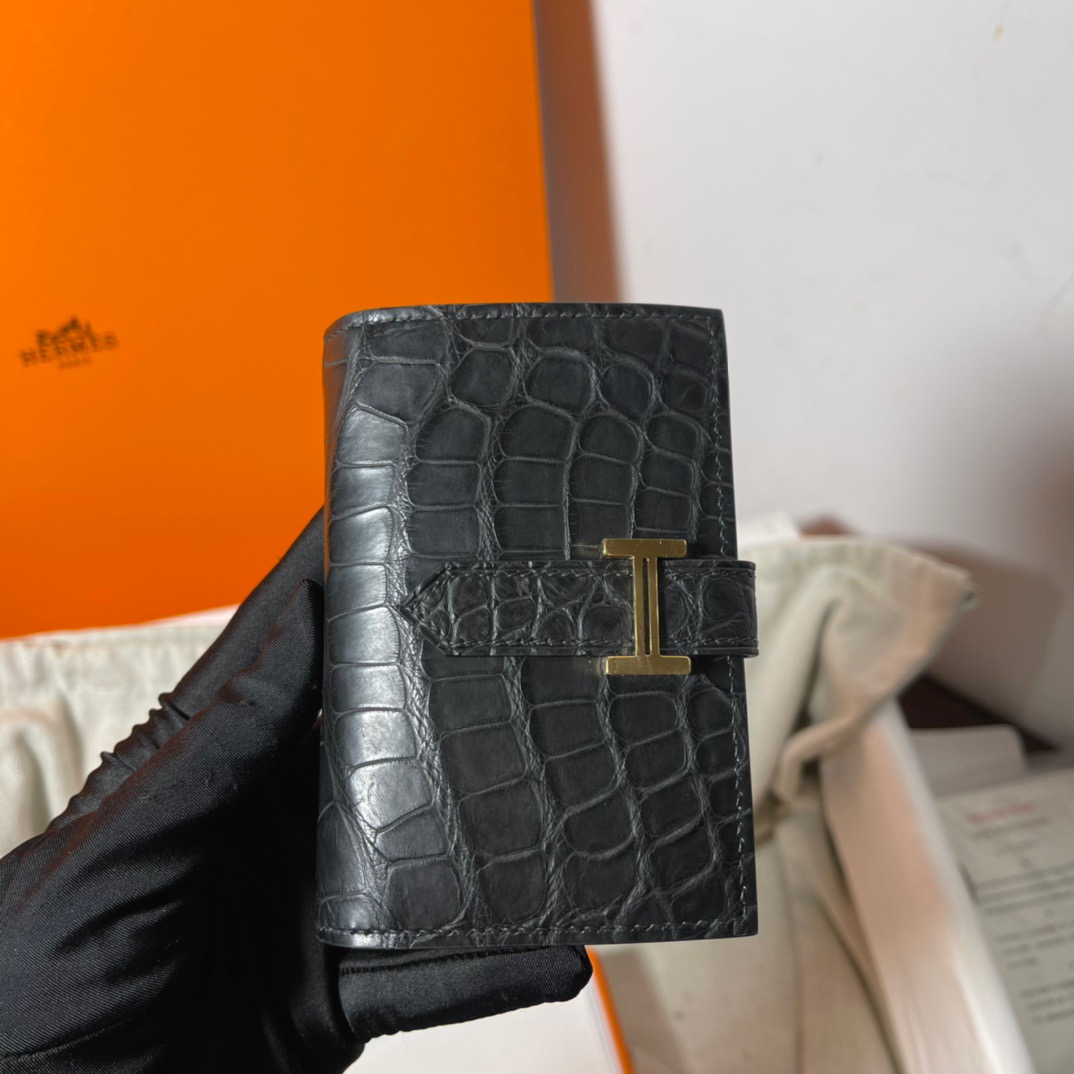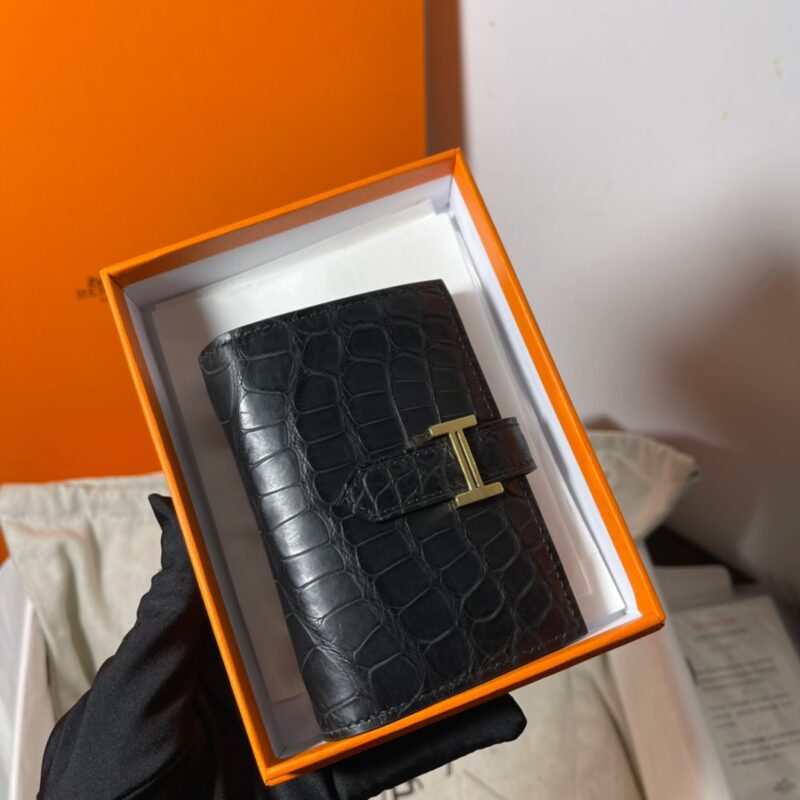 Bearn two-fold card case American crocodile skin. Ck89 Matte Black. Gold Buckle. Beeswax thread. Handmade