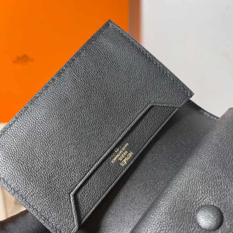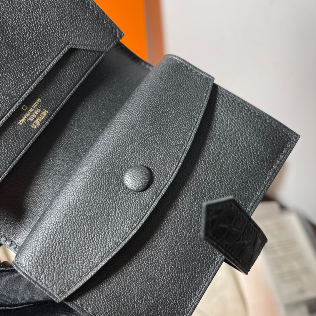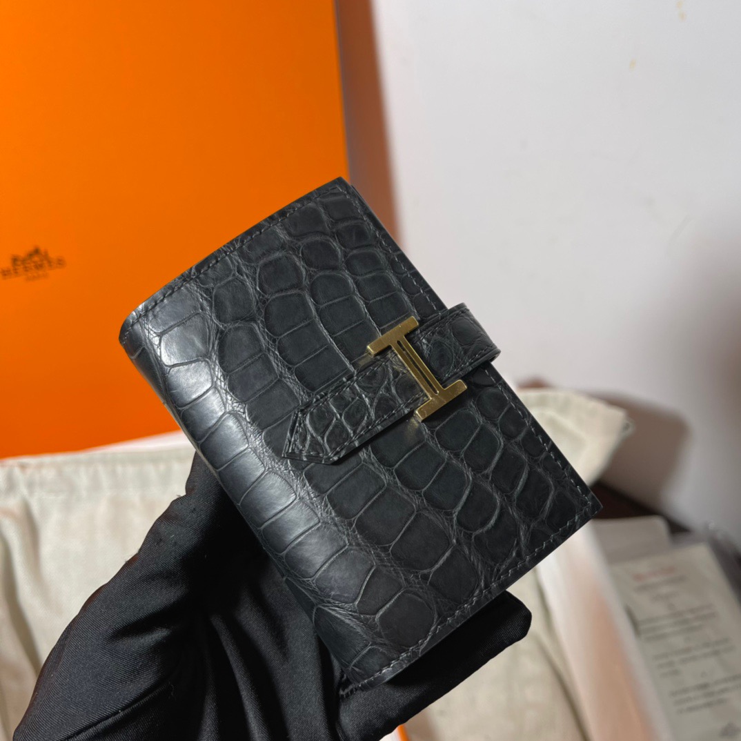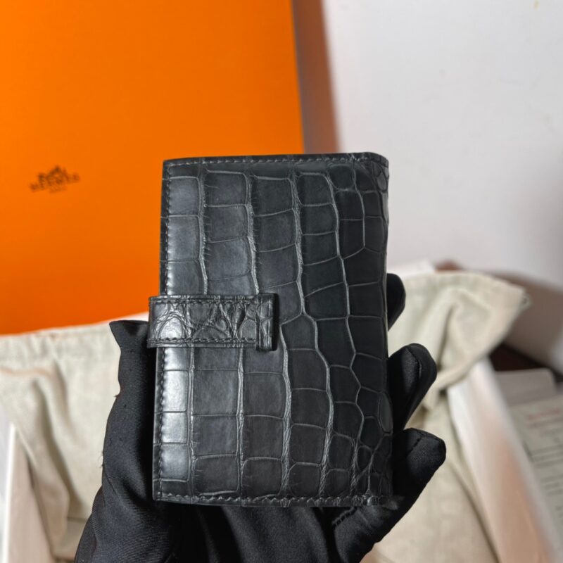 Bearn two-fold card case American crocodile skin. Ck89 Matte Black. Gold Buckle. Beeswax thread. Handmade