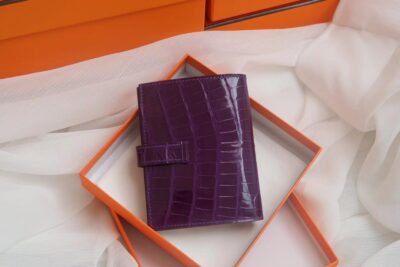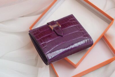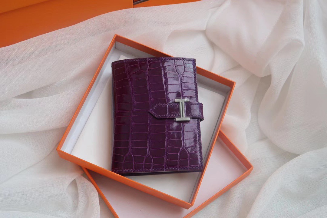 Bearn small H buckle short two-fold wallet American alligator skin. Full hand stitching silver buckle. Raisin 59 Color
