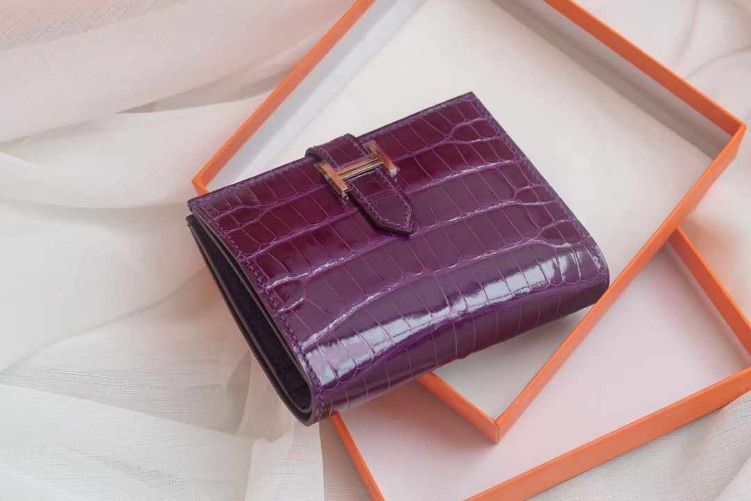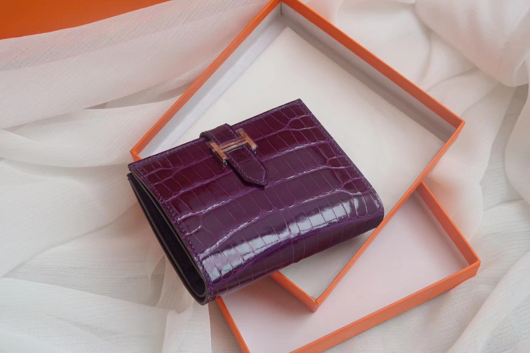 Hermes Bearn Compact Wallet Raisin color in Crocodile