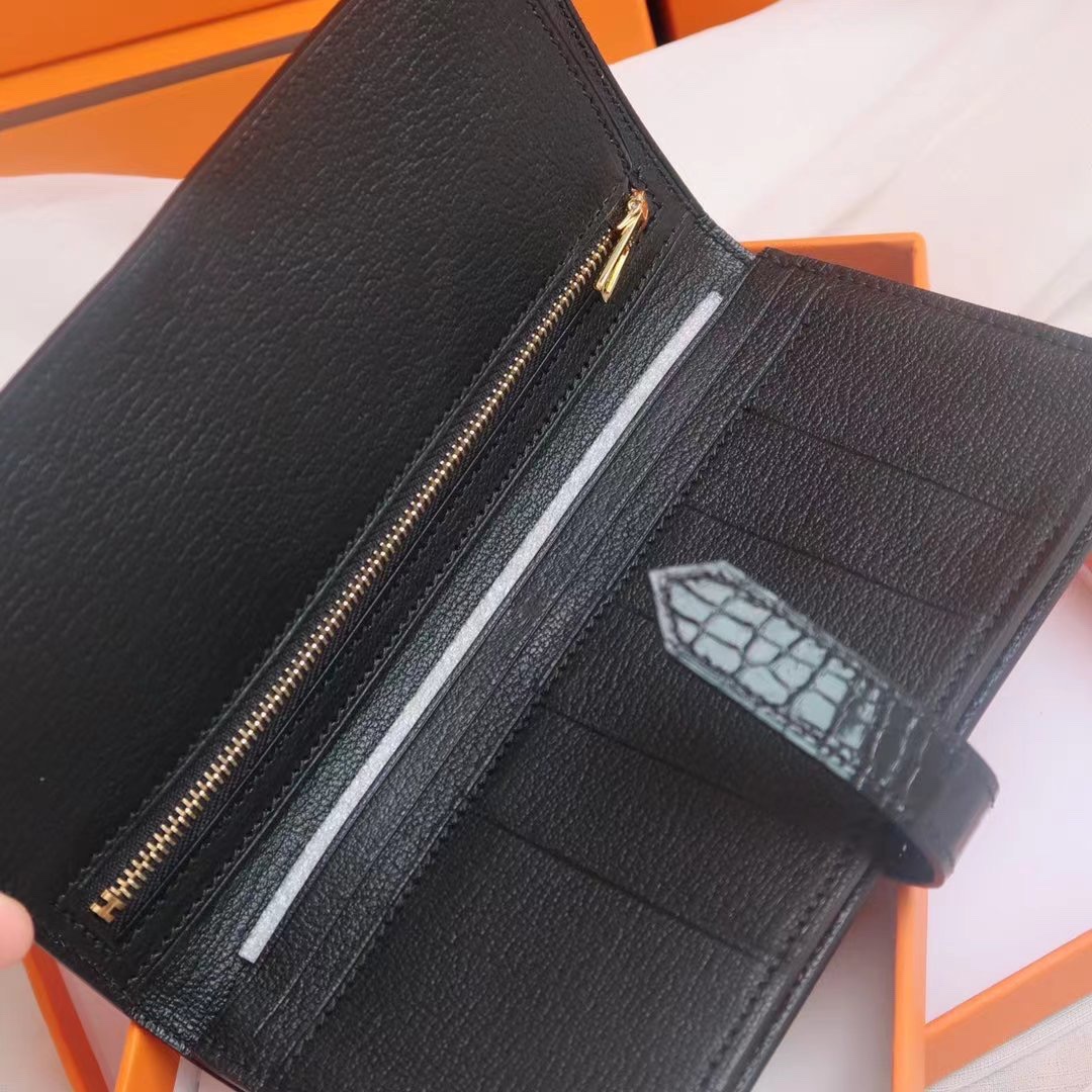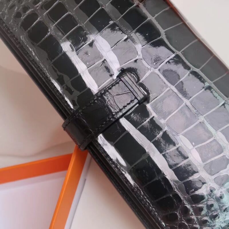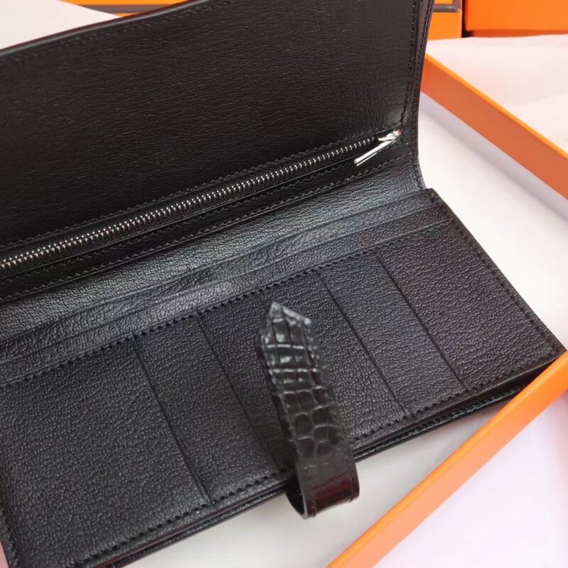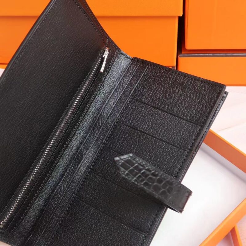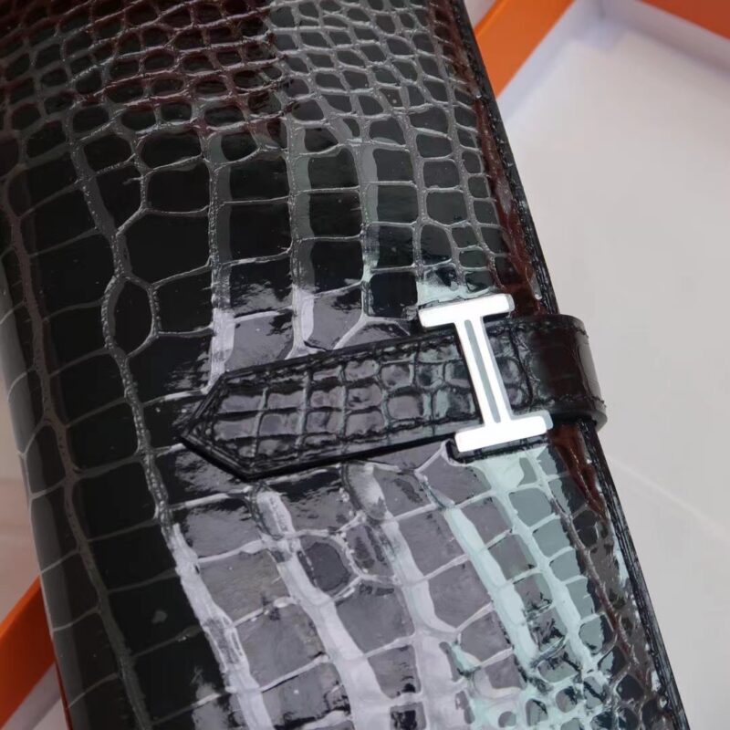 Bearn Small H Buckle Long Bi-fold Wallet American Alligator Leather. Full Hand Sewn Black Silver/gold Buckle