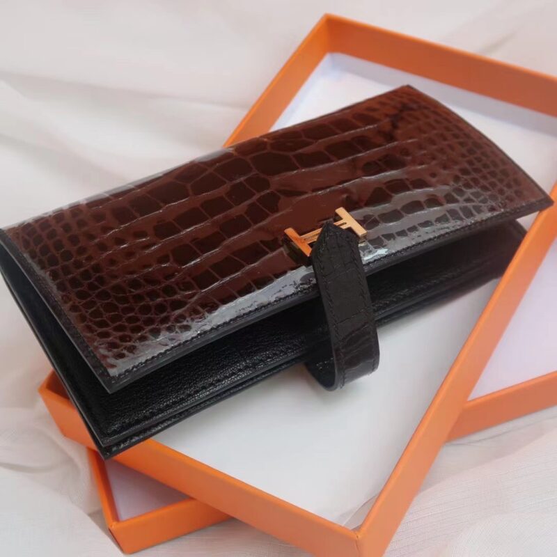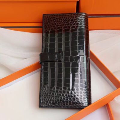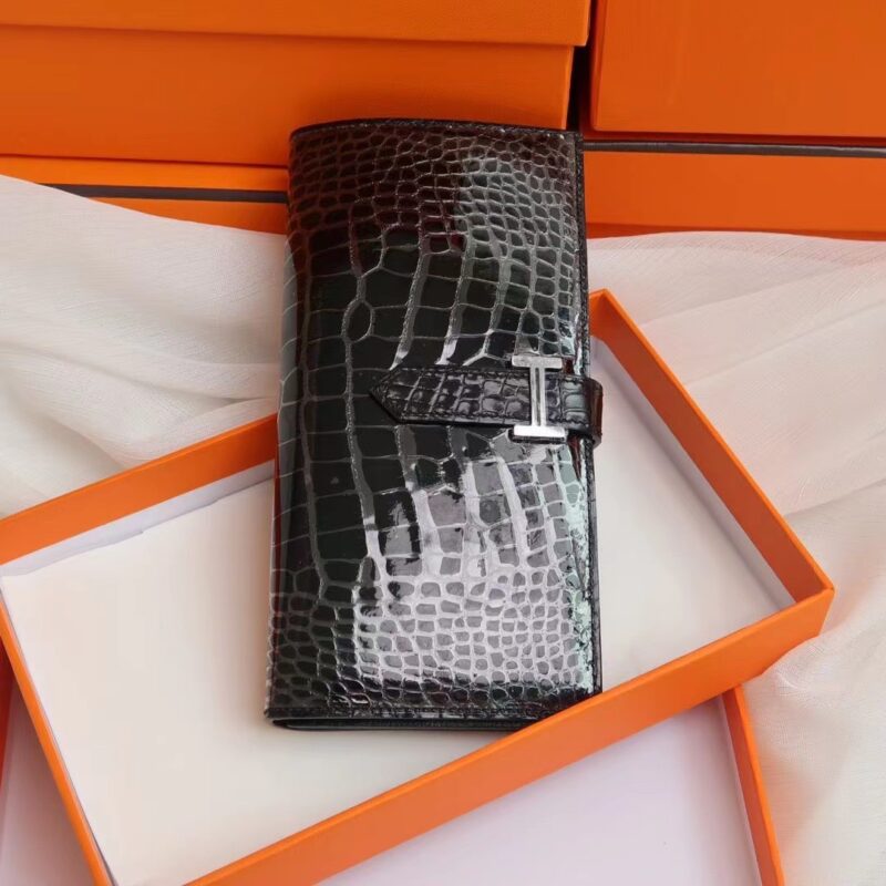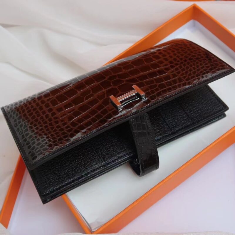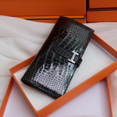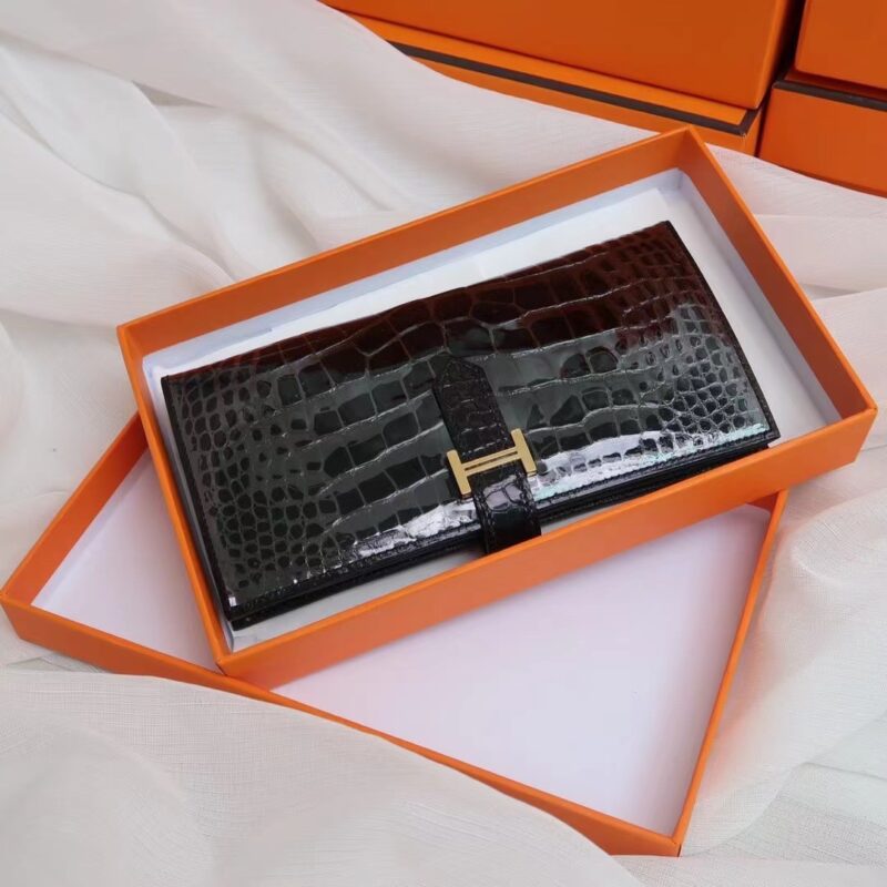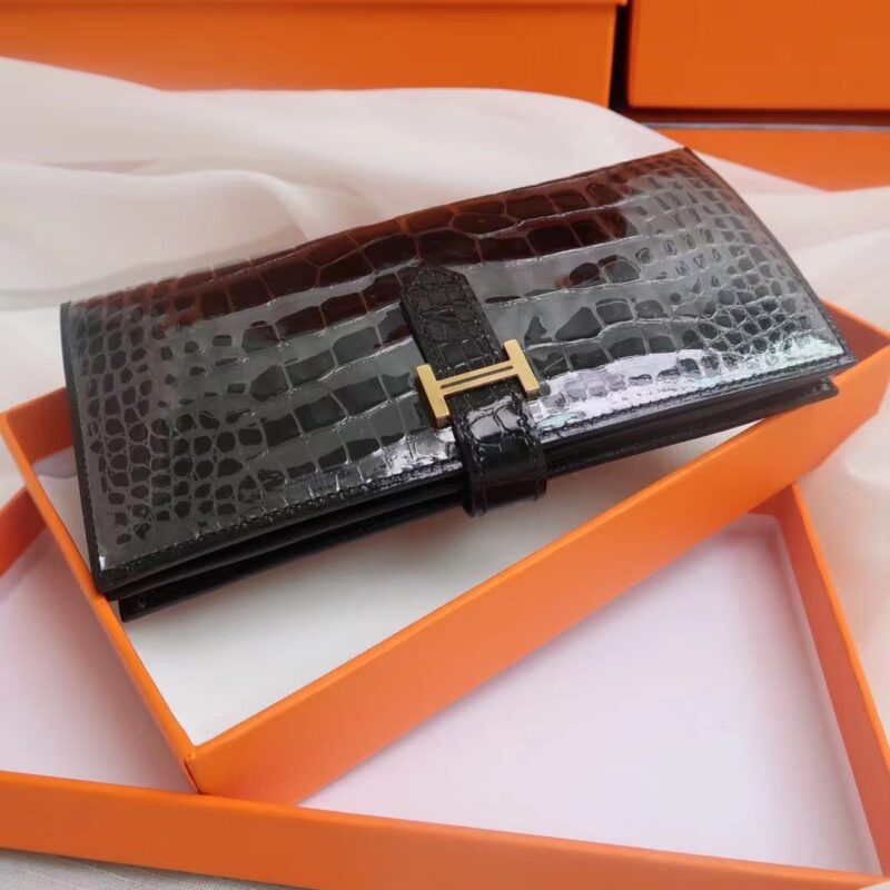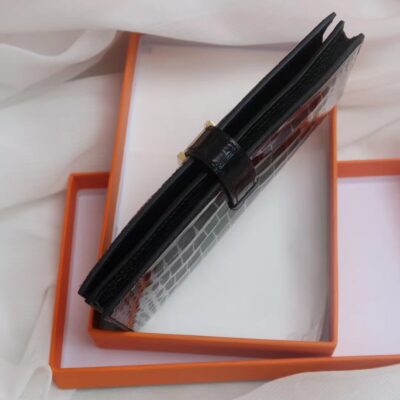 Bearn Small H Buckle Long Bi-fold Wallet American Alligator Leather. Full Hand Sewn Black Silver/gold Buckle