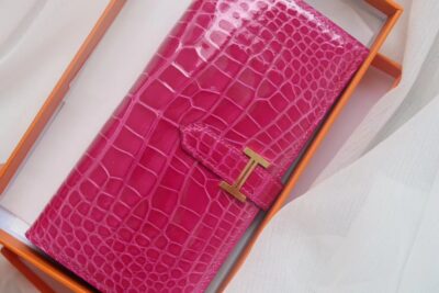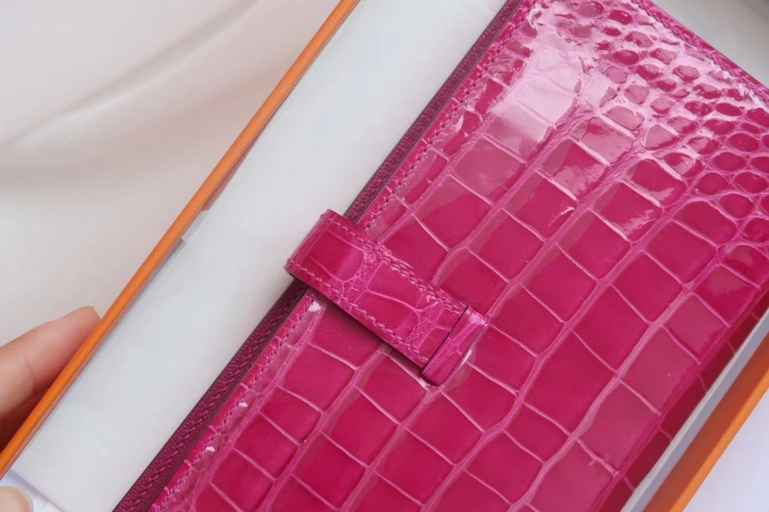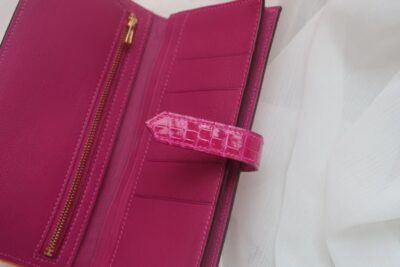 Bearn small H buckle long two-fold wallet American crocodile leather. Full hand sewing J5 Rose Tyren. Gold Buckle