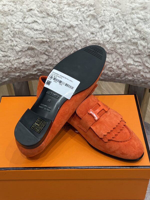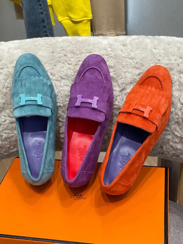 Hermes fringed loafersThe black and white leather surface is made of crystal sheepskin, with a good luster. The suede is made of sheepskin material.The inner water-dyed lambskin, the sole is imported from Italy, and the forefoot is made of injection molding rubber Sizes: 35-41