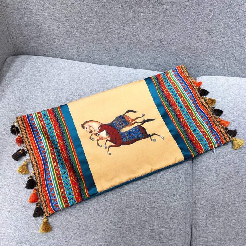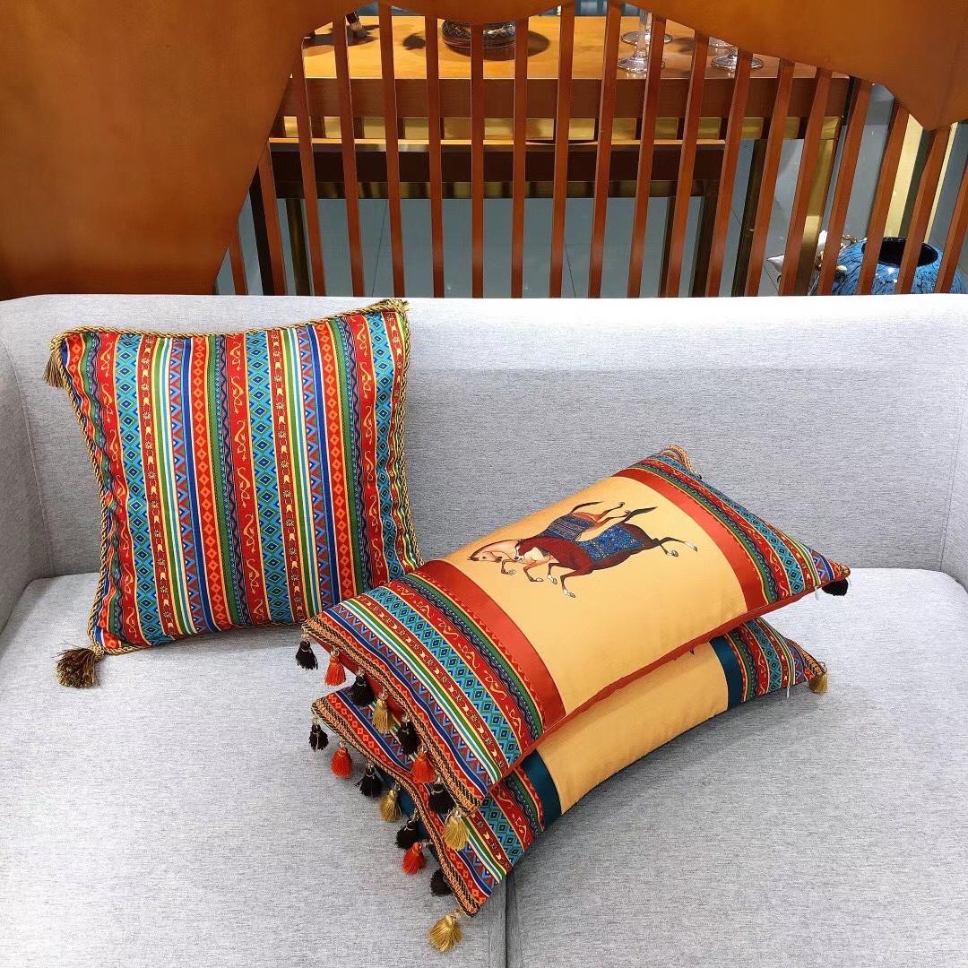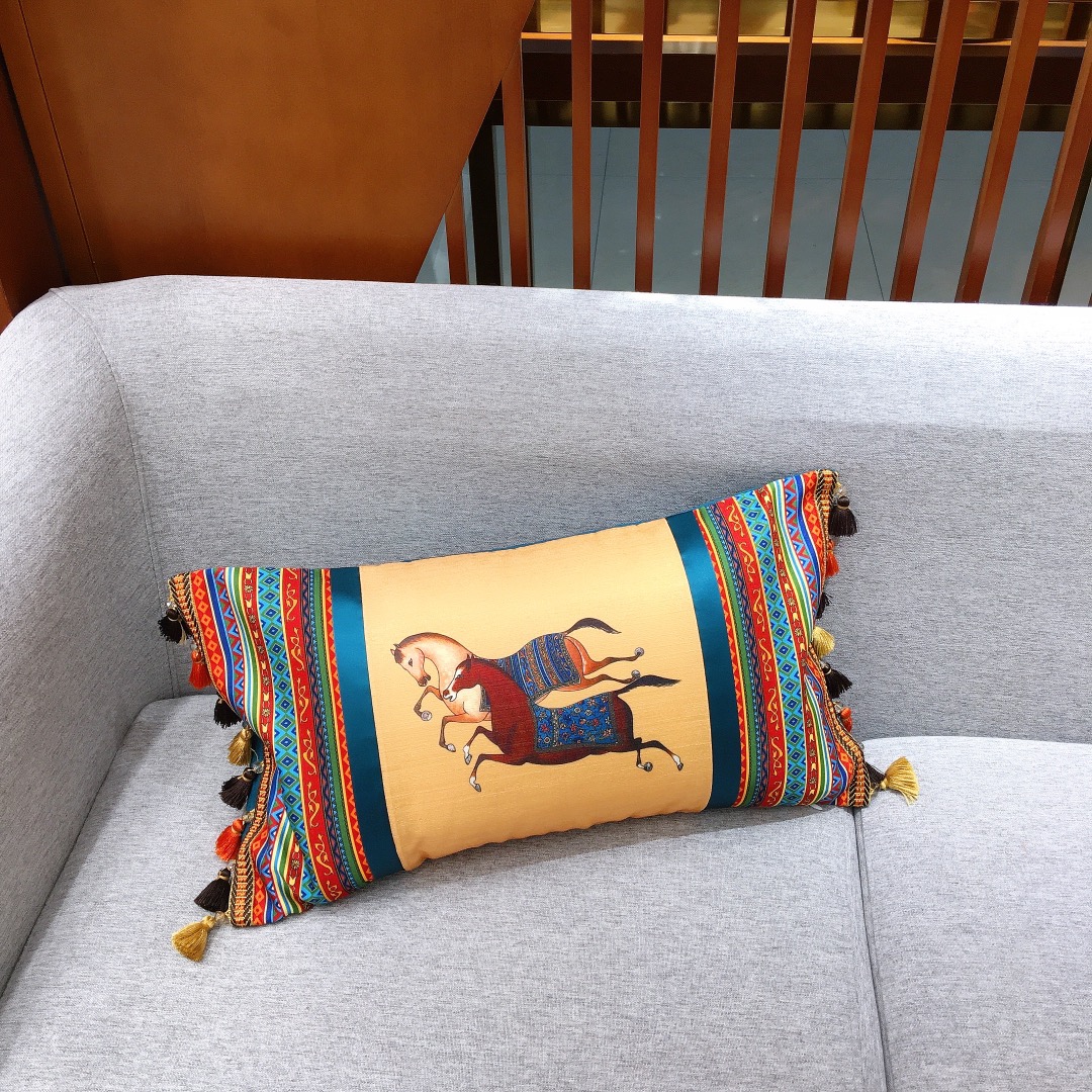 Hermes new product. Pillow Wrinkled silk satin + handmade tassel pendant double horse Size: 29*54cm