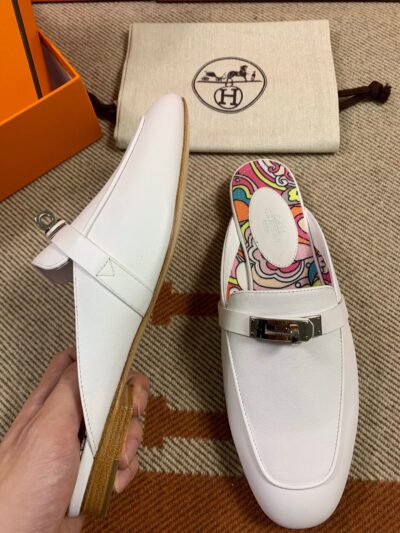 Hermes Mules in Swift White Powder (Fully Handmade)