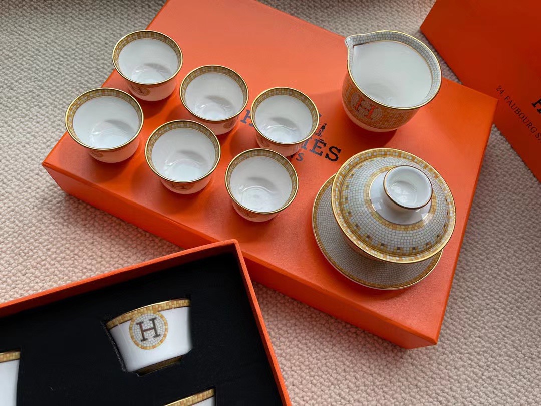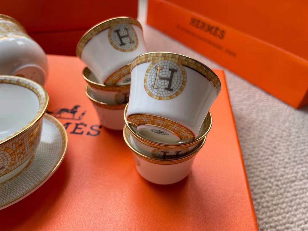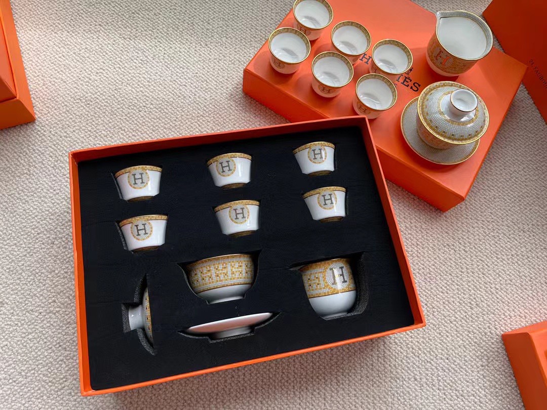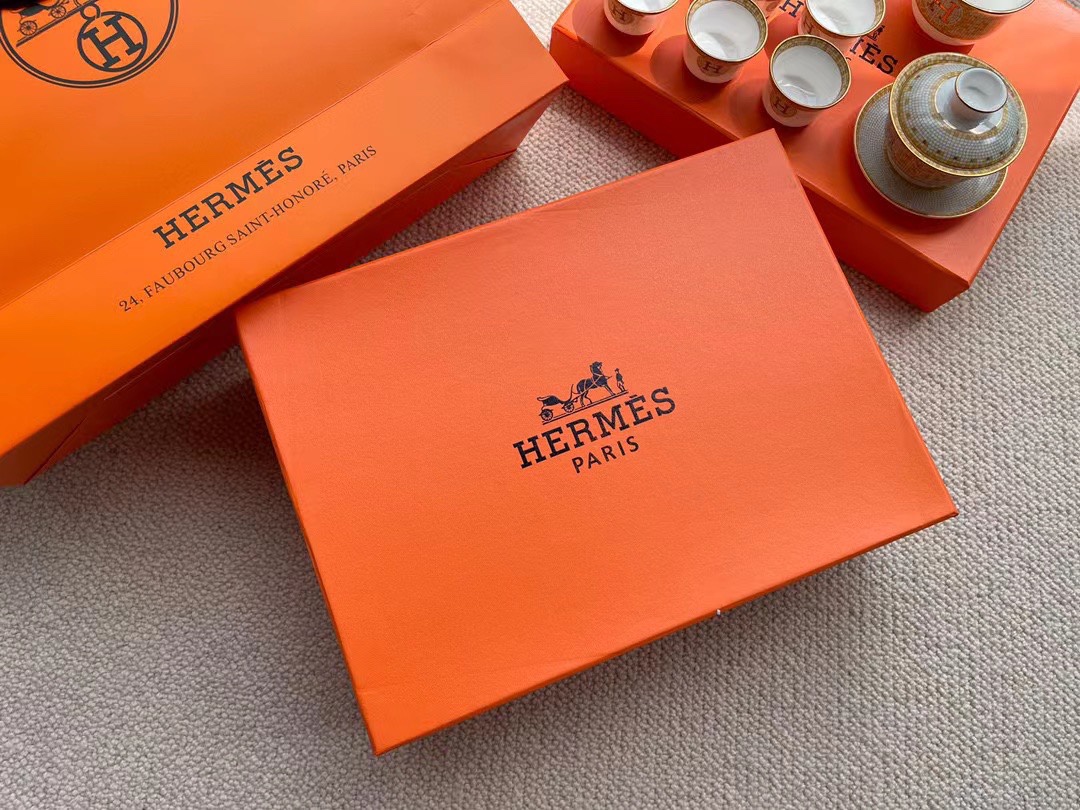 Hermes Gold Mosaic Set Exclusively for Hermès members, the bone china tea set gift box is made of high-quality bone china, and the cup mouth and pattern are made of real gold. A set includes: tea bowls and saucers, justice cups, 6 tea cups.