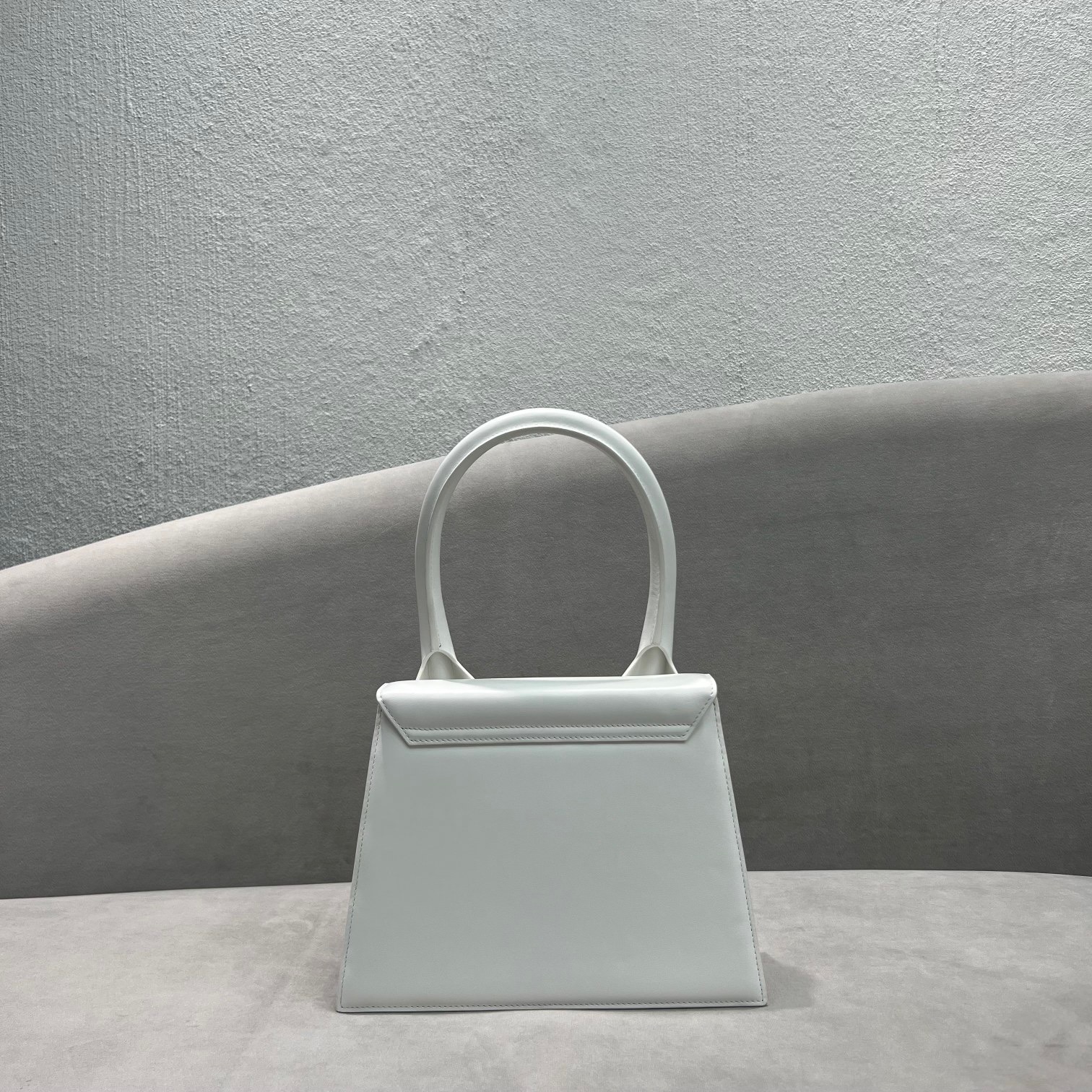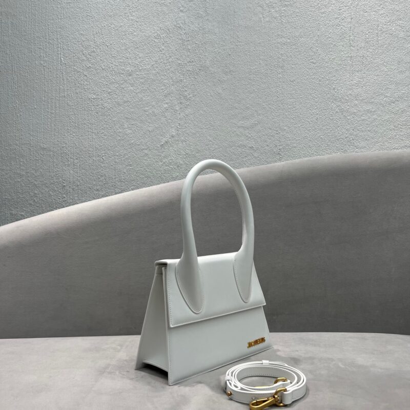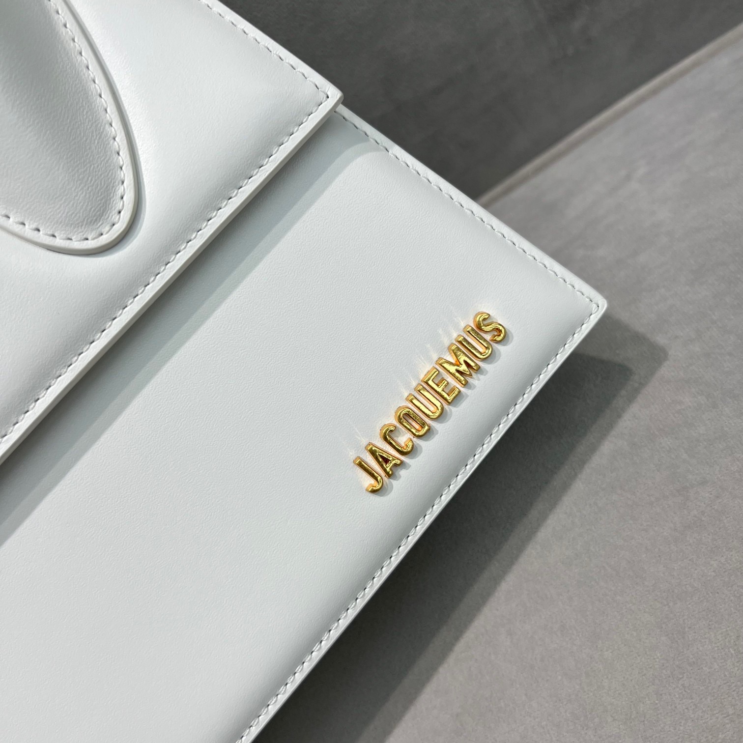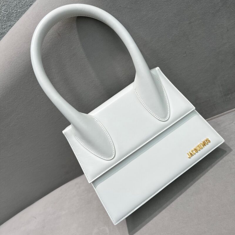 Large white Jacquemus—one of the hottest bags Known as the most popular retro handbag, with its stiff body, high-purity colors, and the eye-catching golden LOGO on the bag. 2020: 24x18x10cm