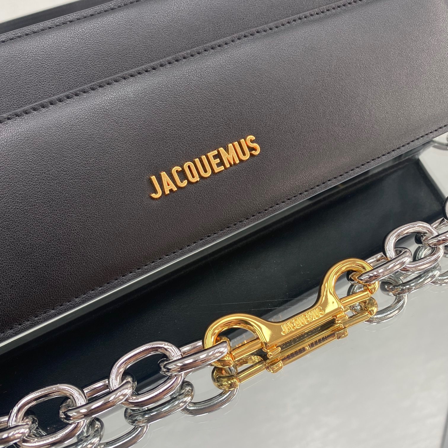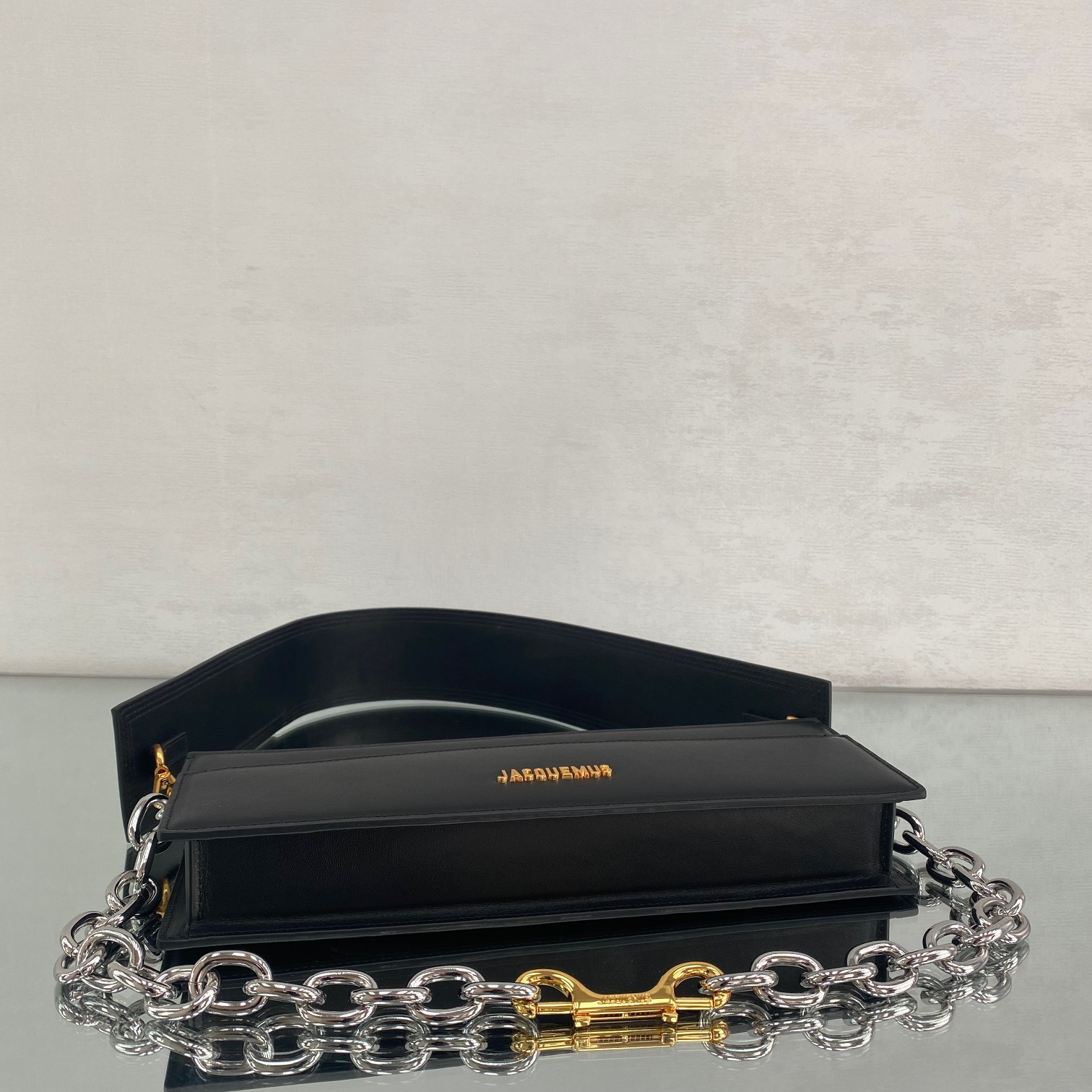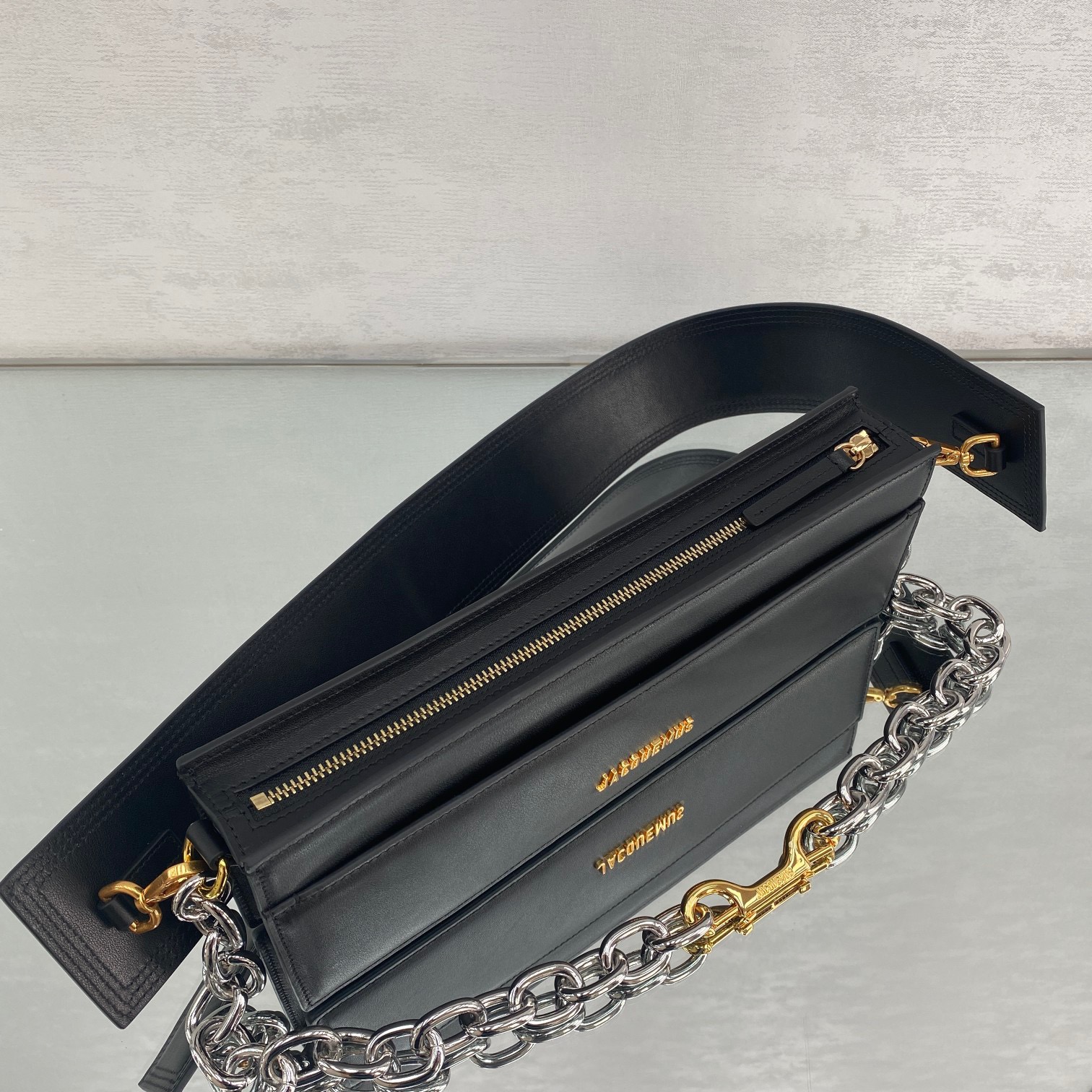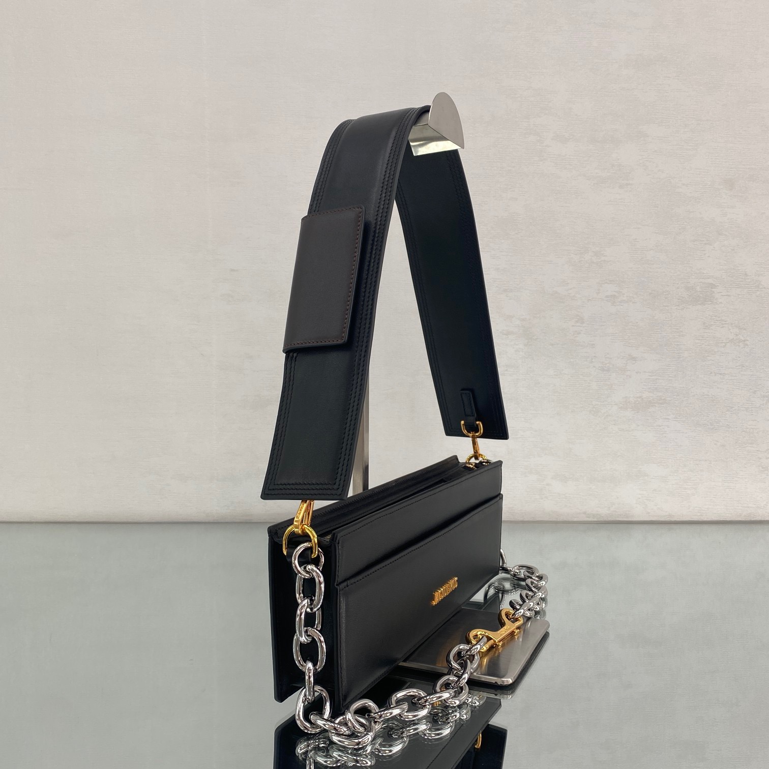 Full Leather Black Jacquemu Le Sac Ciuciu series chain crossbody/ hand bag Using polished leather, detachable chain link shoulder strap, lobster clasp and spring ring buckle closure, with its rigid body, high-purity color, and eye-catching golden LOGO on the package. One of the world’s best “belts” “Queen of goods” are all carrying the key to showing the French casual style. Style number 2043 Size section 30x height 11×4.5cm