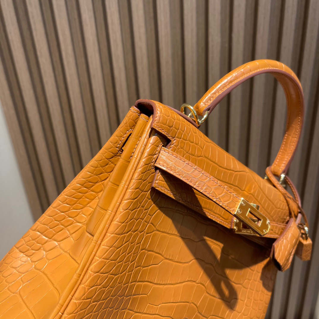 Kelly 25cm Alligator Alligator Matte leather. 37 Gold Brown. Gold Buckle
