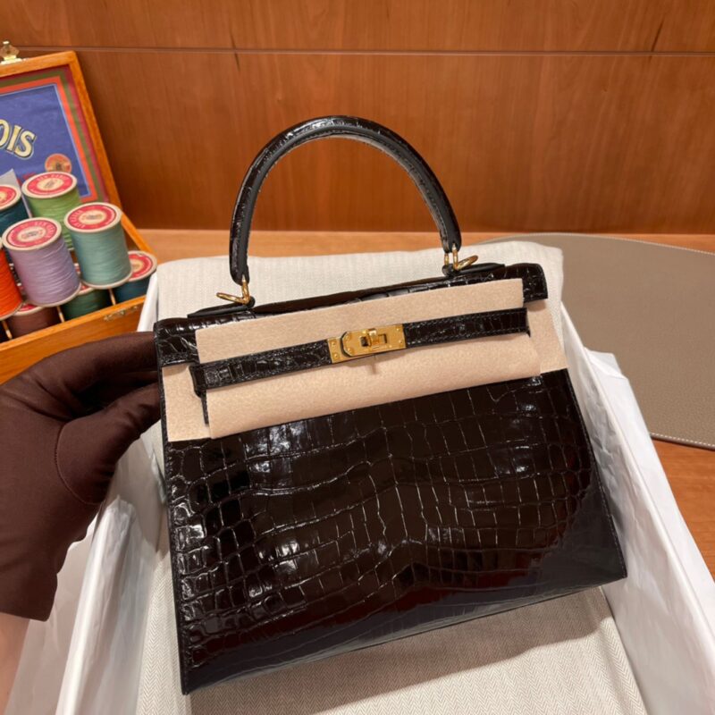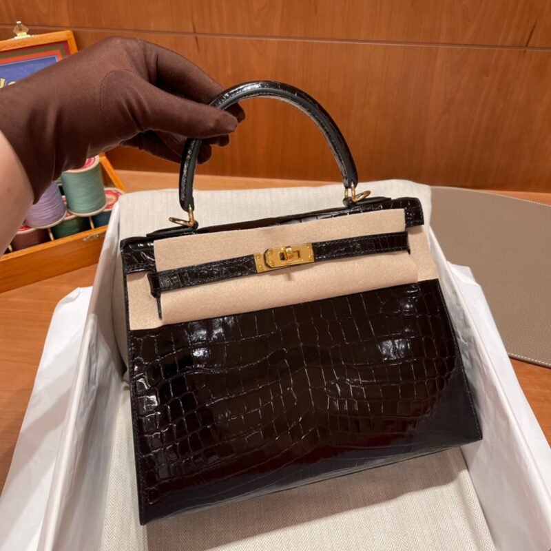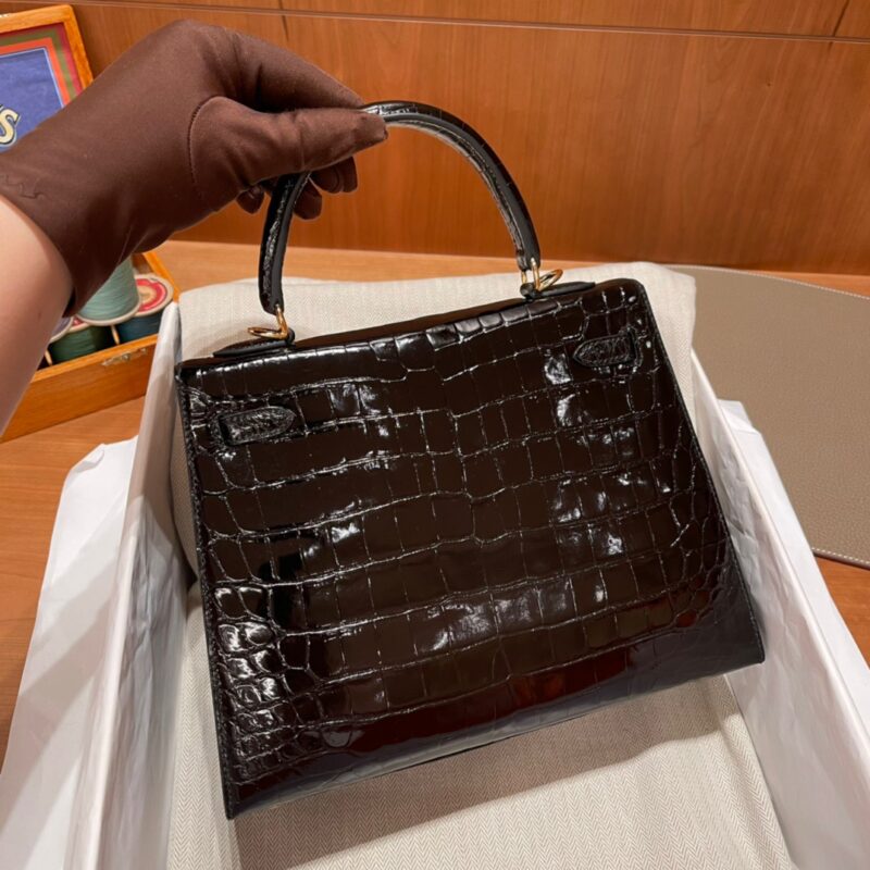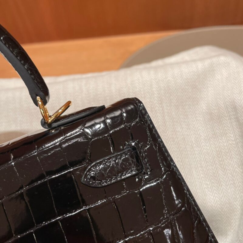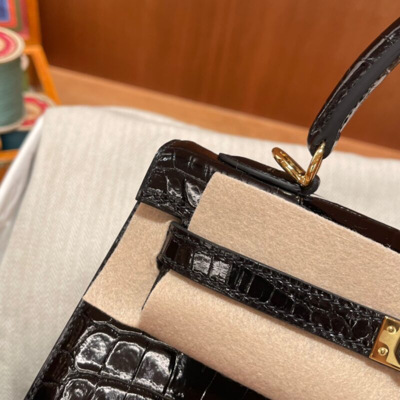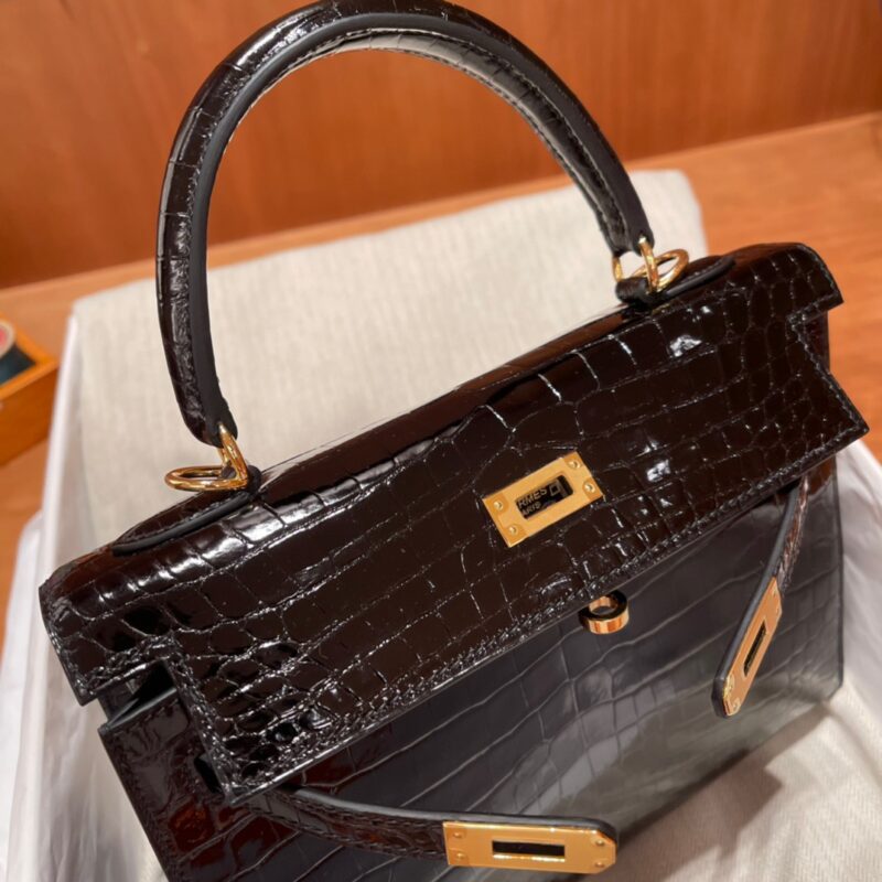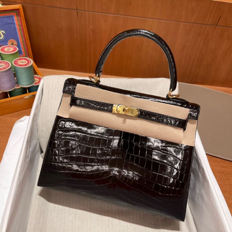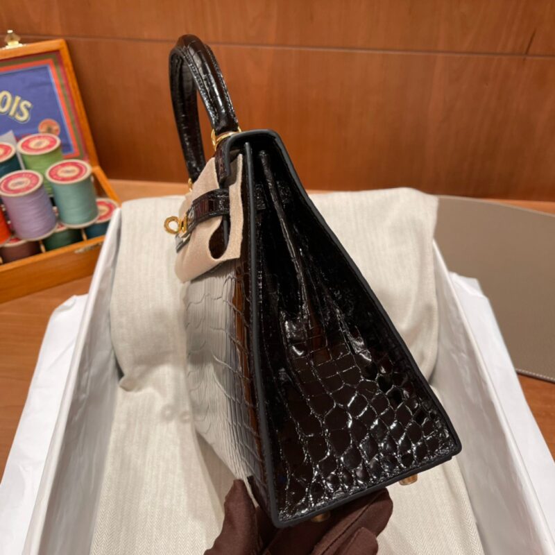 Kelly 25cmNile Crocodile Shiny. Black. Gold Buckle