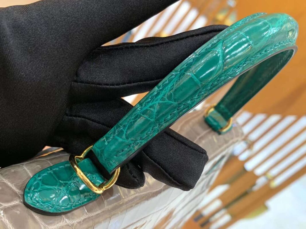 KL 25cm Elephant Grey with Emerald Green First-class Nile Crocodile leather. Gold Buckle. Imported materials. Fully Hand-sewn by beeswax threads.