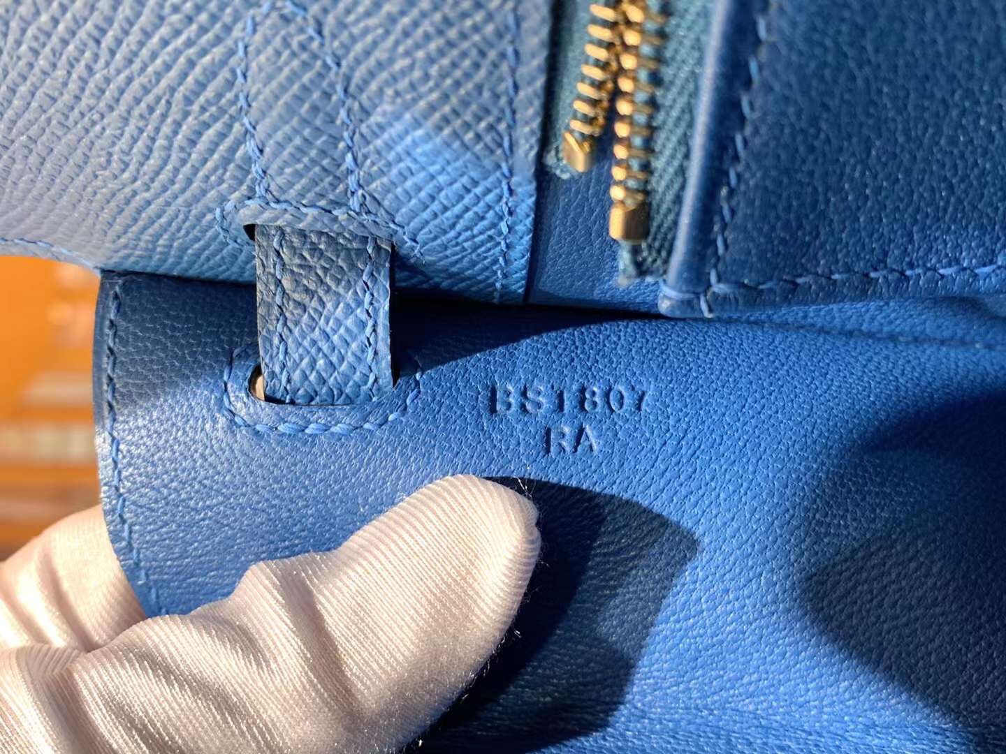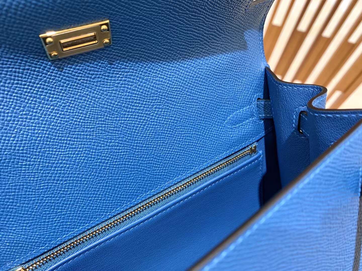 Kelly 25cm Epsom leather Tanzania blue gold buckle. All bags are made of imported materials and fully sewn by hand with beeswax threads. They are decorated with silver and 24k gold plated hardwares. All of them come with complete accessories (box, dust bag, etc). Any kind of leather, colour, size and hardware can be customised.
