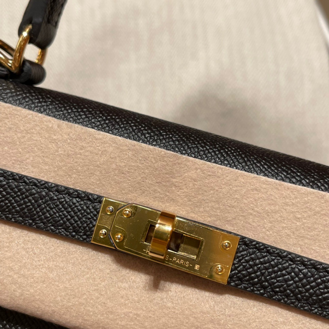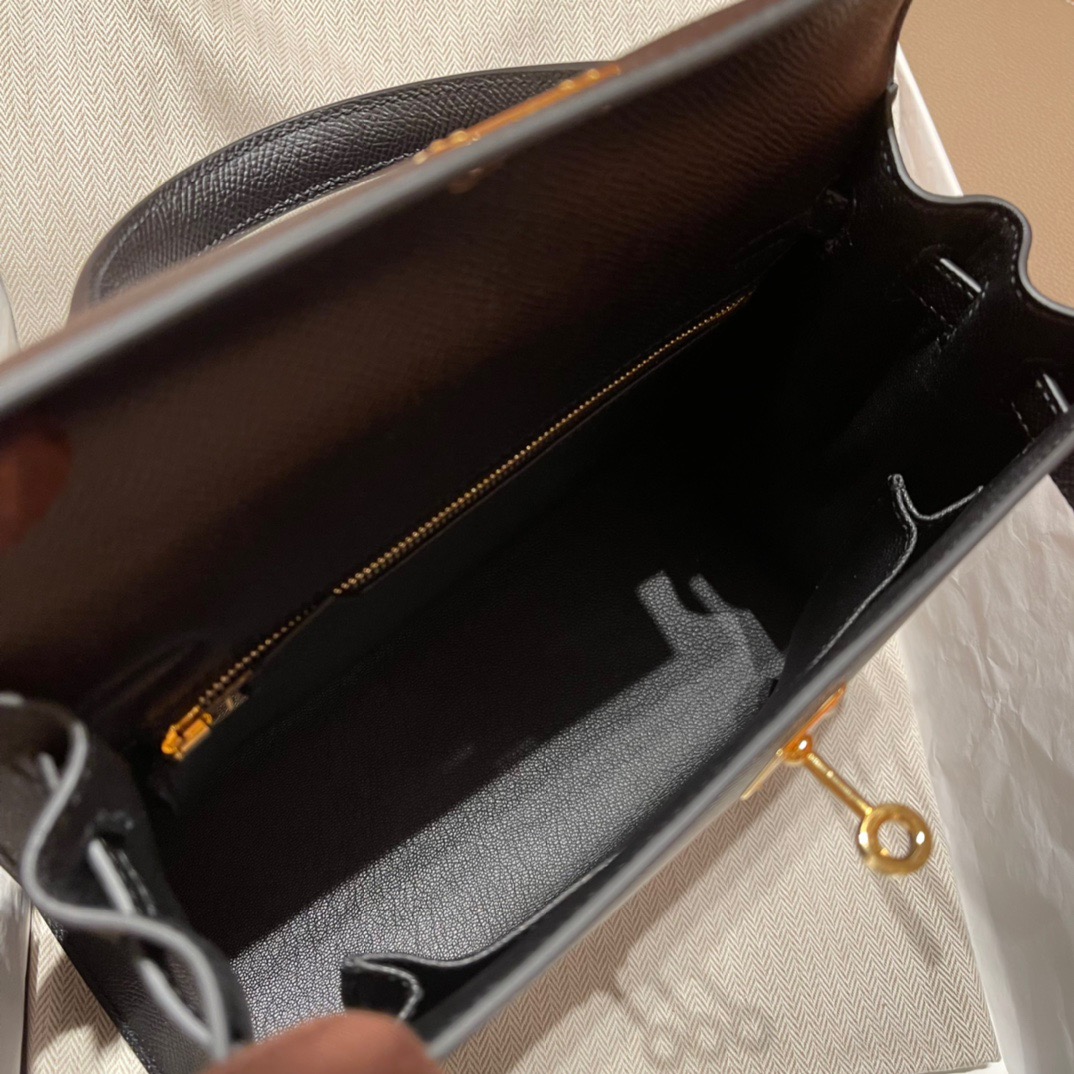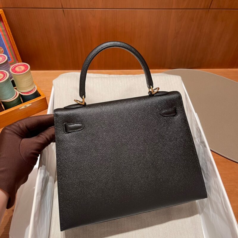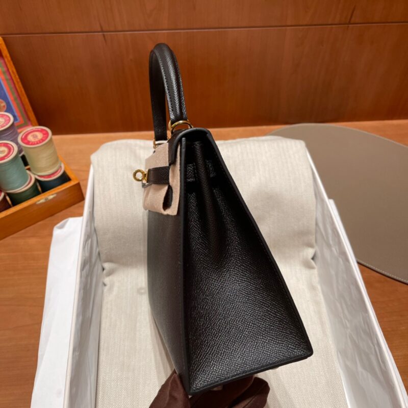 Kelly 25cm Epsom 89 Black (Noir). Gold Buckle