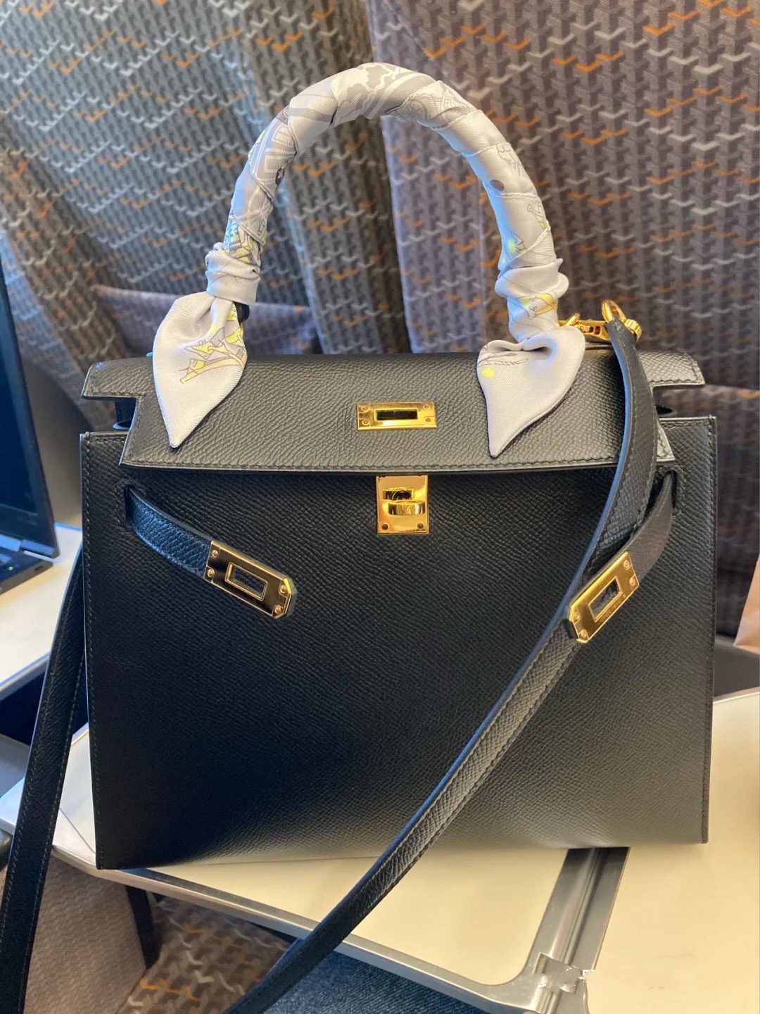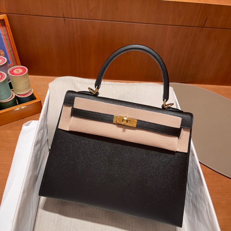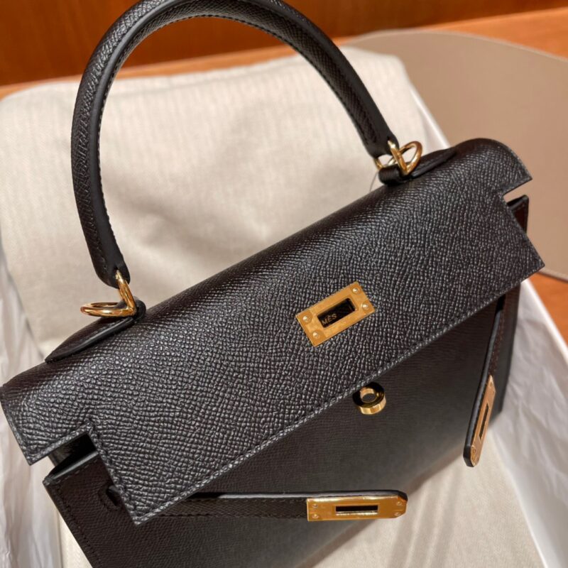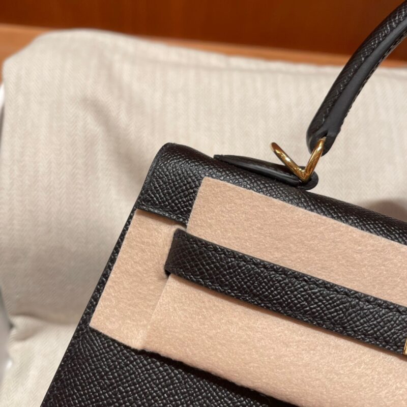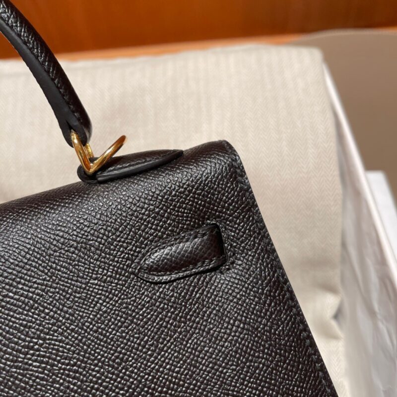 Kelly 25cm Epsom 89 Black (Noir). Gold Buckle