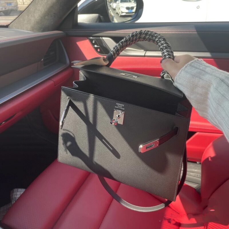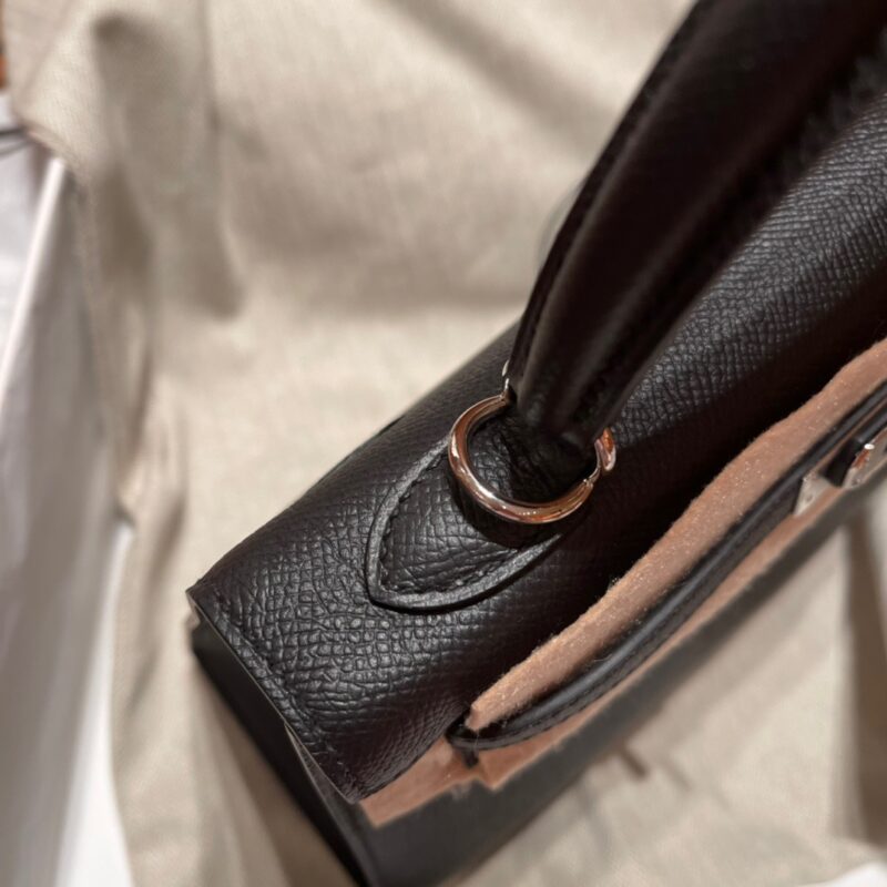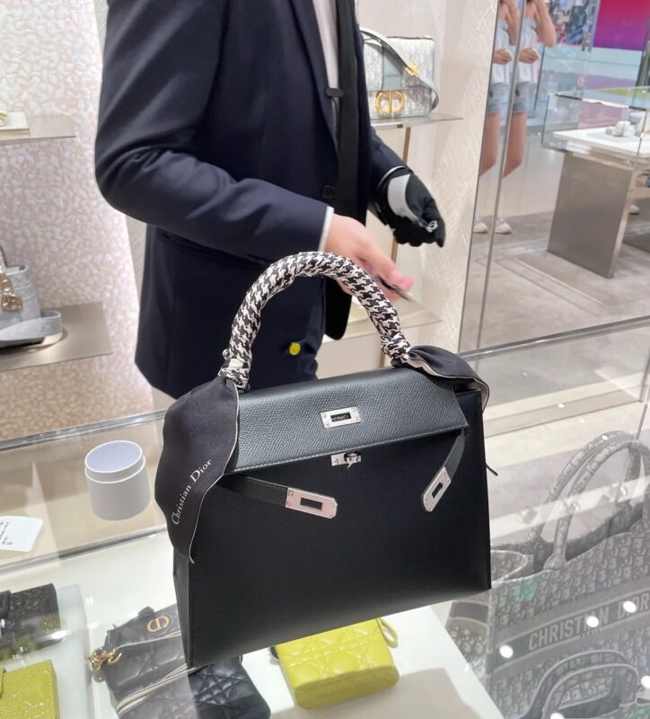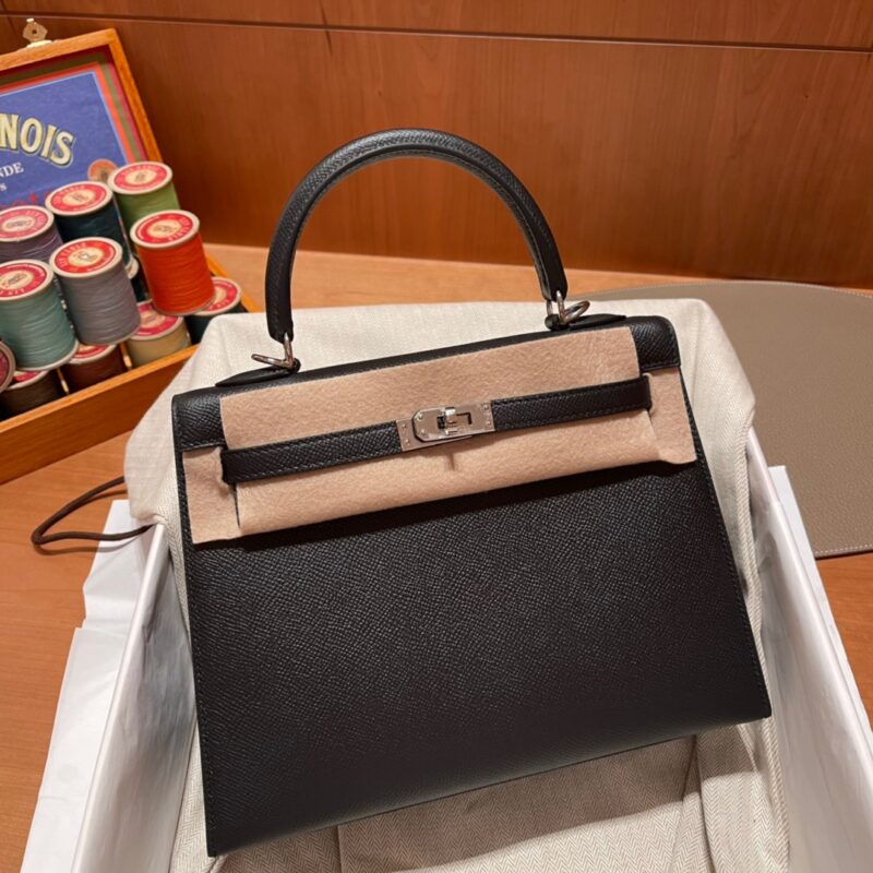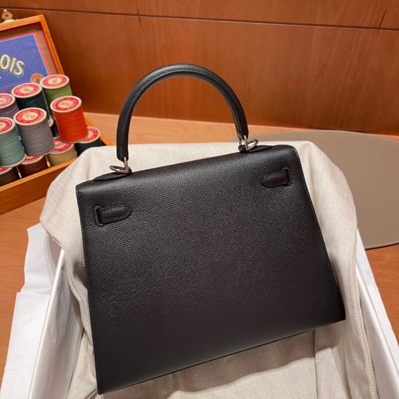 Kelly 25cm Epsom 89 Black (Noir). Silver Buckle